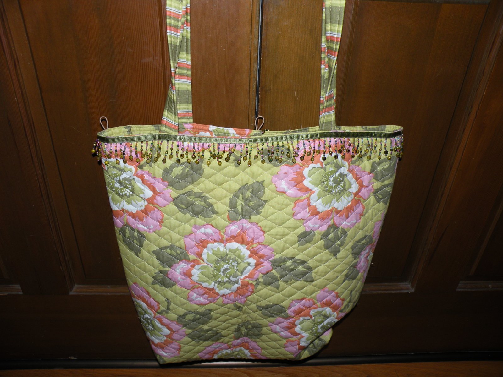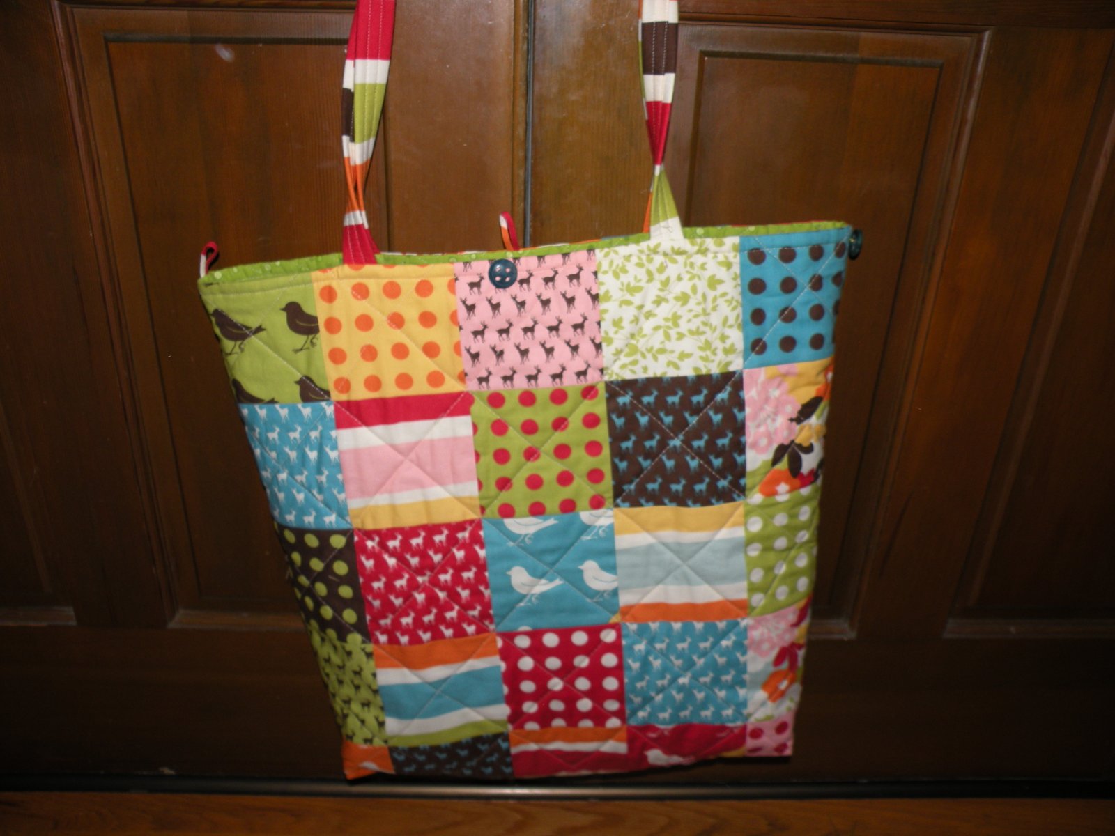 Here are two more of Helen's bags, these aren't as big as the one pictured above, but adorable none-the-less. The bag on the left was made with a charm pack! The bag on the right was made with pre-quilted fabric - clever, no?