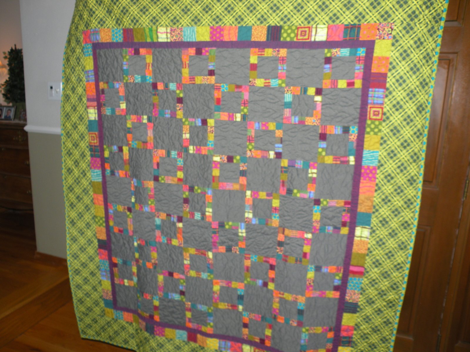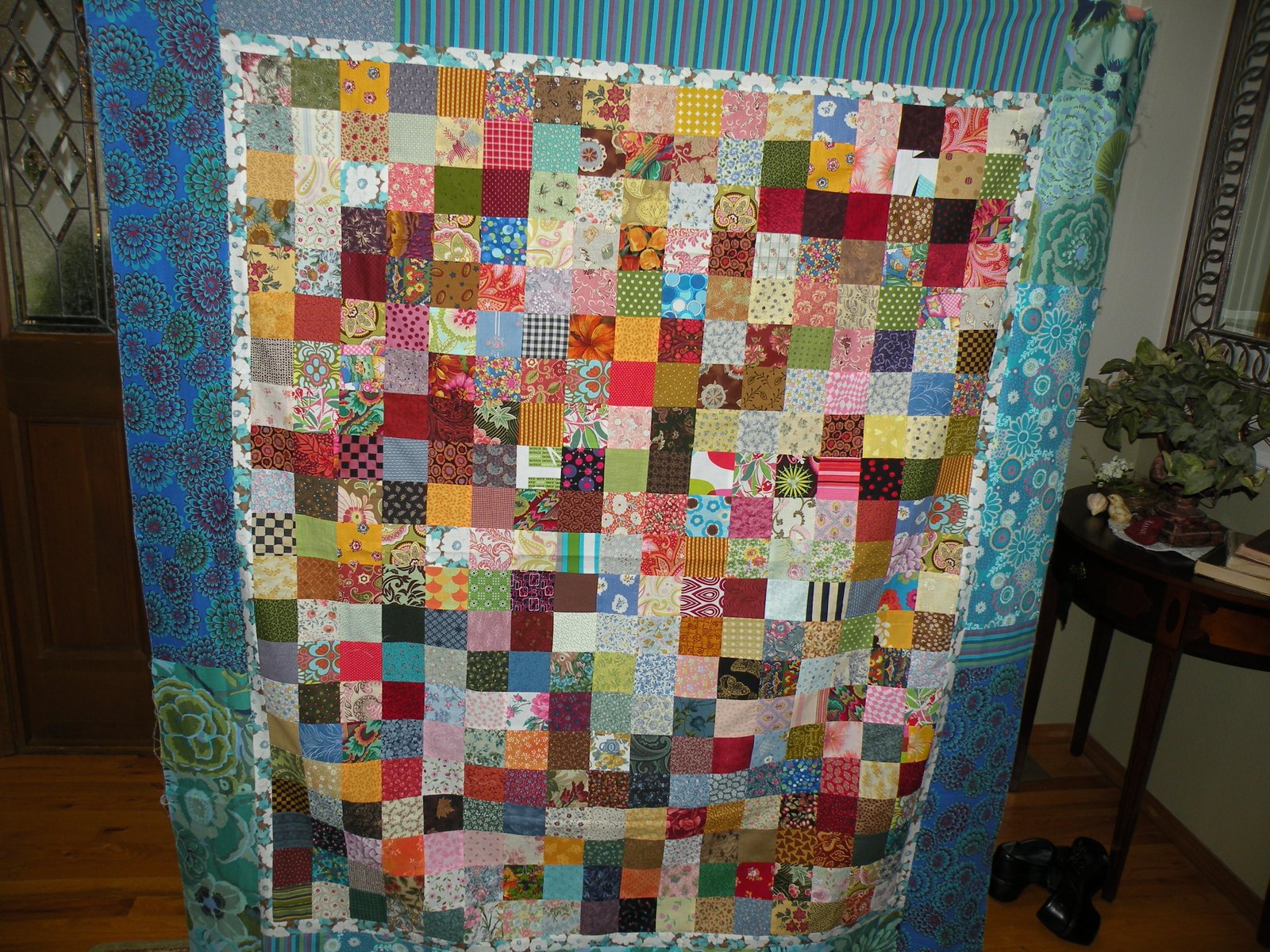 If I'm not mistaken, this quilt was made from "ugly fabrics." Not my words!! All scrappy squares pieced together into one fabulous quilt - and check out her borders, they are great! I love this quilt - scrappy "speaks" to me, too!