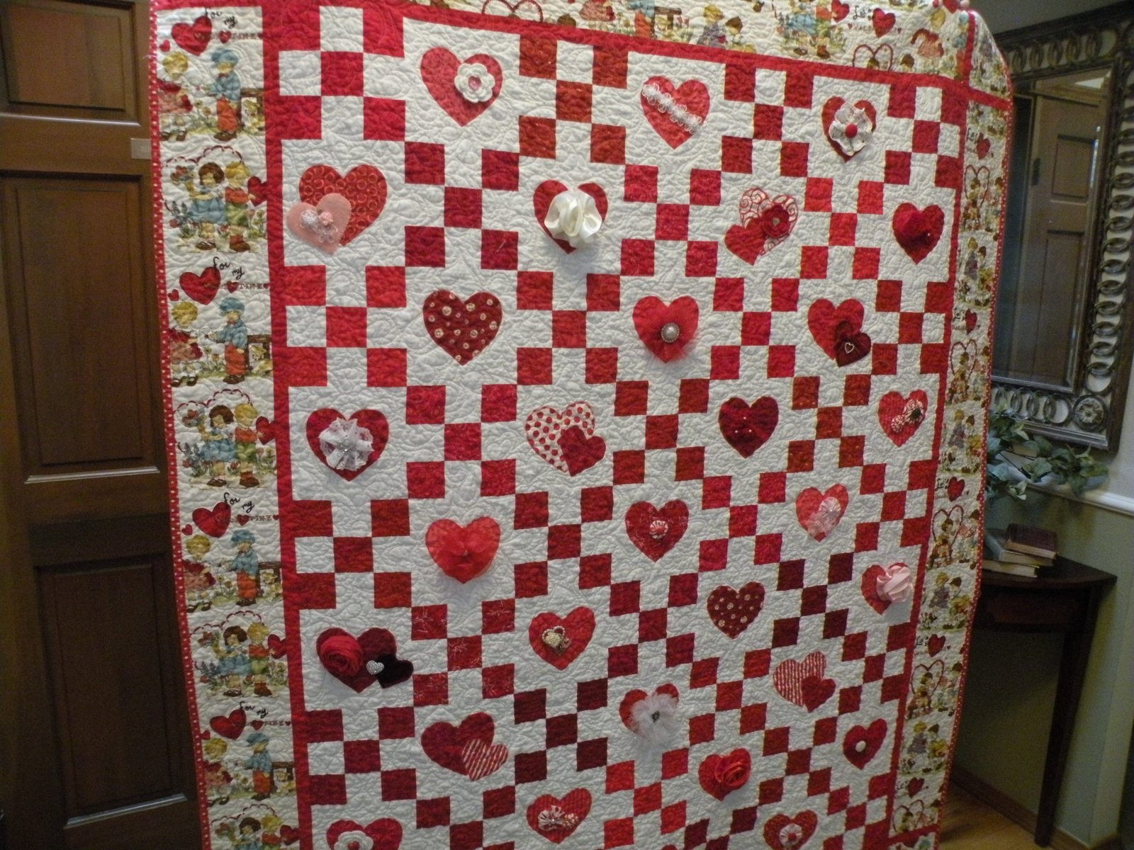 Terry is so busy with her machine-quilting business (Stitchophrenic - email her for a quote: tlht12525@aol.com - she does incredible work!) that I don't know when she finds the time to quilt for herself! But she does!! She made this sweet Valentine quilt, which takes care of her "group project", as this answers the theme question of "Where the Heart Is!" After piecing this quilt she decided to embellish it - it's very fun! She's got pom-poms, yo-yos, buttons and bows - very, very girly!