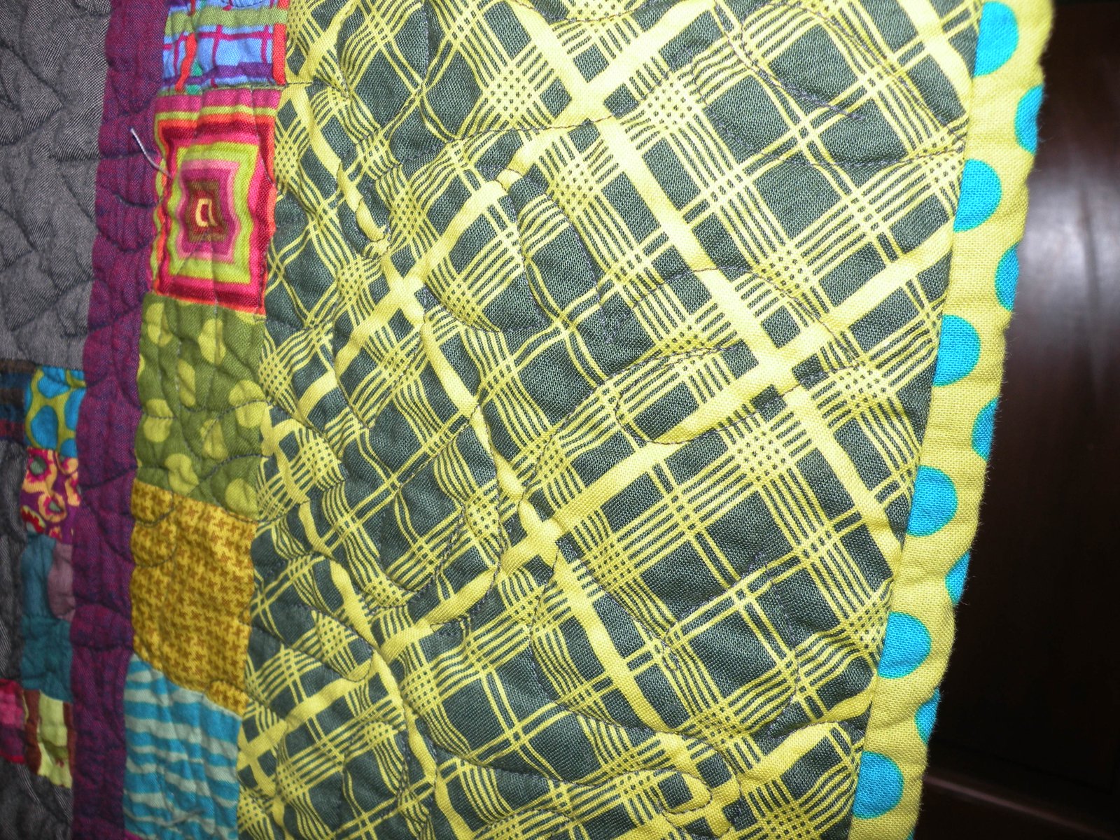 Here's a close-up of the border, binding and the backing fabric. Now tell me, would you ever pick those fabrics? I am always in such a "quilting rut" that I wouldn't, but in my next life, when I'm no longer in a rut, I will!!