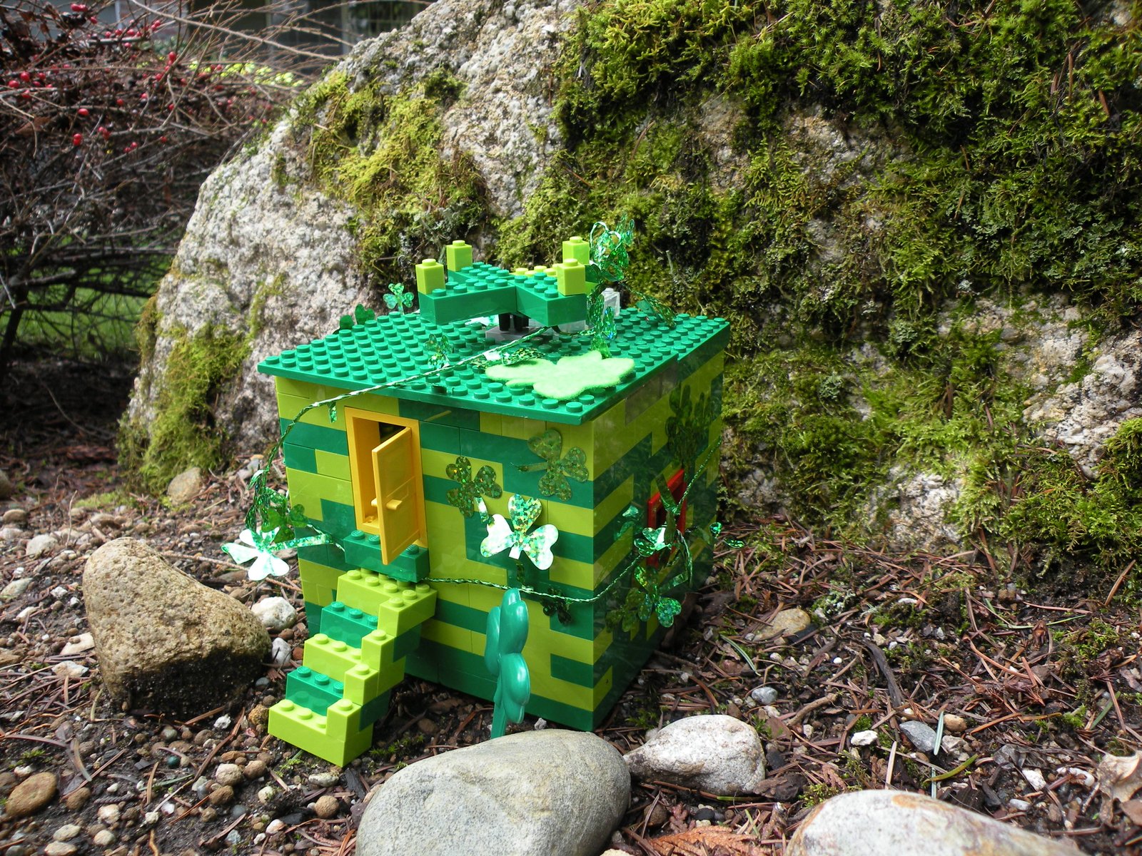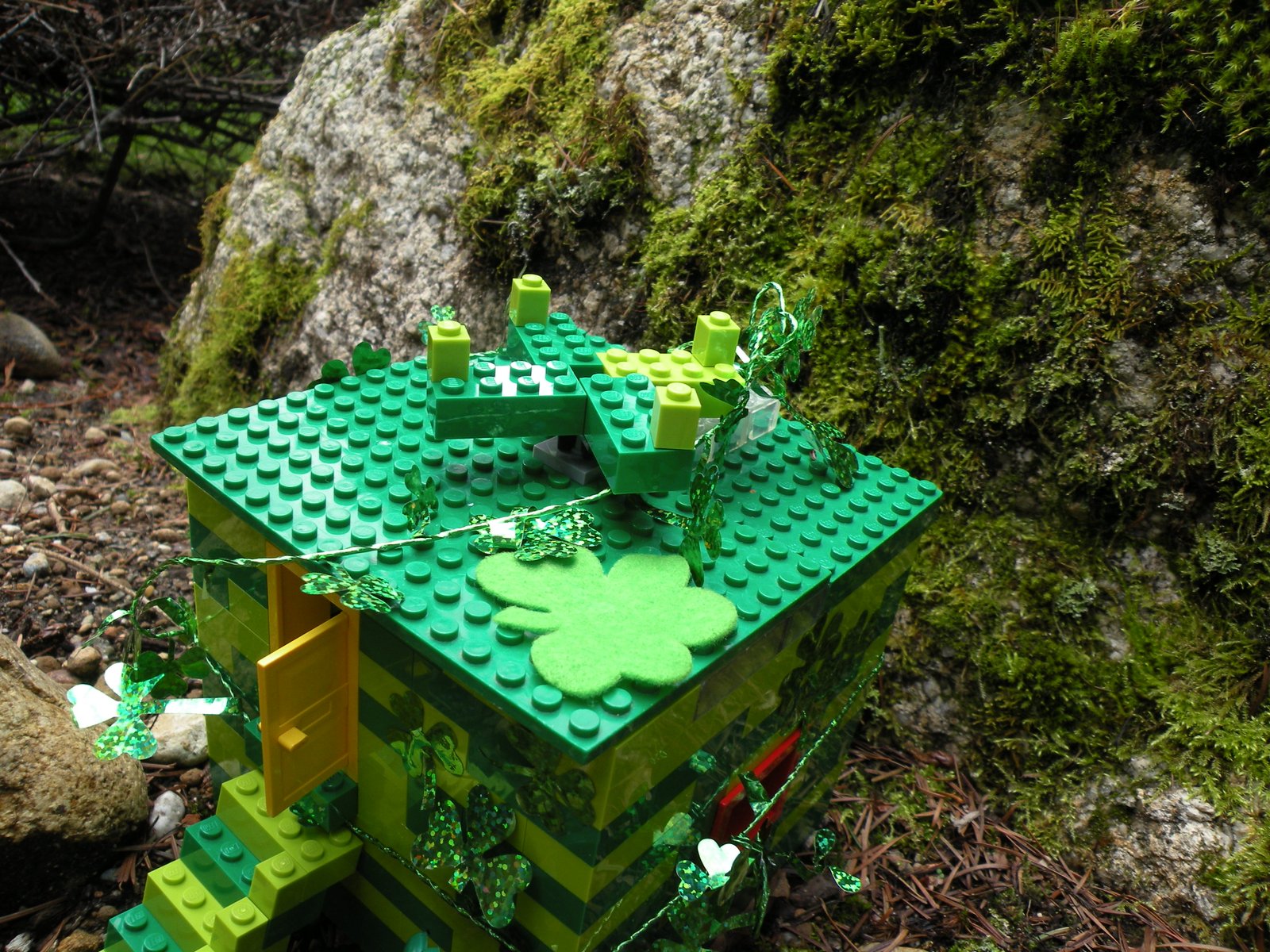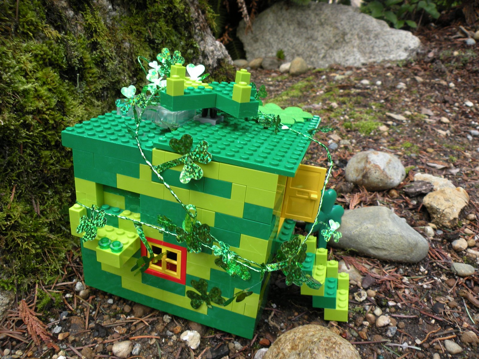 As you can see, there are steps leading up to a yellow door...where the Leprechaun will head...but once inside he will lose his balance and fall into the black cauldron filled with plastic gold coins (not pictured as I forgot to take a pic before I put the roof on)...the fake coins will lull the Leprechaun into thinking all is well...which will give Max just enough time to seal the door shut! Leprechauns, once caught, have to take their captor to the end of the rainbow to their pot of gold, which they pay their captor for their freedom...oh the fun Max and I will have shopping at the Lego Store with all that gold!!