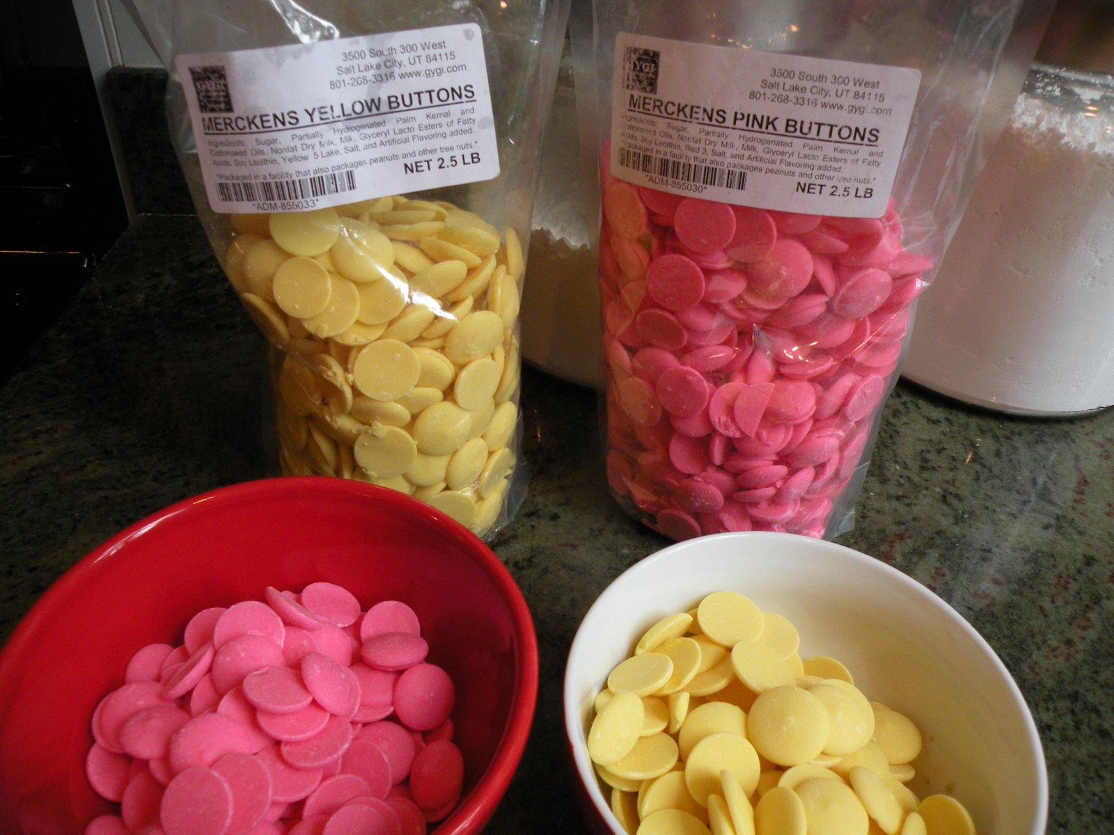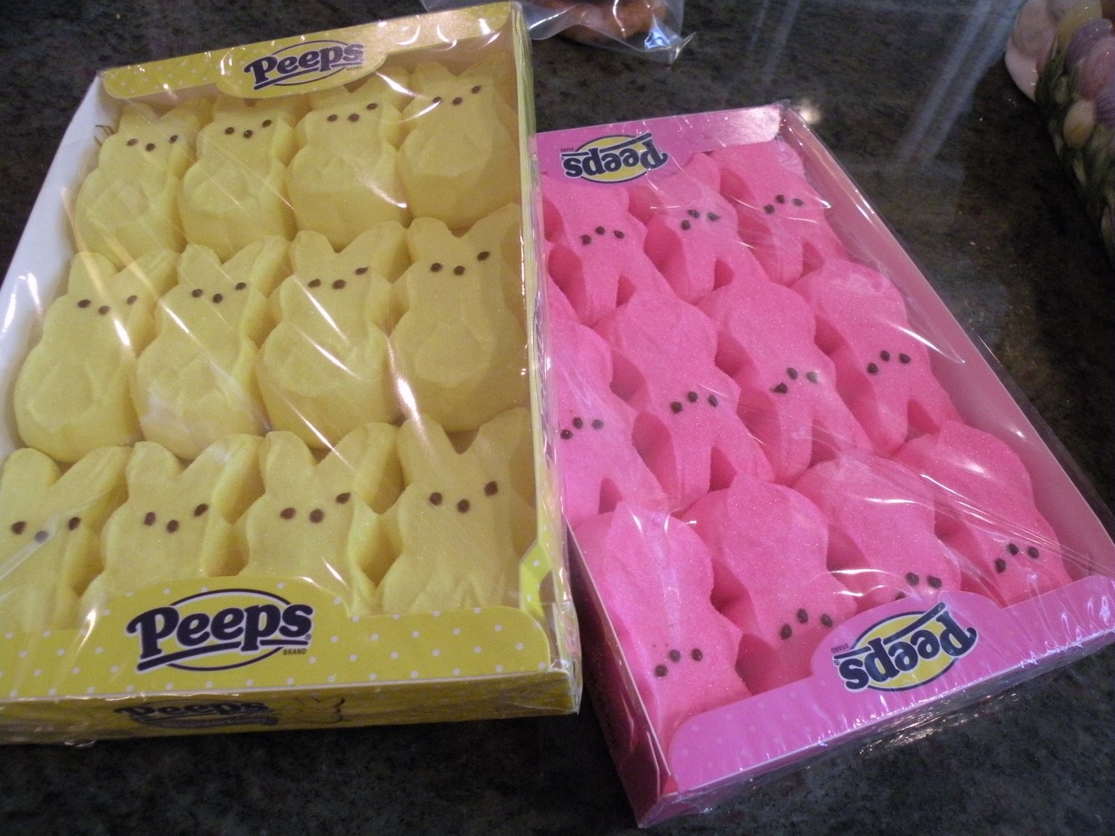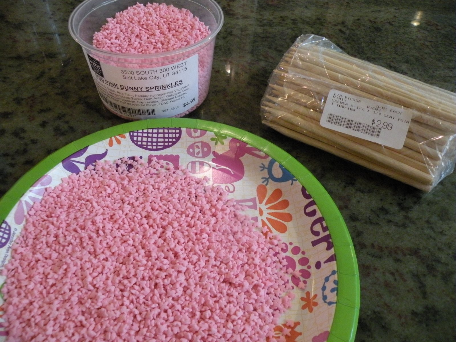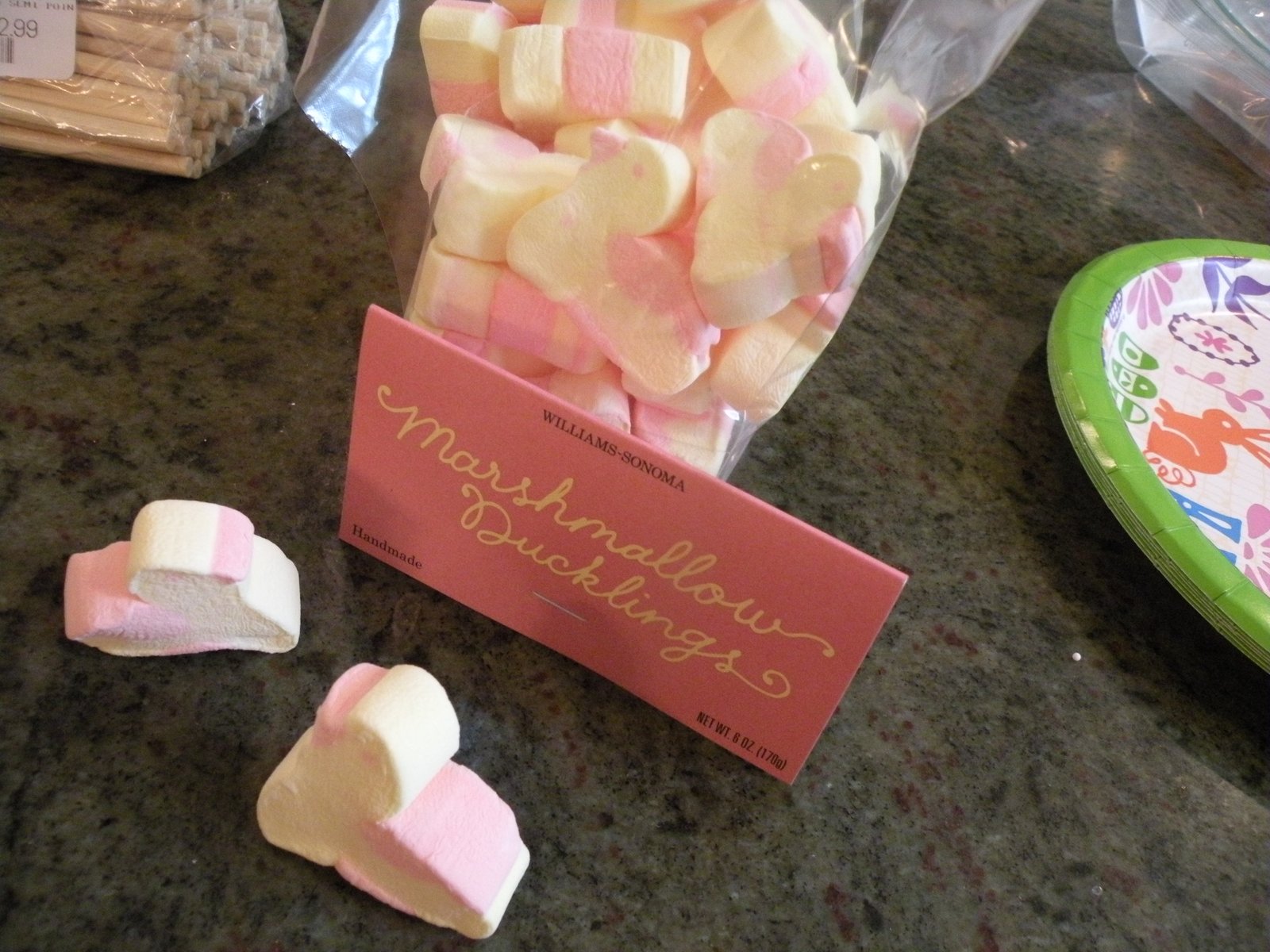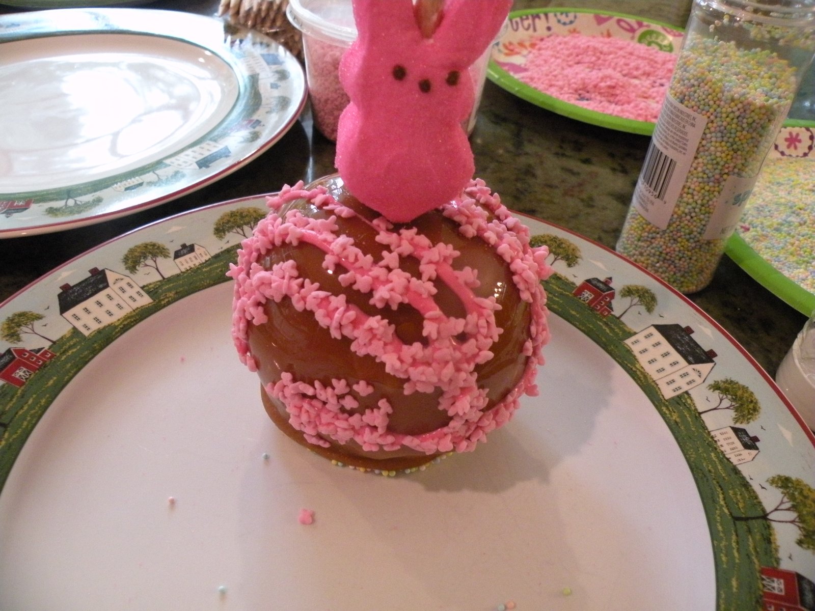 Pink and yellow chocolate melts, pink "bunny" sprinkles, marshmallow ducks and Peeps - that's what we had to work with - oh and some multi-colored pastel sprinkles for the bottom of the apples.