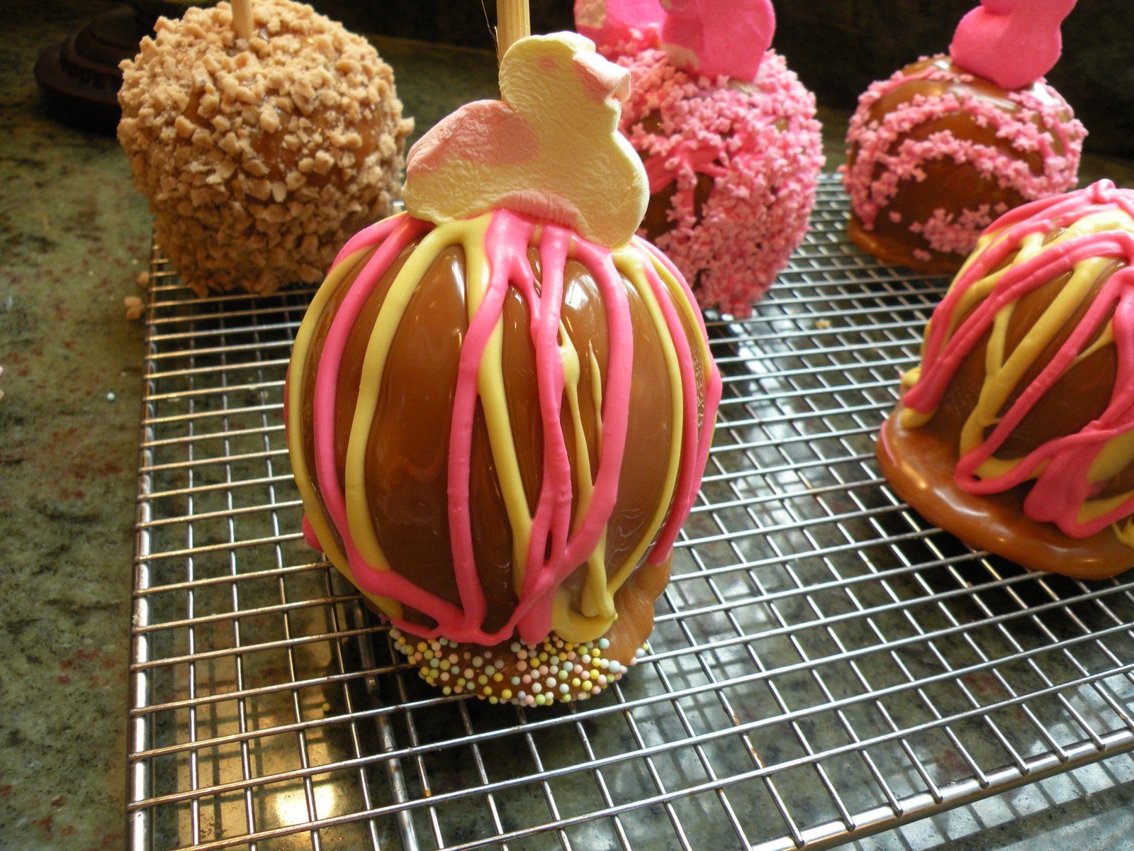 Caramel Apples are usually just a Fall treat around here...but I decided to break with tradition and make them an Easter/Spring treat as well! I invited the young girls from church to come dip apples with me - we had a great time...and regrettably I didn't get pictures of their apples - but they were really, really cute! After they left I dipped some more...dipping is easy, decorating was a bit more challenging...so I just sort of winged it - and they turned out okay - not beautiful like I had hoped but at last they tasted great! I used Fuji apples...I like them better with caramel than Granny Smith's which I think are too tart. Peter's Caramel is better tasting than any homemade caramel I've ever had...and it always works!