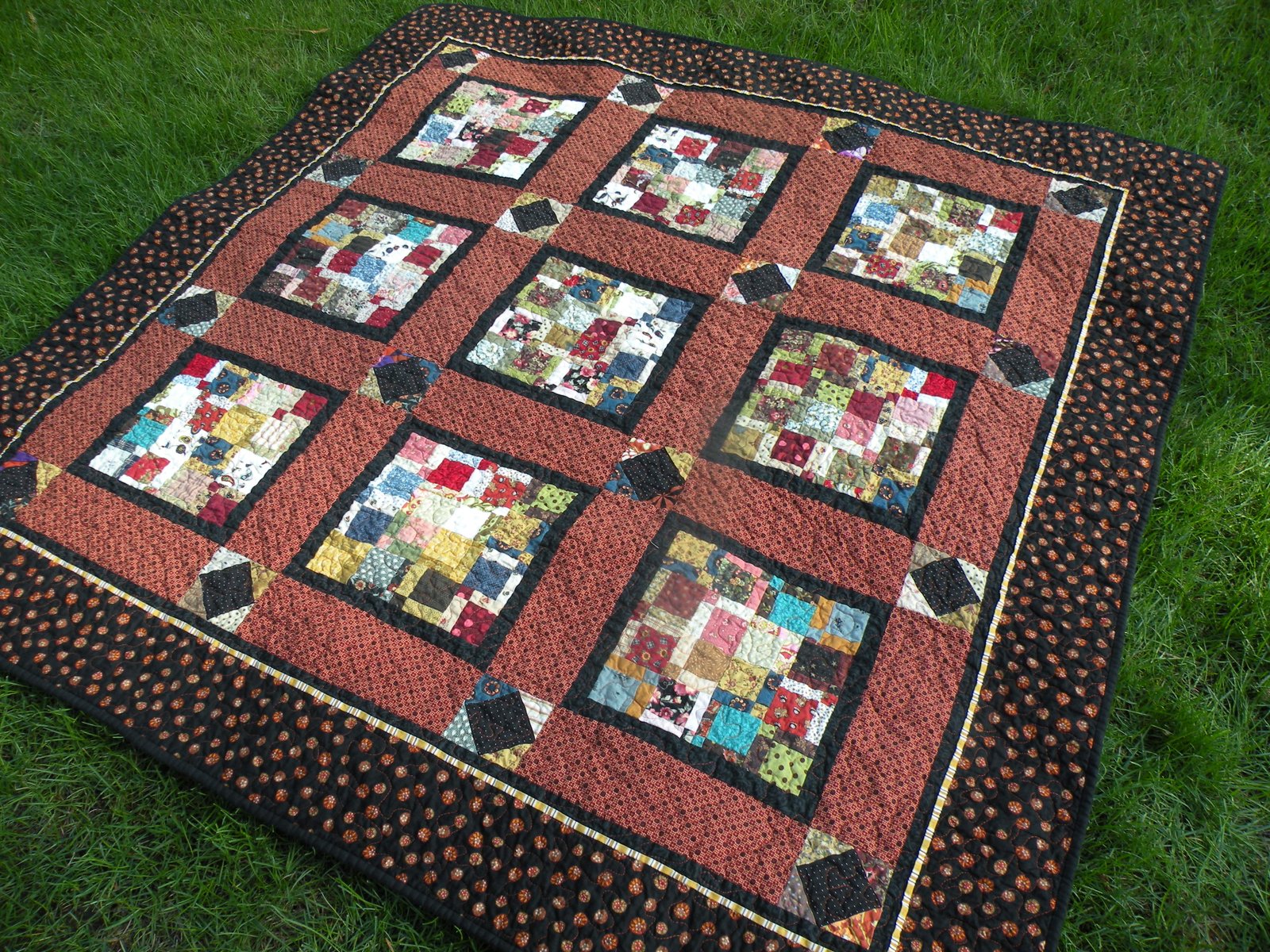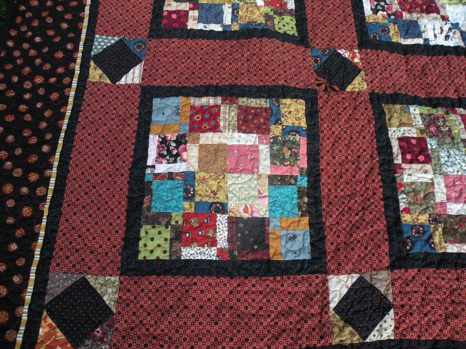 There's a story to this quilt and it's a strange one! Years ago our quilt group made "ugly 9-patch" blocks and exchanged them...I made a quilt out of my set and love it to pieces. Lori opted not to use her blocks and gave them to me and I decided instead of another 9-patch quilt that I would cut those blocks into smaller blocks and then resew them...then the ugly fabrics would be smaller and less noticeable, at least that was the goal.