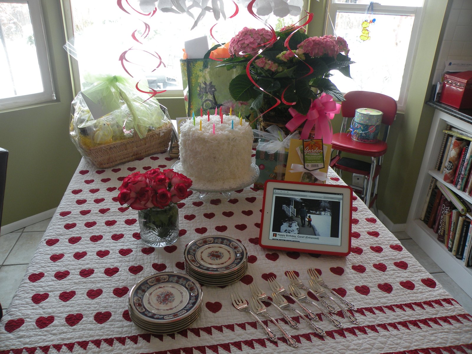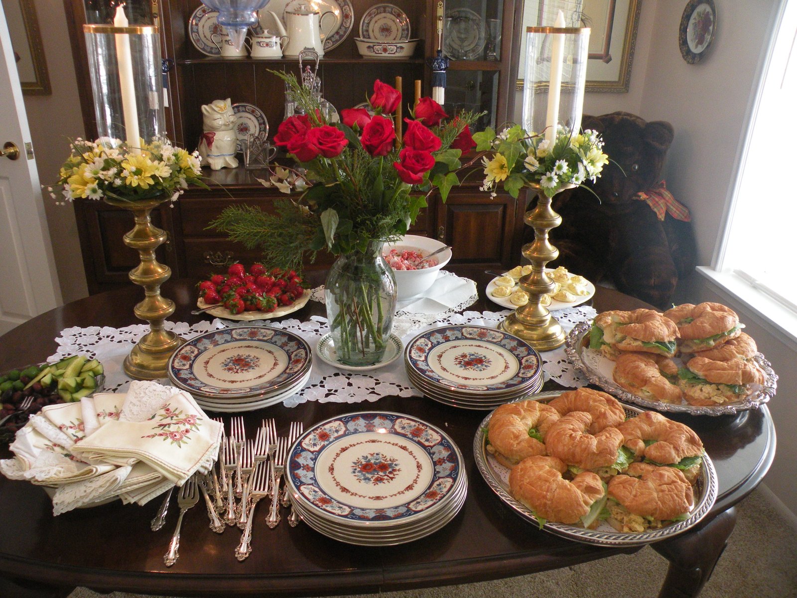 Don't you just love my mom's china? It's actually my china...sort of...when I registered for china before I was married, I picked that pattern...alas, I only got one place setting and it seemed foolish to keep it, so I returned it. When my mom bought herself this china years later, I was so happy! I love seeing it and using it - I do think the food tastes better on mom's china! Speaking of food, we dined on Margaux's Curried Chicken Sandwiches, Tomato Salad with Basil-Buttermilk Dressing, B-C-T-Deviled Eggs, Glazed Strawberries, plus a fabulous salad my sister-in-law Ellen brought (not shown) and for dessert we had the best Coconut Cake with Lemon Curd Filling in the world...it really is...and I know cake!