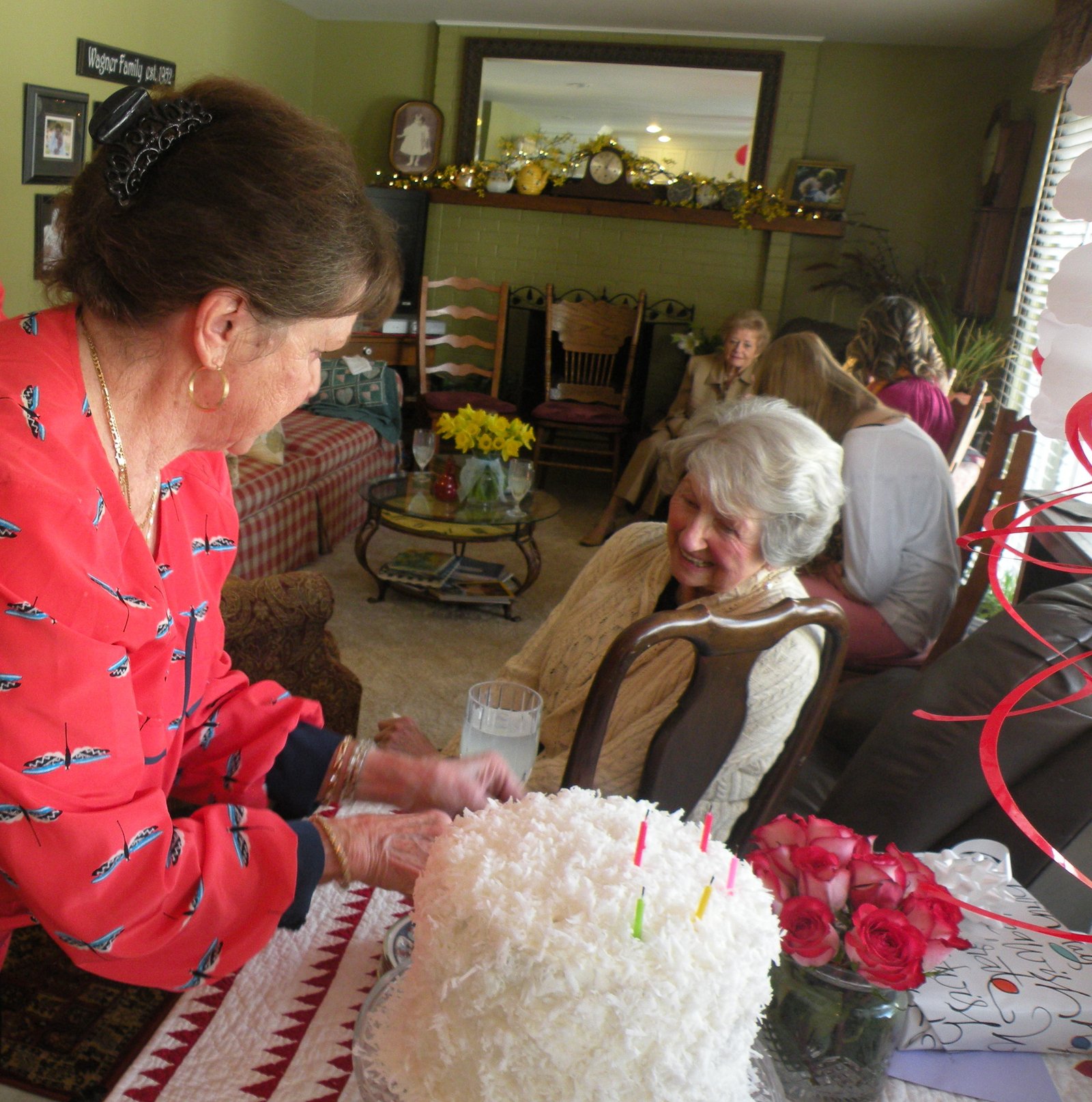 Here's a pic of my mom, removing her birthday candles after blowing them out, and Aunt Till...please do not look at her missing eyebrow! That's my mom's friend Doretta in the background...I don't know where everyone else is in this shot - we had a packed house! They must have been in the dining room loading their plates!