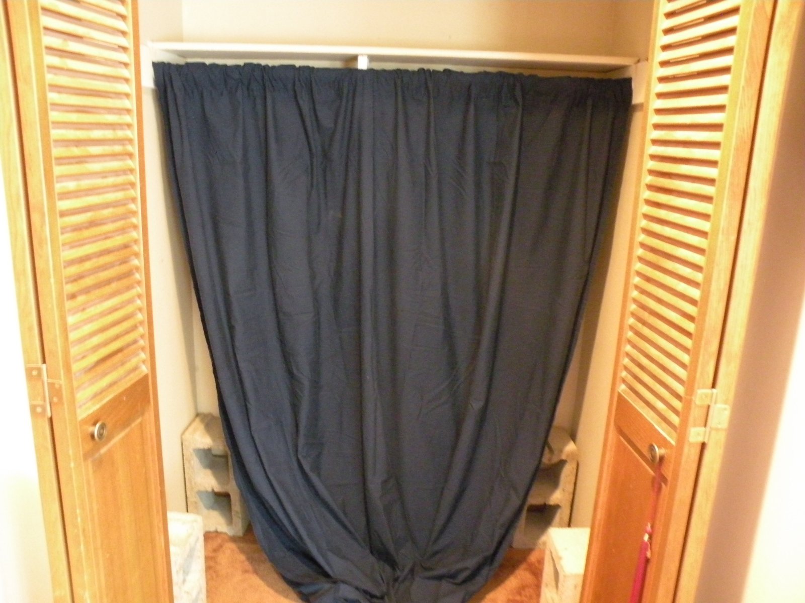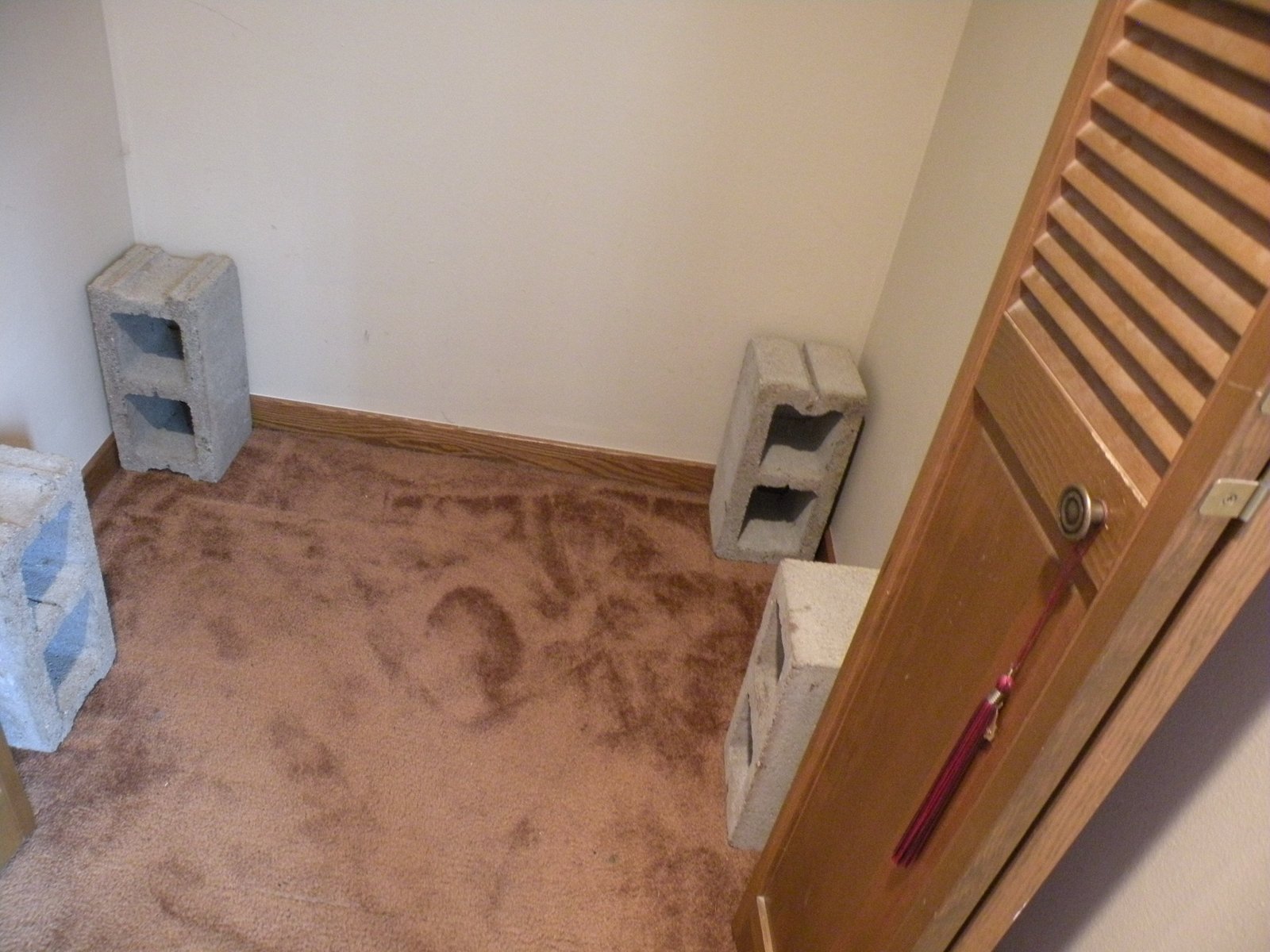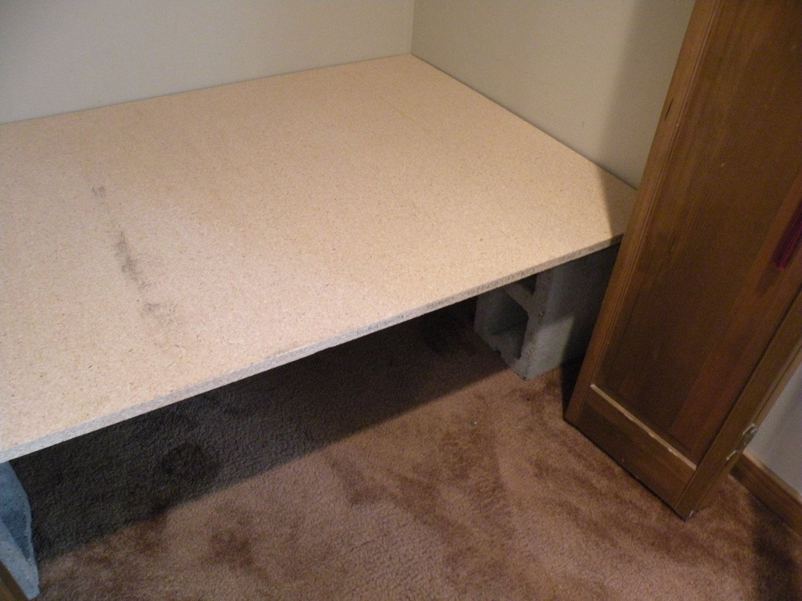 The closet was cleaned out and cinderblocks (we had some in the garage, don't know when we bought them or for what reason) were put into each corner of the closet. I made a trip to Home Depot where I purchased a piece of plywood ($19.00) for the basis of the bed, and they even cut it for me to the exact size I needed.