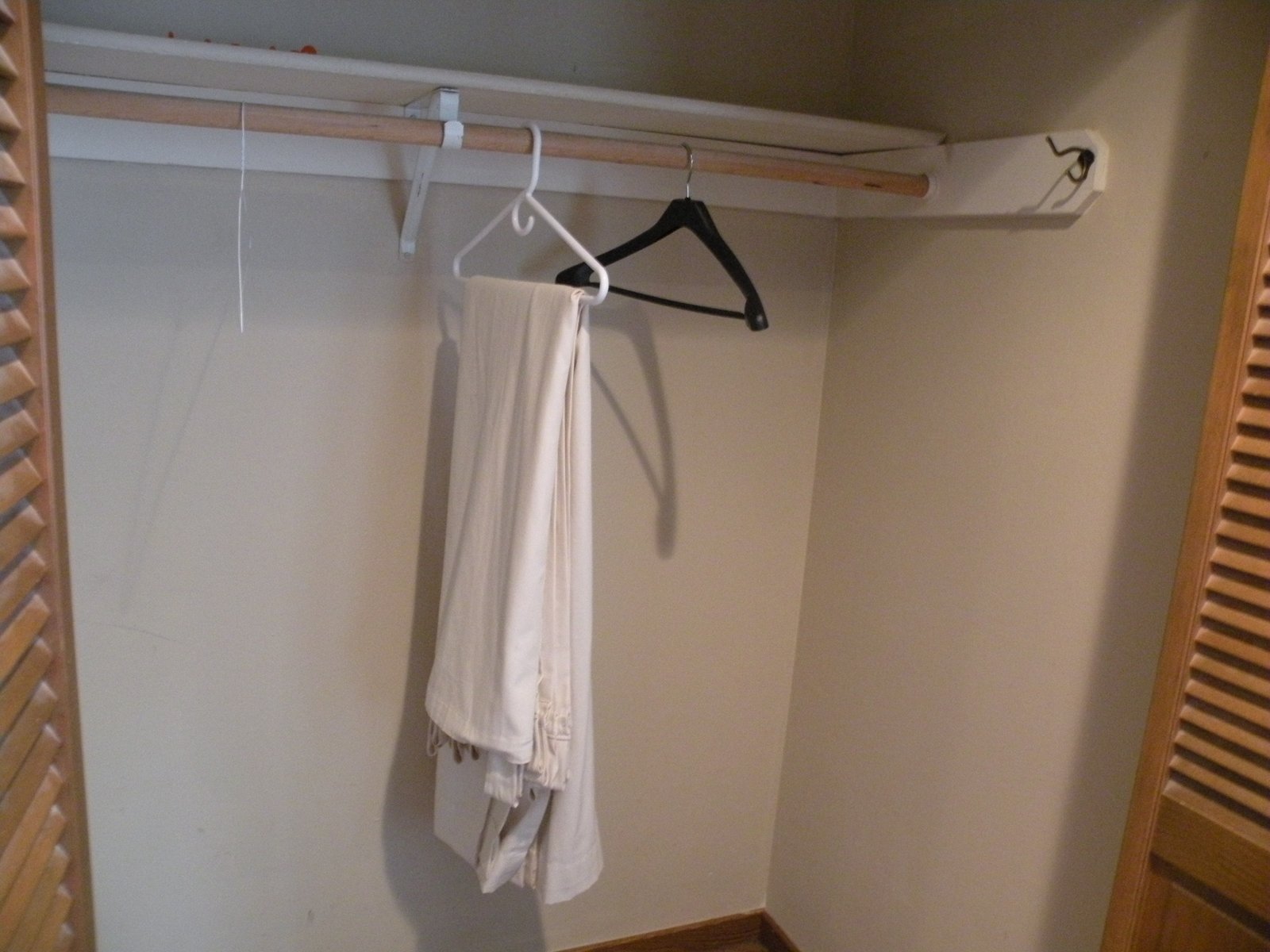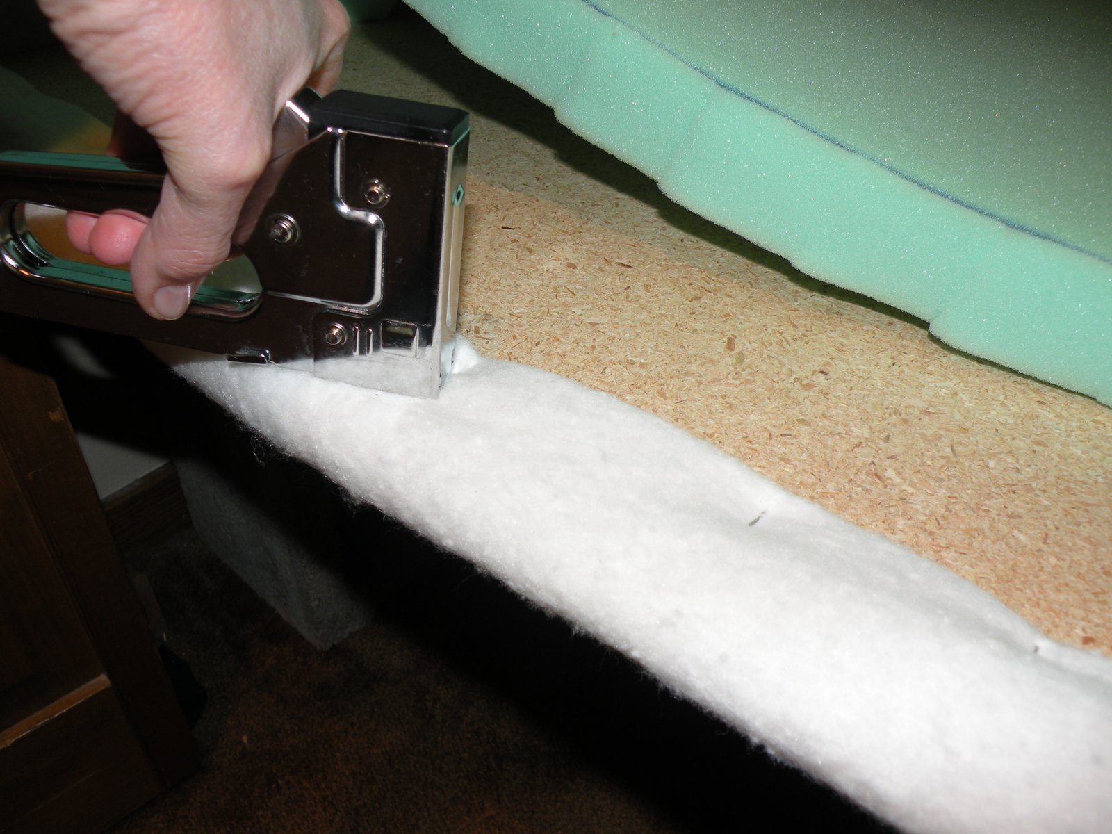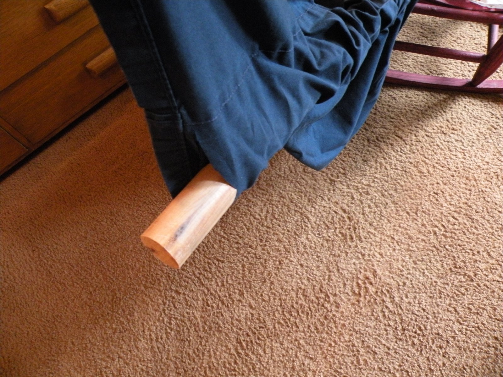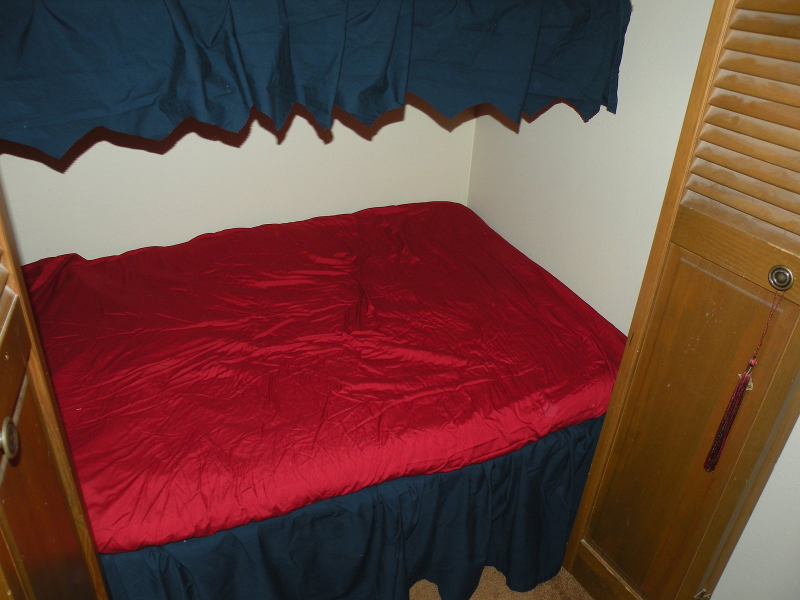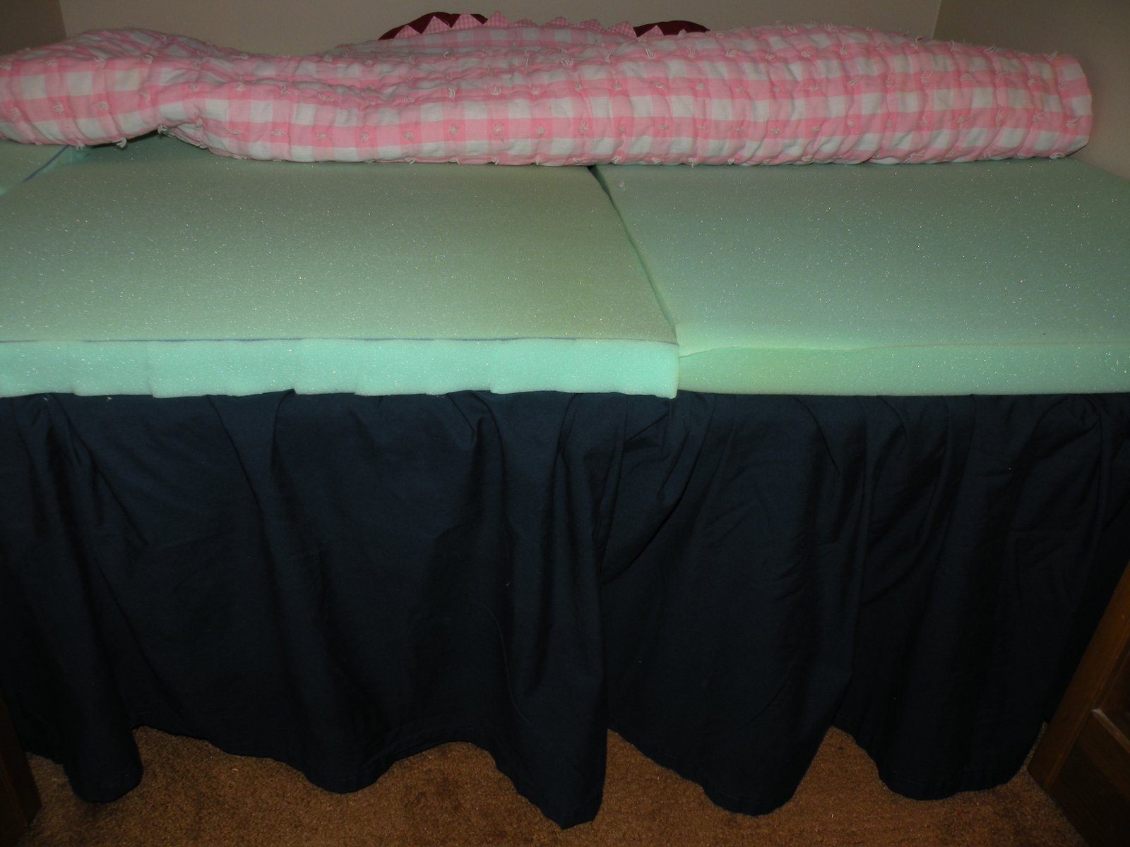 Using a staple gun I attached some batting to the edge of the plywood so Max wouldn't bump his knees. I took an old sheet and cut off a piece from the bottom half to make a "dust-ruffle" to hide the cinder blocks. The bed is high enough up off the floor so Max can keep his suitcase underneath. Then foam was put on top for the mattress. I only bought 3-inch foam because foam is stinkin' expensive! I needed 2 1/2 yards and even with a 50% off coupon (at Jo-Ann's) the foam was $41.00! (The 5-inch foam is $75 a yard!! But Max's little 32-lb. body will rest very comfortably on 3-inch foam!) Just to be sure it was soft enough, I added two extra thick quilts on top and then covered the entire "mattress" with a sheet. (The plywood and foam measures 57-inches by 37-inches - not exactly mattress size.) The next step was to create an "awning" - totally unnecessary but as you know, I excel at unnecessary. I used the top half of the sheet, threaded it onto the closet clothes rod and put the rod back into place.
