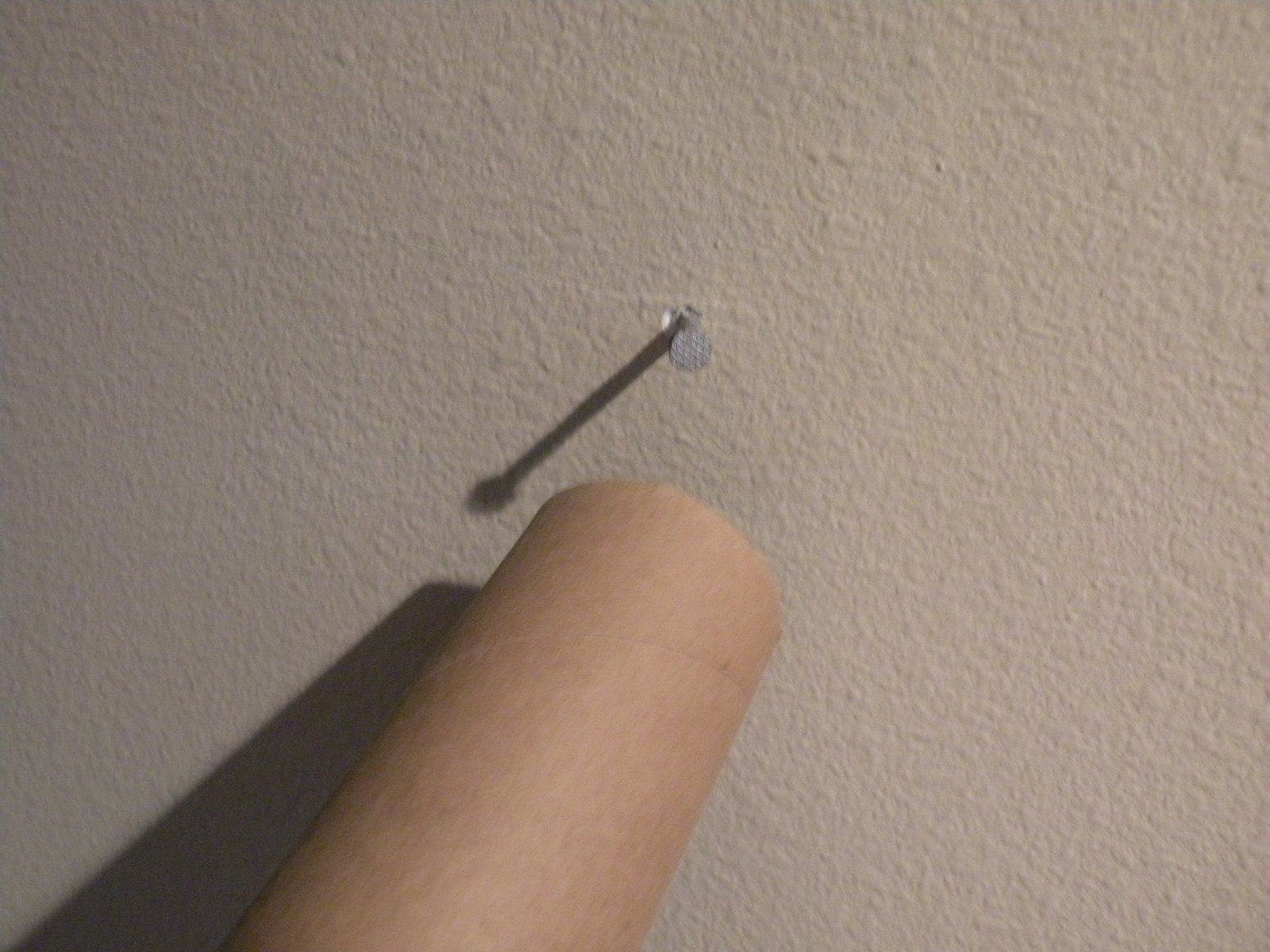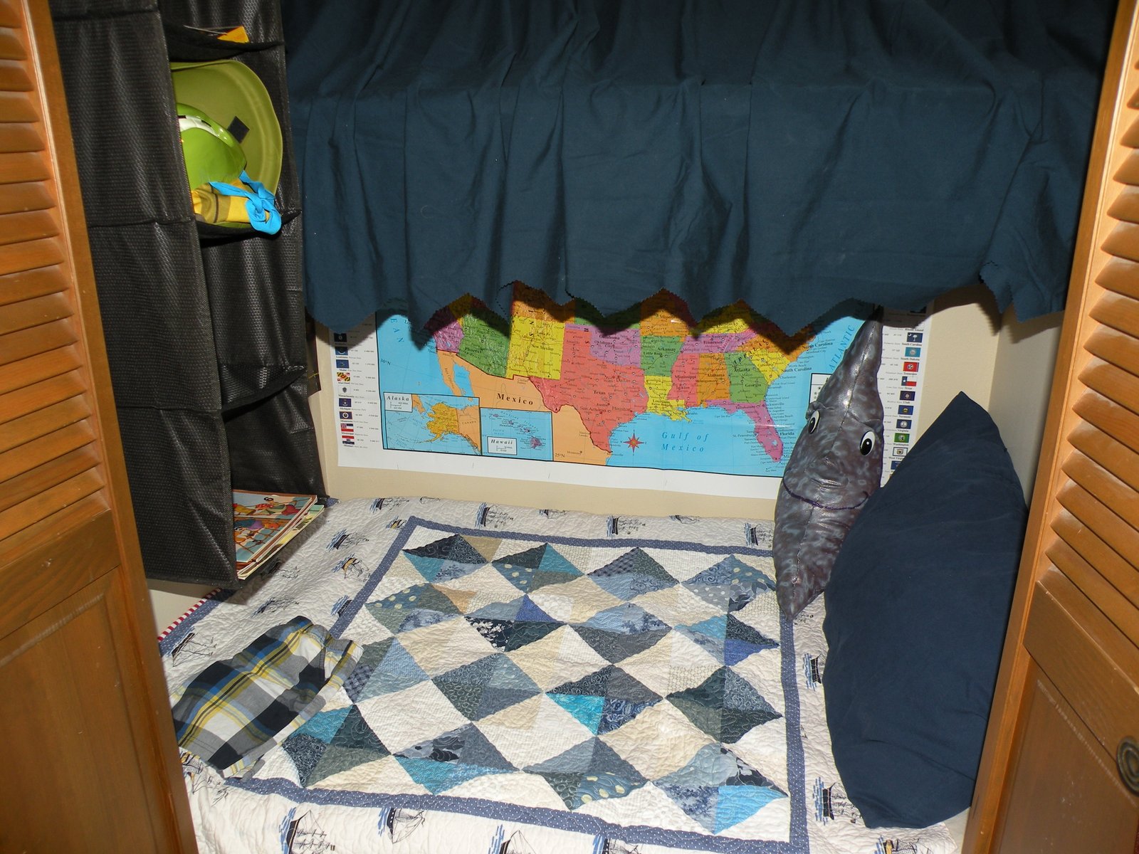 We had a long cardboard tube in the garage (we have a lot of things in our garage!) so it was put into use to help with the awning. I pounded two nails into each side of the closet wall - set one end of the tube over one nail and on the other end of the tube, I made a small cut on the end so I could fold back the cardboard allowing it to slip over the nail easily. The cardboard tube was cut the exact width of the closet. Then I pulled the sheet up and over the tube to create the awning; and then cut the sheet with pinking shears to the length I wanted. (No need to sew/hem - this is a temporary bed! By the time Max comes again he will be too tall to sleep in there!)