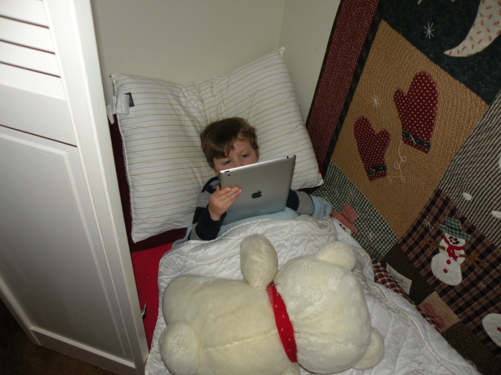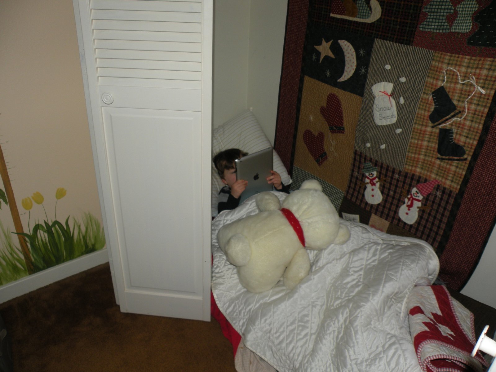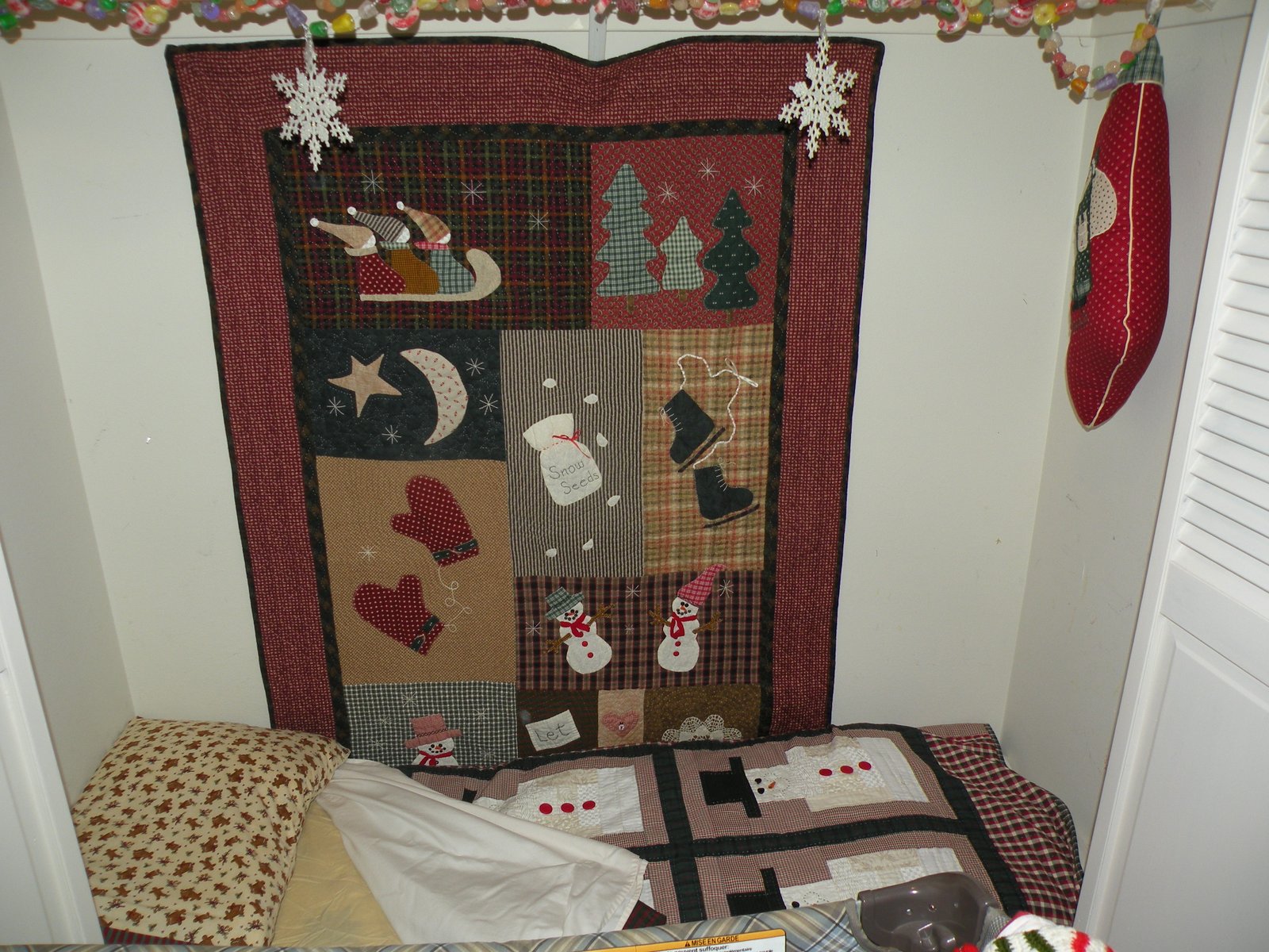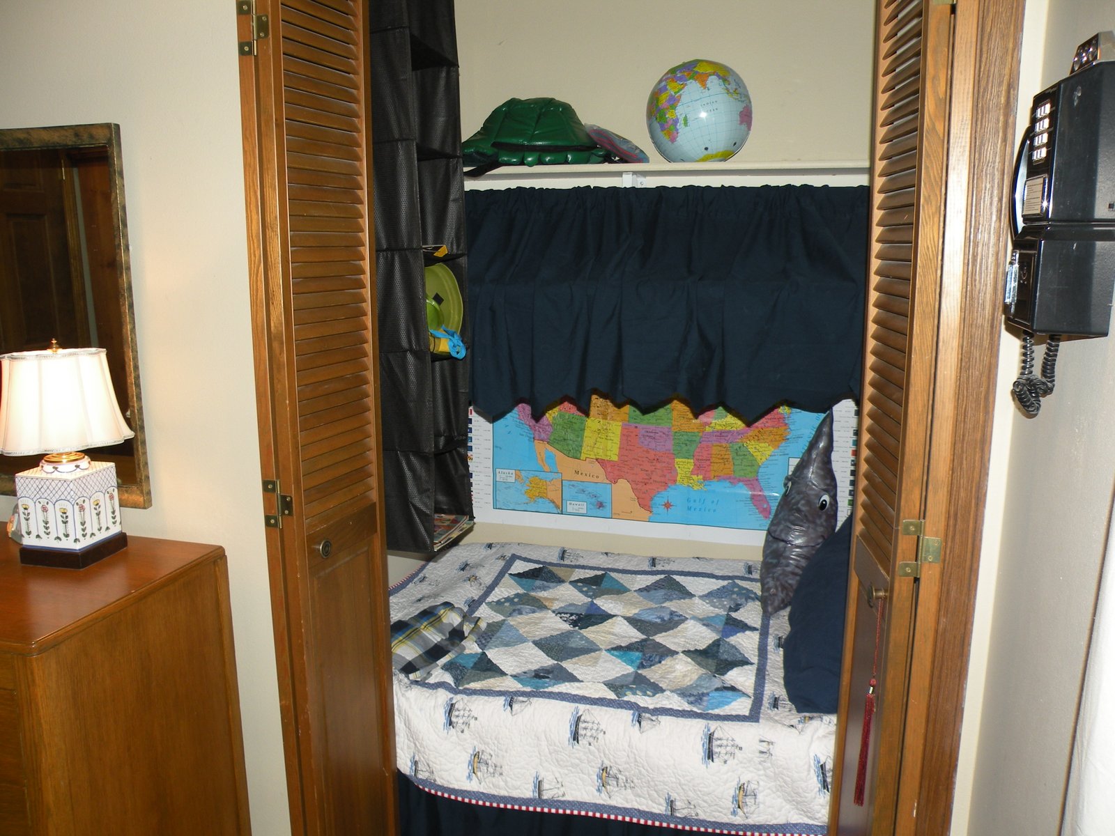 When Max came to visit last Christmas, beds were at a premium - the house was bulging with people and we just didn't have enough beds to go around. After giving the matter some thought, I quickly turned a closet into a "bedroom" for Max by throwing some cushions on the floor, hanging a quilt on the wall and putting up a few Christmas decorations - he loved it!