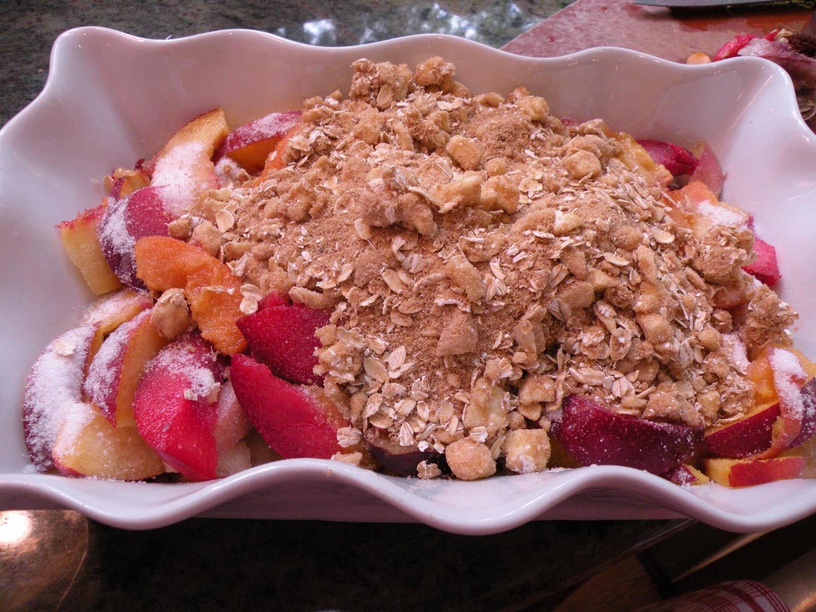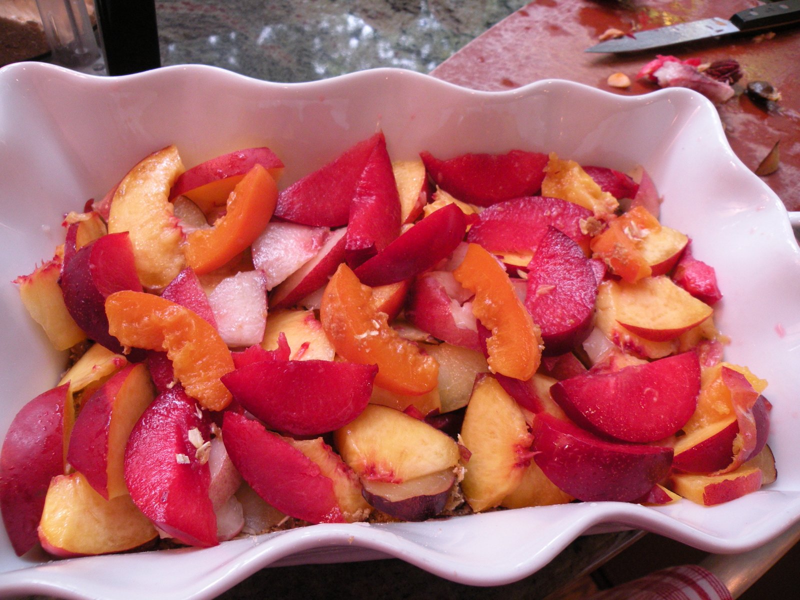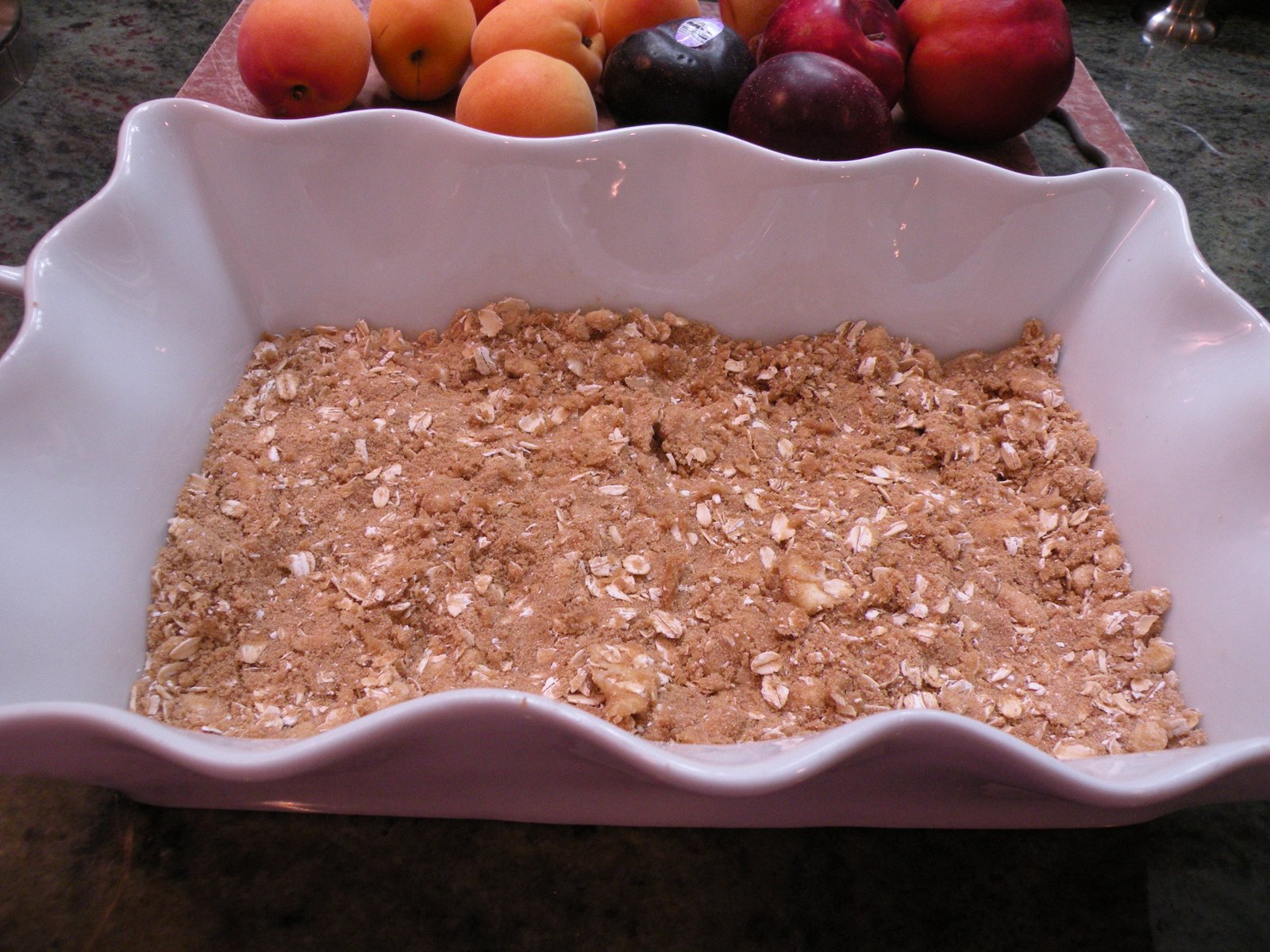 While I like Cobblers, Crumbles, Slumps and Grunts, I really love a good Crisp. I like the crunchy topping with the soft fruit. I used the Cranberry Crunch topping recipe from Joy of Cooking for the topping on this Crisp - it's perfect with the stone fruits.