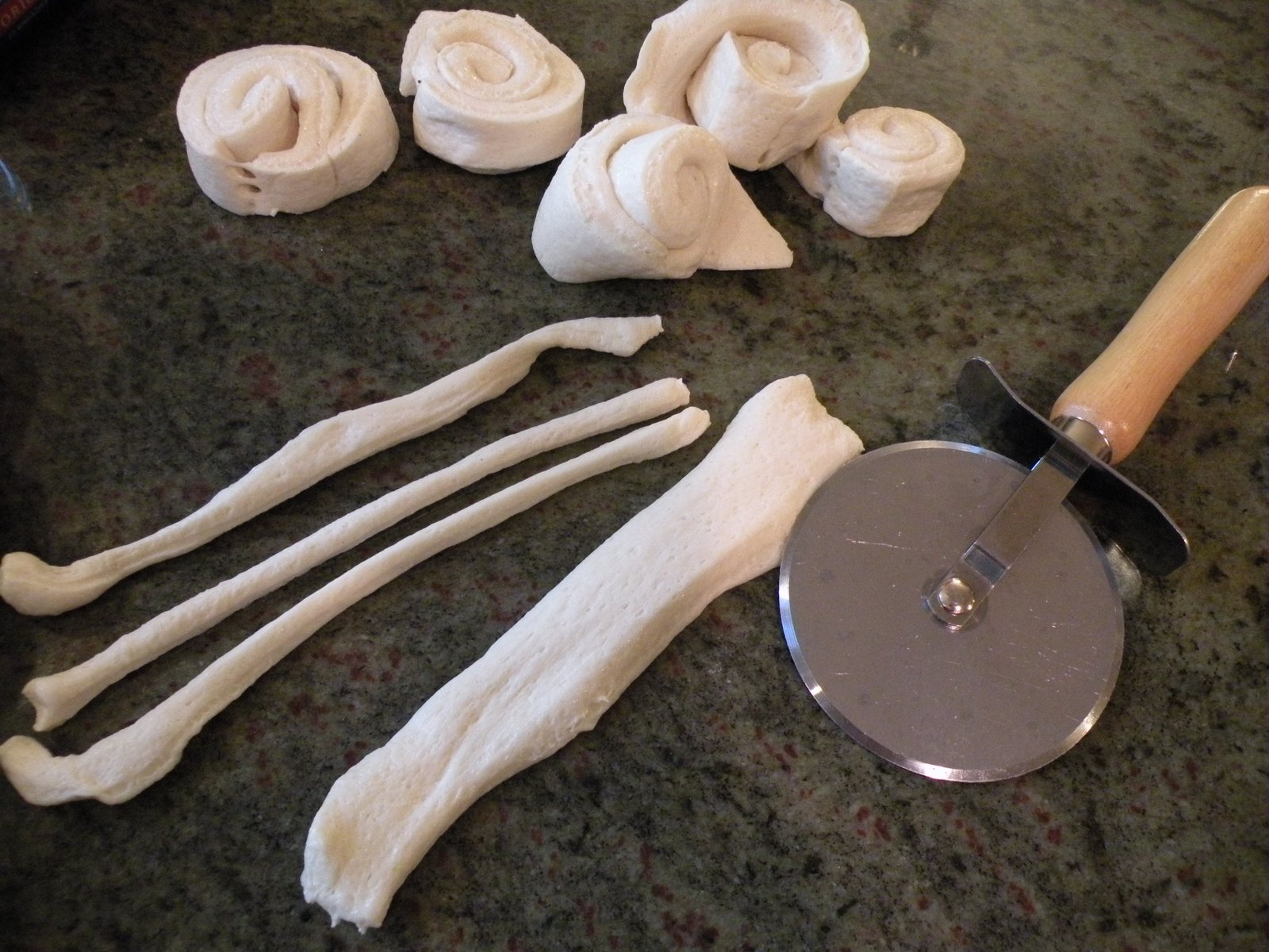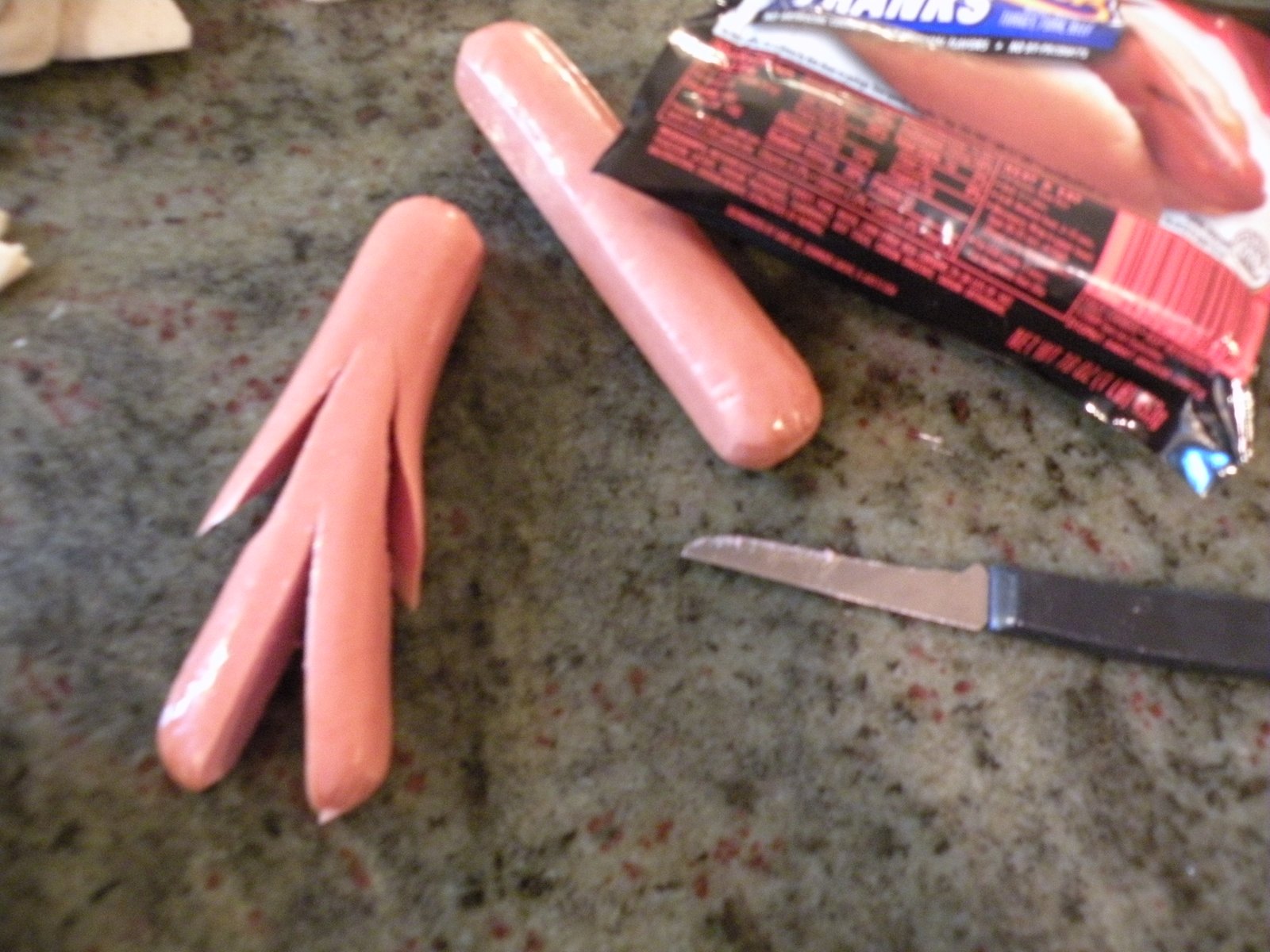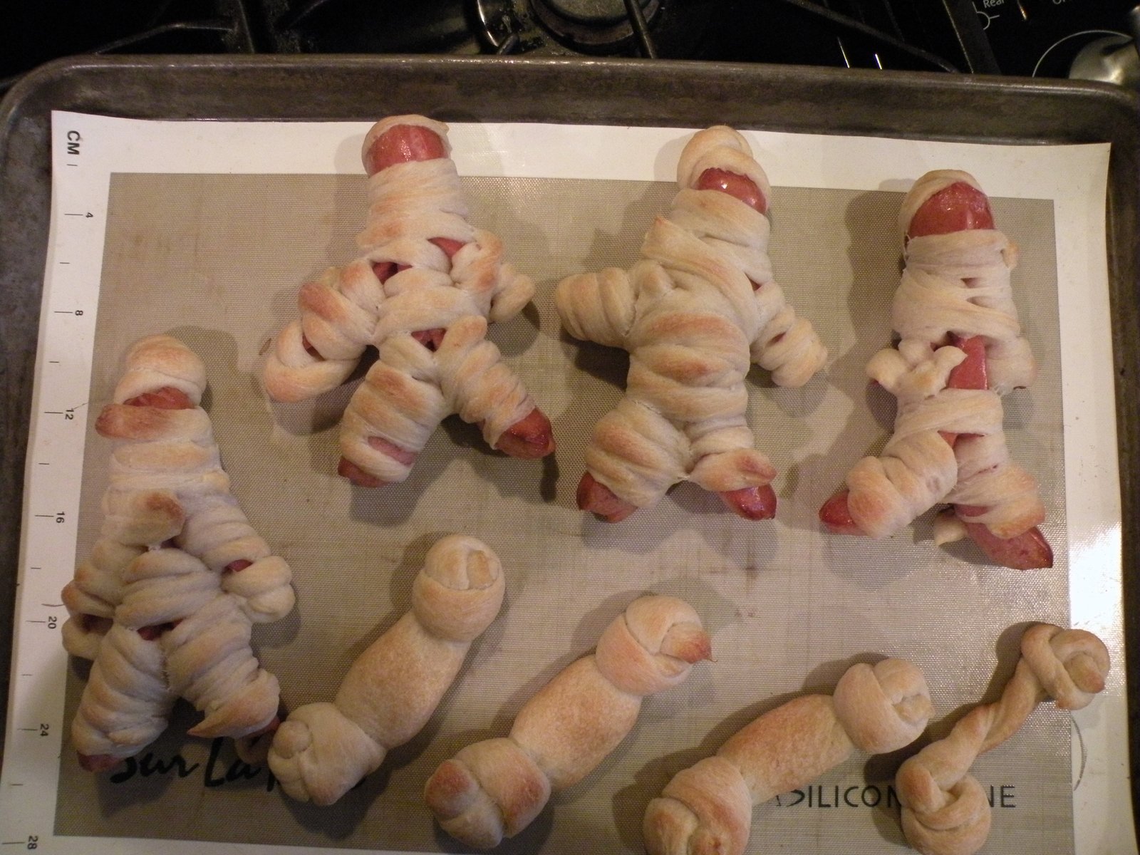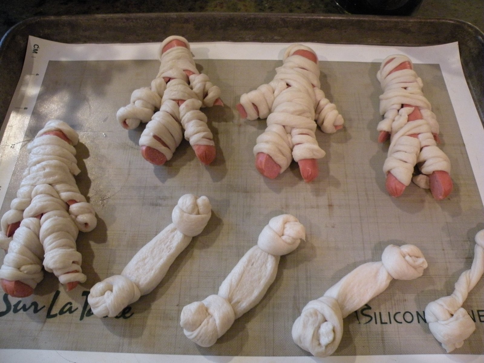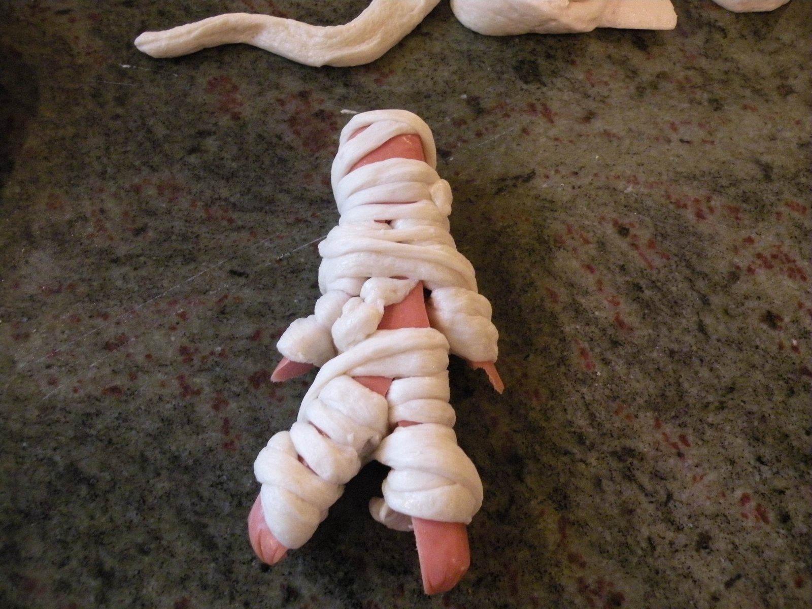 Make three slits in the hotdog...two for arms, one for legs. Wrap the strips of breadstick dough around the hotdogs, leaving a little opening for the face/eyes...two dots of mustard/pus make great eyes!