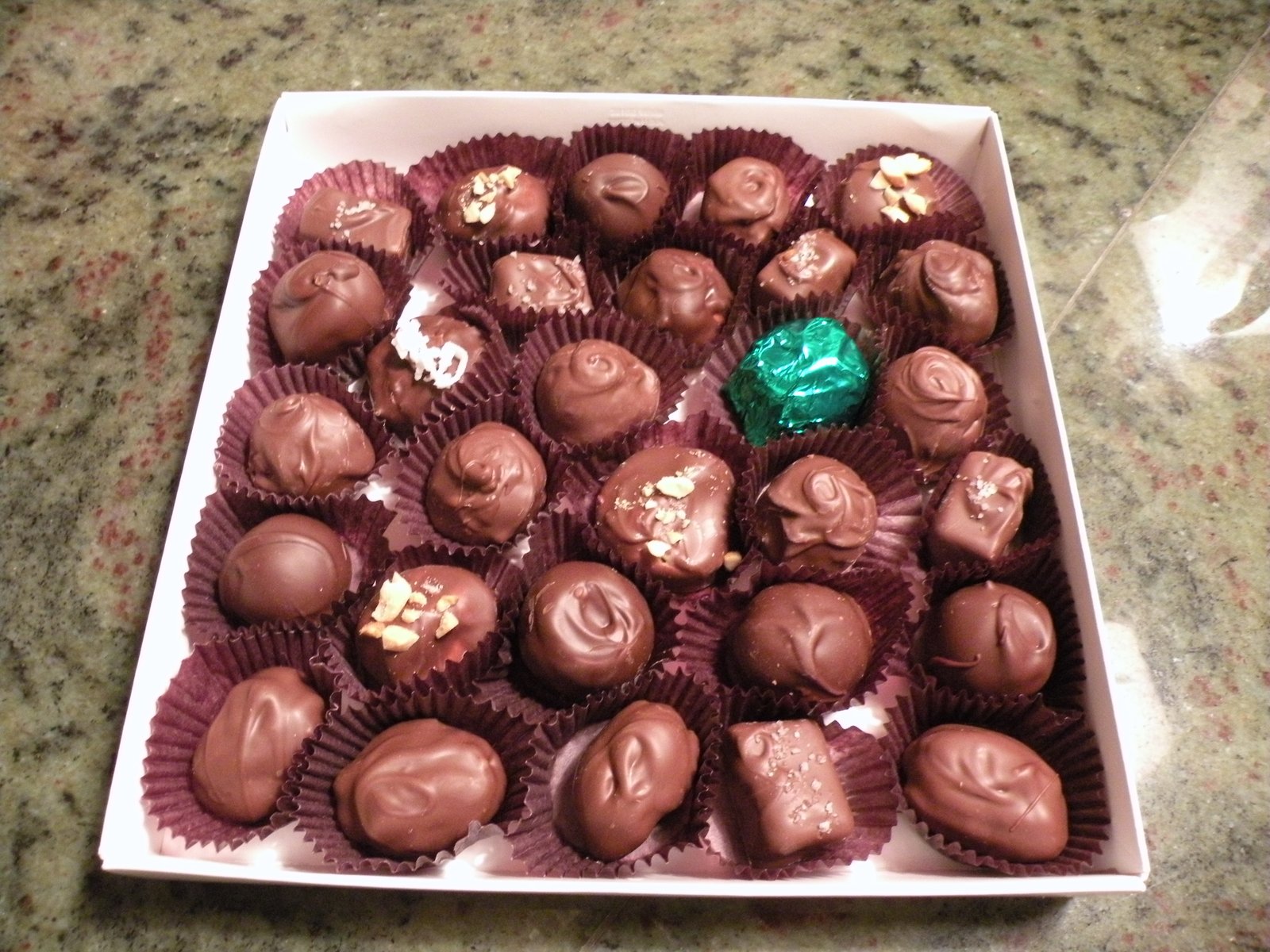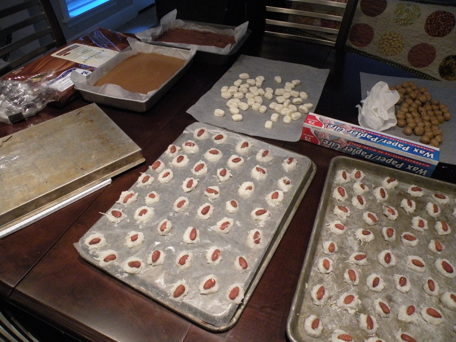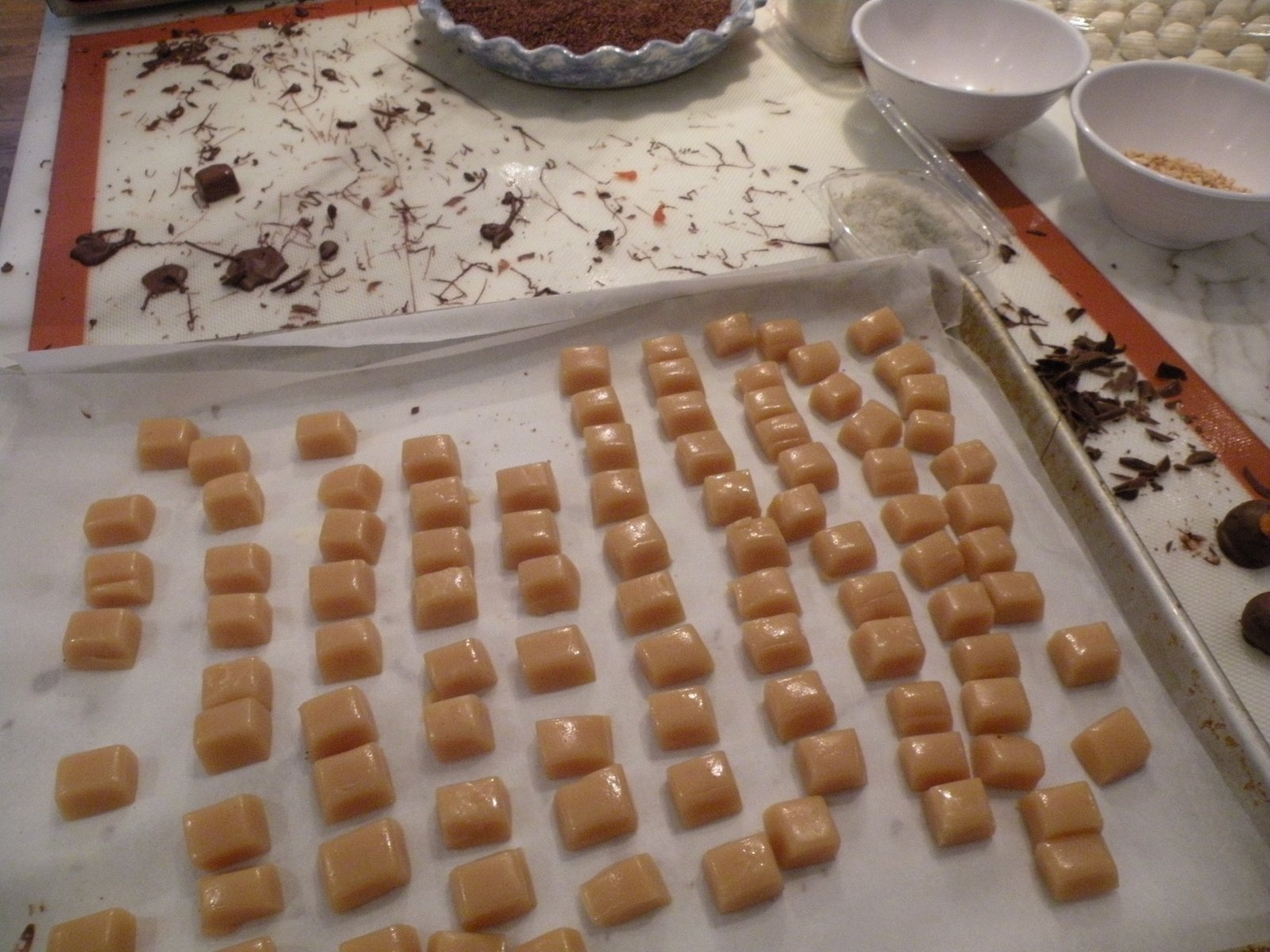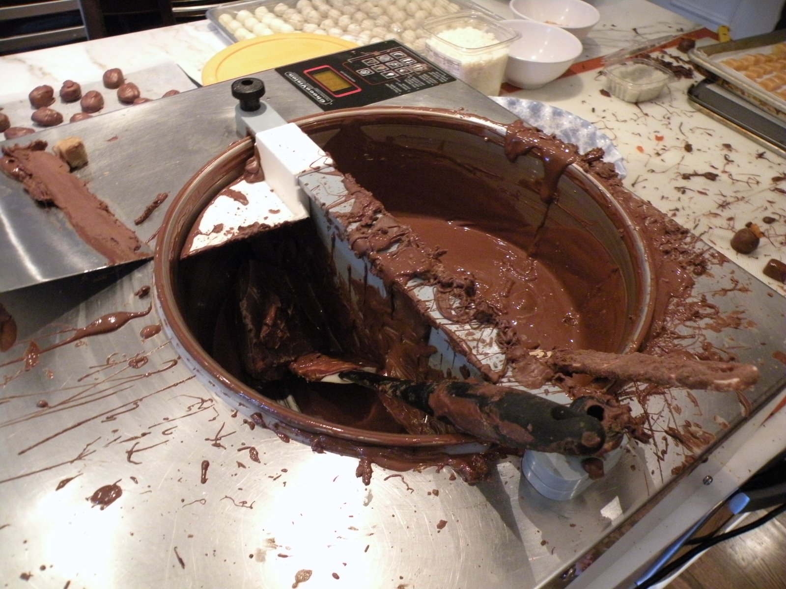 We also had helpers...Linda and Katie kept us organized and more importantly, kept the chocolate organized! Unlike Forest Gump ("Mama always says, life is like a box of chocolates, you never know what you're going to get!) we actually know what's in each container!! They also put all of the toppings on before the chocolates set...sea salt, shredded coconut, chopped peanuts, etc. Couldn't have done it without them!