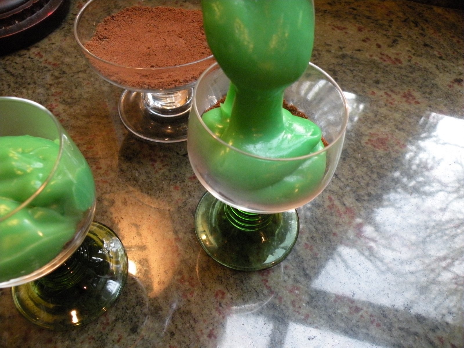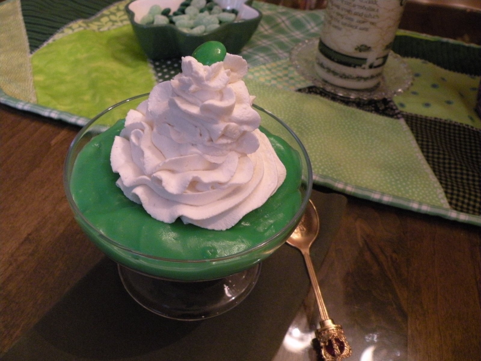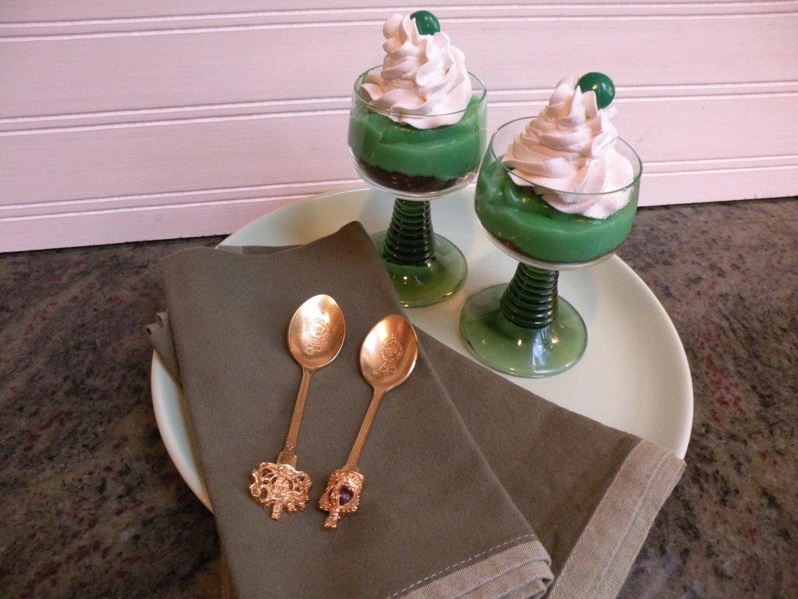 I'm not alone in having a thing for those insanely addictive Girl Scout Thin Mint Cookies - and that's the bottom layer of this pudding - crushed in a food processor and spooned into pretty cups. Now I know I've got your attention! If you don't have Thin Mints and can't find a Girl Scout (seems like they are outside every supermarket around here!) then you can use Oreo Mint Cookies or any other chocolate-mint cookie. The custard layer is made with cream and butter - hello! It's so easy to make and has just a hint of mint from creme de menthe flavoring and, of course, green food coloring to give it that Emerald Isle color. If the mister loved this then you can rest assured that every hooligan and banshee you know will love it, too; if I may say so myself, it's a rather seductive tasting treat! Top it off with sweetened whipped cream, and for a finishing touch just add one (or ten) mint-flavored M&Ms...