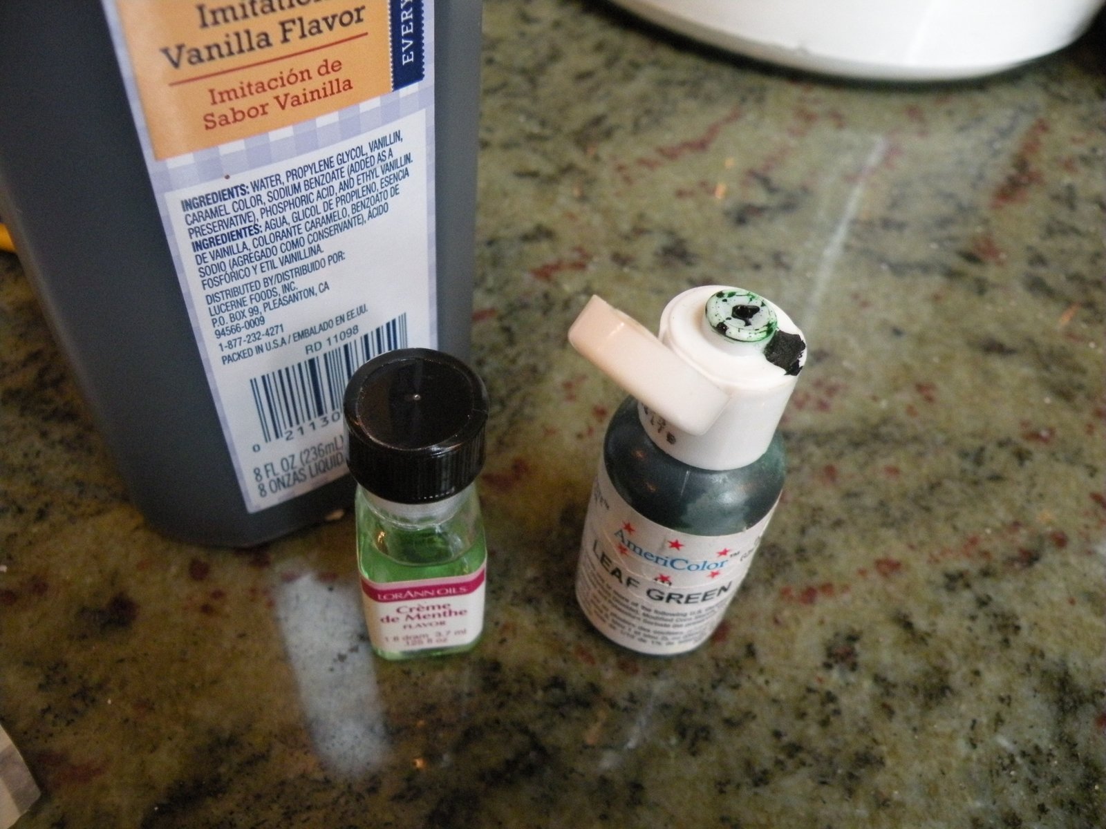 When the half-n-half mixture reaches a full simmer, gradually whisk a little bit of the simmering half-n-half into the yolk mixture to temper; gradually adding in a bit more, about 1/2 cup total. Pour yolk mixture into saucepan, and whisk over medium heat, constantly, until a few bubbles burst on the surface and the mixture is thickened and glossy, about 30 seconds. Off the heat, whisk in the butter, creme de menthe flavoring and vanilla. Press plastic wrap directly on the surface to prevent skin from forming and refrigerate until cold and set, at least 2 hours.