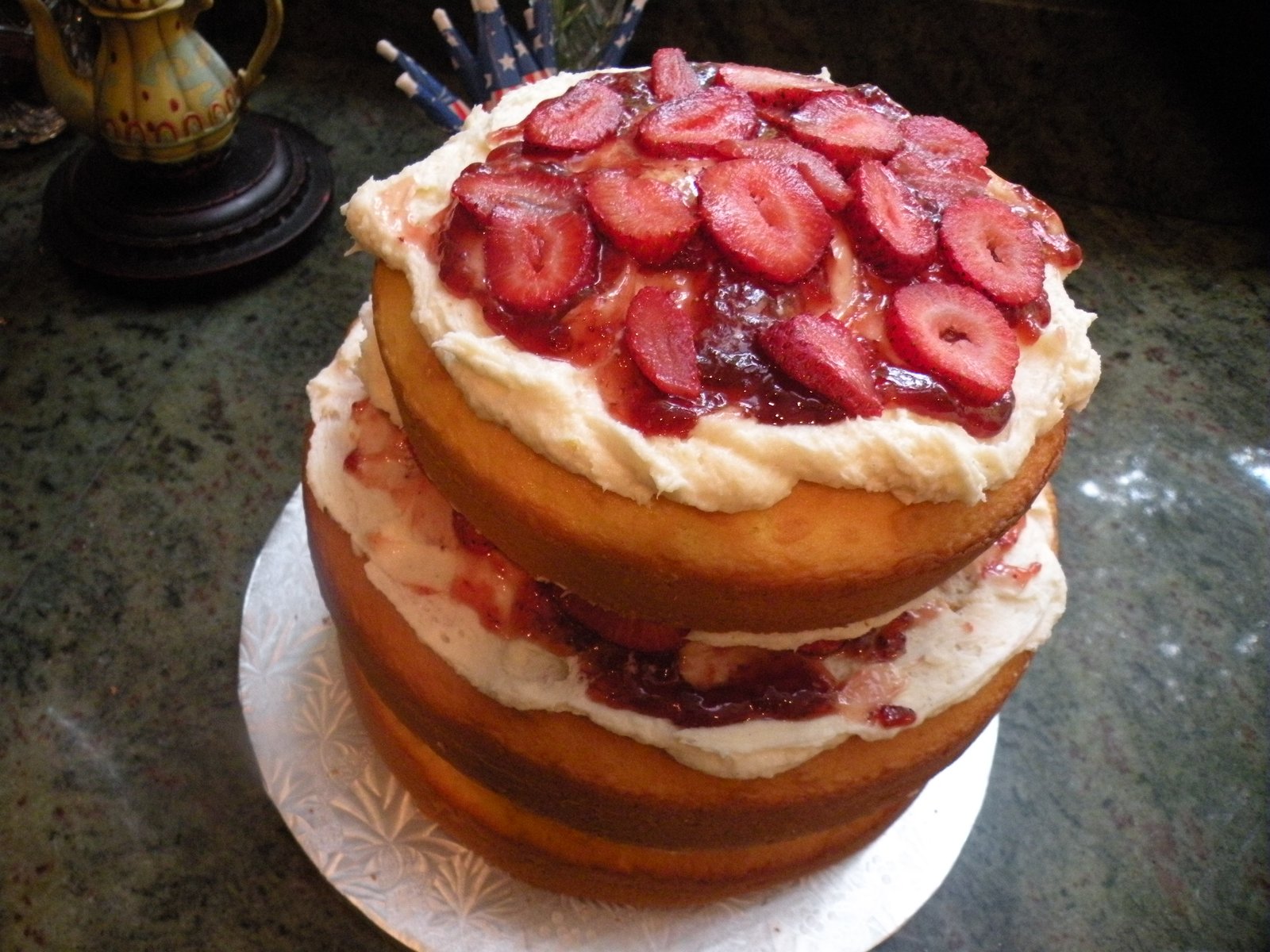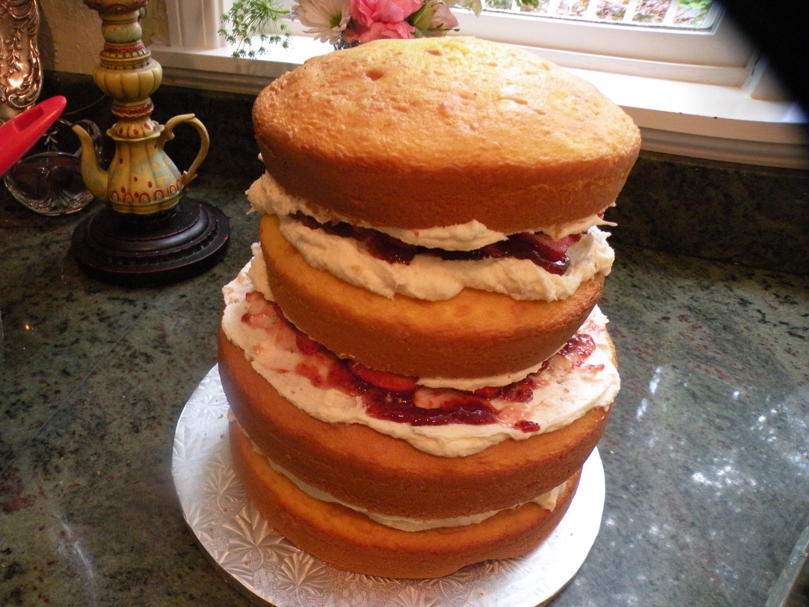 The lemon cake had fresh strawberry filling and a vanilla-bean-with-just-the-hint-of-strawberry buttercream frosting which was very light and luscious - truly yummy - and all four layers behaved beautifully! Oh, I love my new refrigerator - because it can hold a two-tiered-4-layer cake without any problems!