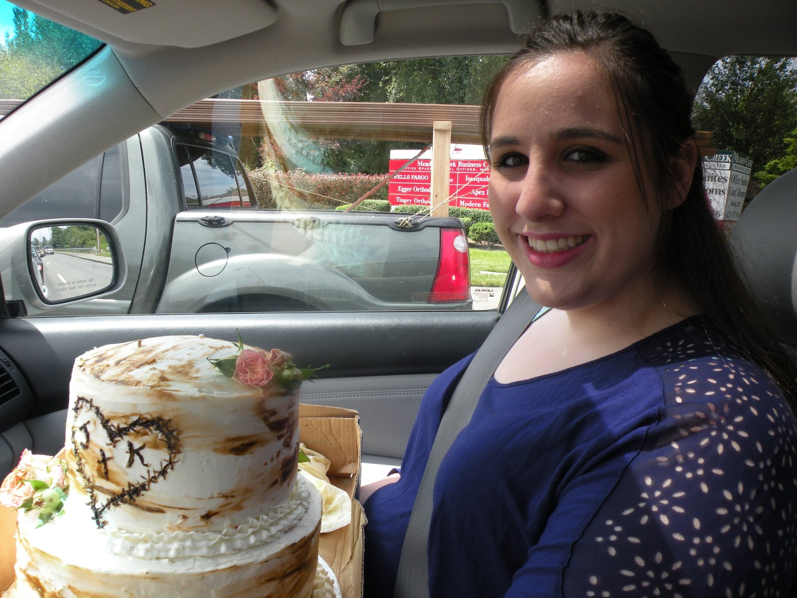 By the time Katie-the-cake-carrier and I arrived at our destination, the cake had "settled" just a bit and the top layer, even though supported with wooden skewers (which you can see poking out of the top of the cake!) was just a bit off...but no worries I thought, I had plenty of extra frosting to fix anything - anything but the temperature inside the stinkin' hot barn!!