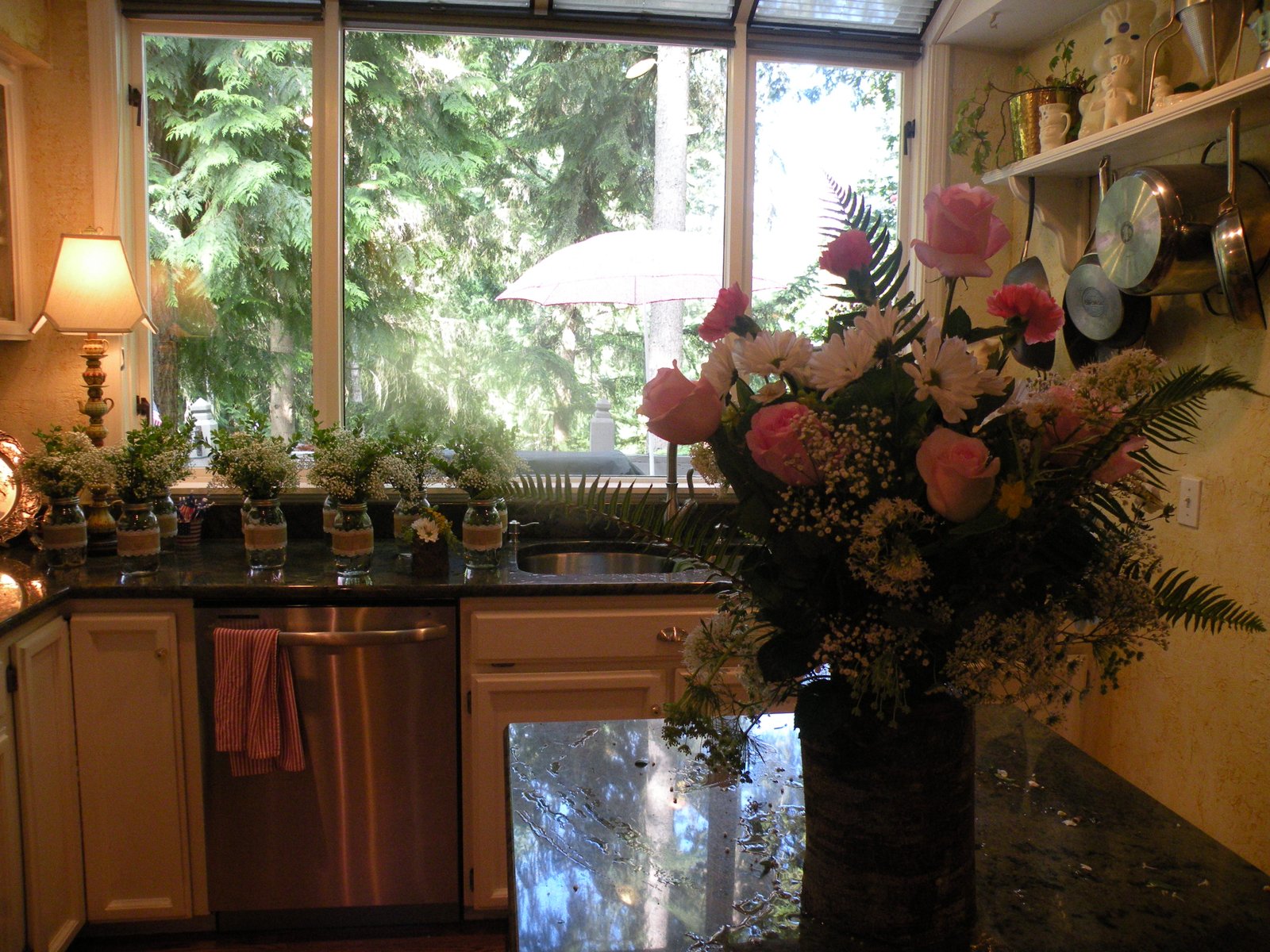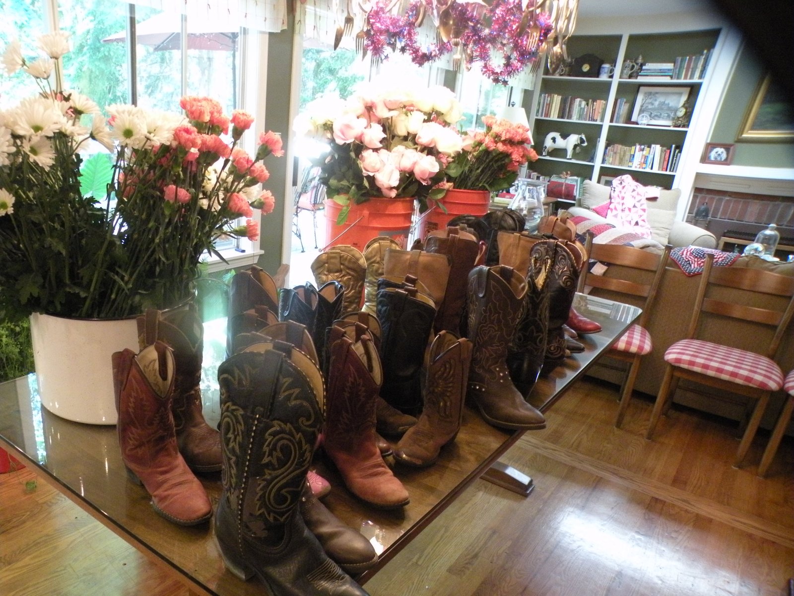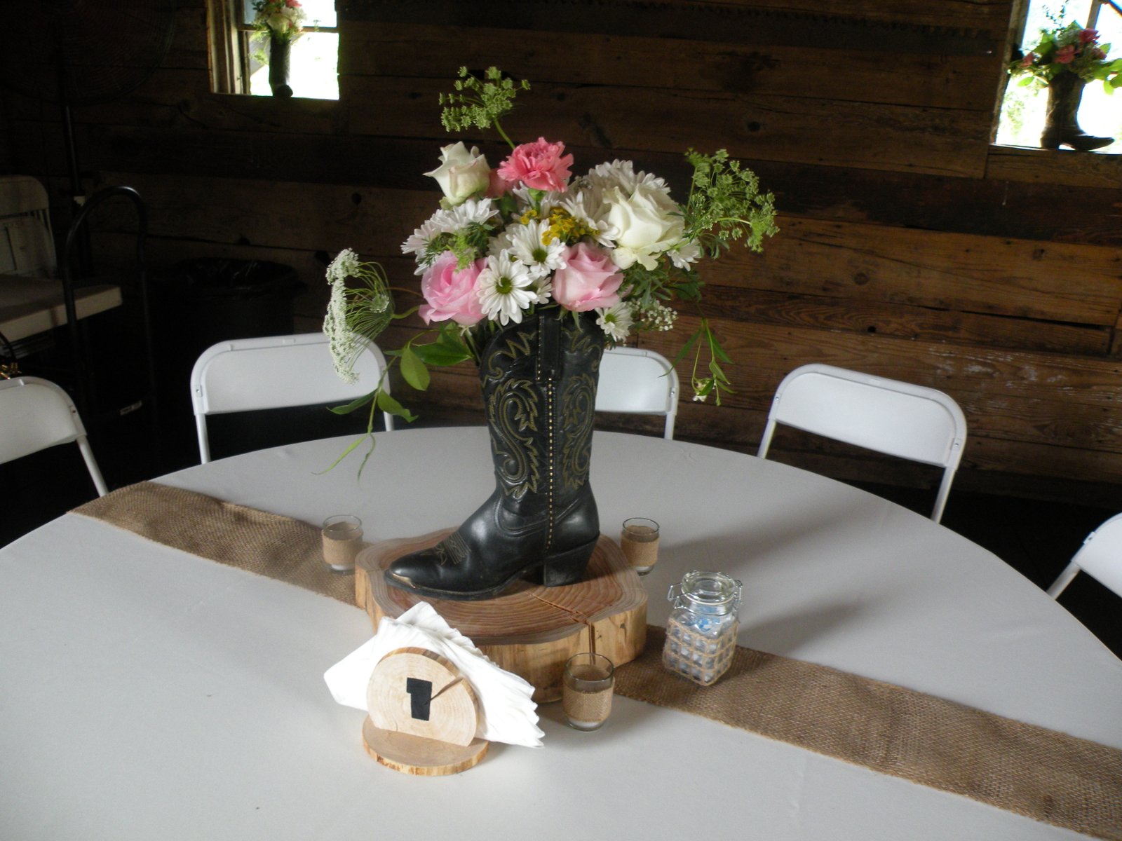 But that's not all...no, any sane person would have agreed to do either the cake OR the flowers - definitely not both and definitely NOT on a major holiday weekend! Godfrey! I need my head examined! Thankfully I had two very dear friends (thank you Doneen and Wendy!) who came to my rescue and helped me make arrangements for every cowboy boot you see on that table - plus some you don't (about 30 in all!) and 7 other large wooden vases and 14 Mason jars AND the bride's bouquet, toss bouquet, two bridesmaids bouquets and NINE boutonnieres in empty shot-gun shells! I'm exhausted just writing that. It was a LooooooooG weekend! On the other hand...volunteering is good, no? Volunteering is rewarding, right? Volunteering is not the same as being a doormat, is it? IS IT?!? Well whatever, except for the stress over the cake it was all great fun - it really way - but it was a ton of work! The wedding/reception could not have been held at a more spectacular place - like something out of Country Living or Anthropologie...below are just a few of the pics I was able to get before my camera died...