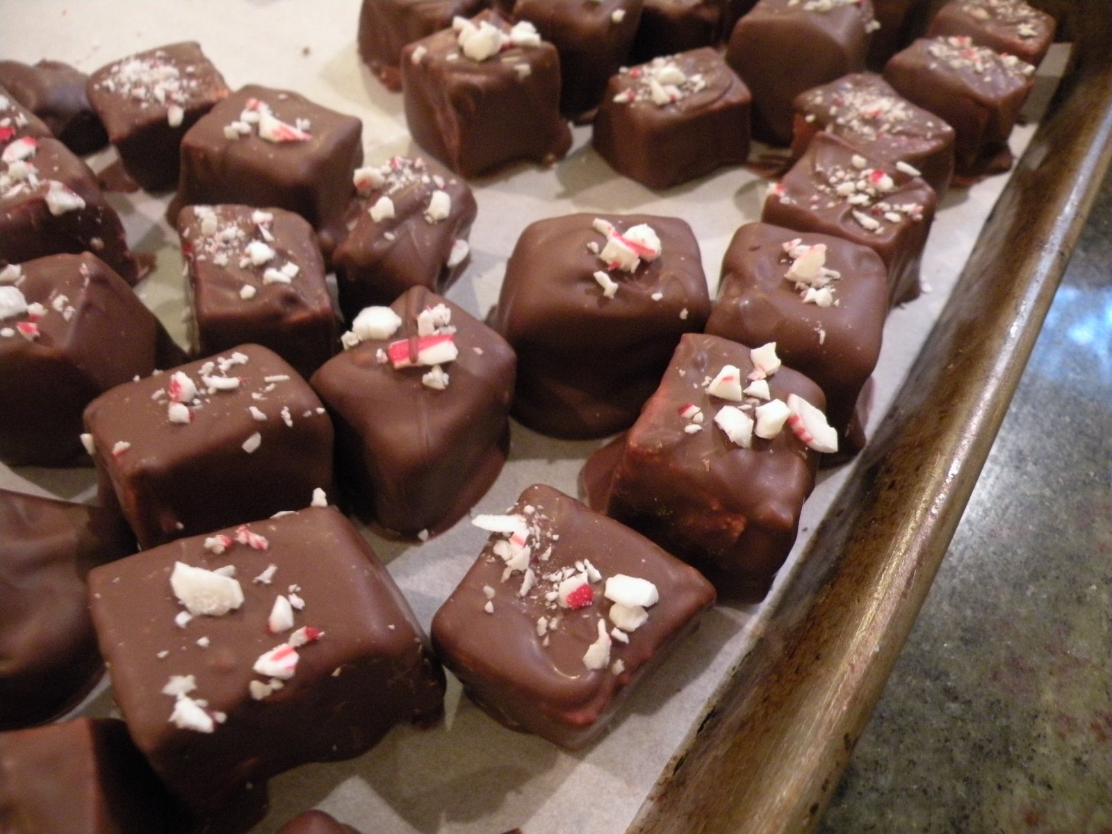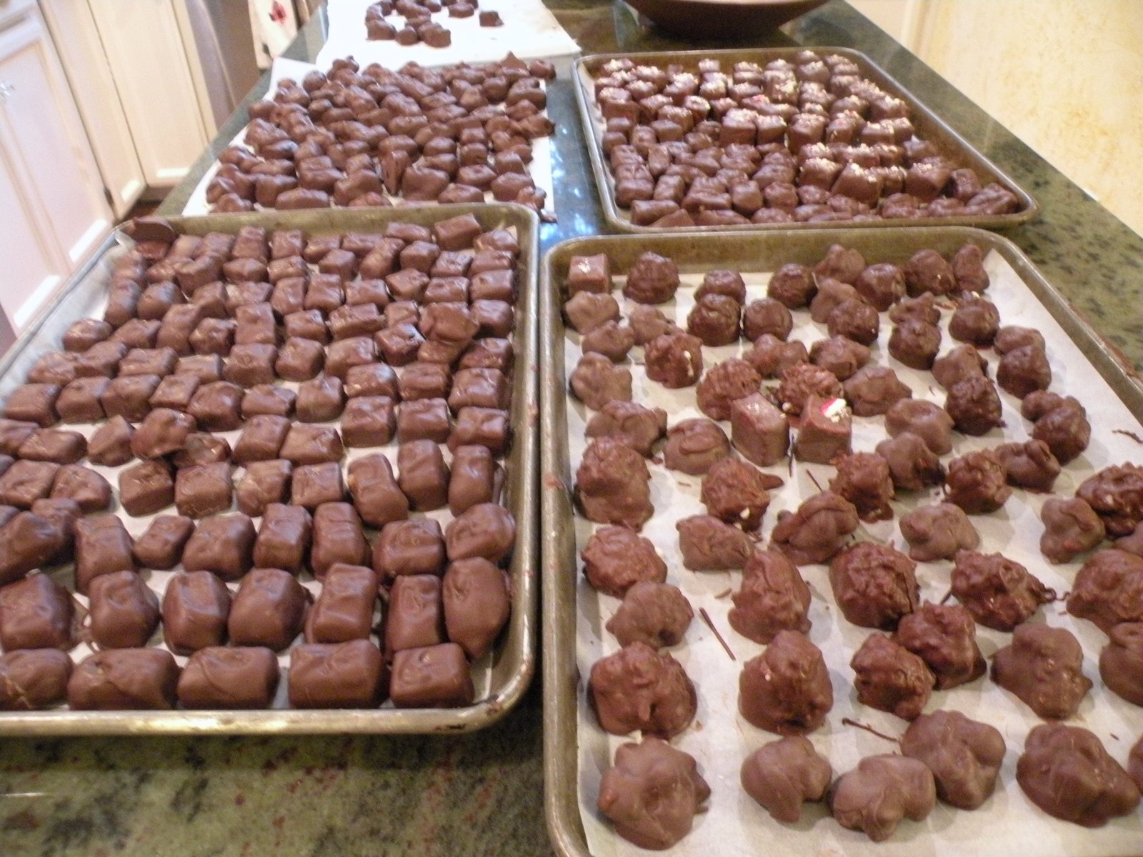 We rented a large chocolate tempering machine but it gave us more trouble that it was worth so we ended up not using it on the second day of dipping...two days of being up to our elbows in chocolates...best anti-depressant there is!