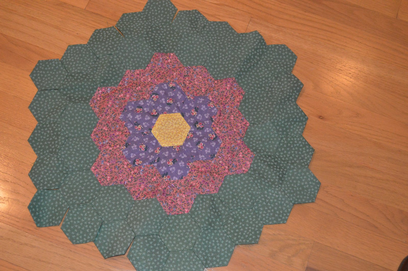 Marsha brought this "vintage" hexagon piece (circa 1999??) to show us - with the papers still in the back. I don't think the owner of this knows what to do with it...probably best that she just gives it to me...I know what to do with it!!! A little felt on the back and a nice dark tea-dye will make this vintage piece look like a true antique...I'm just sayin'...