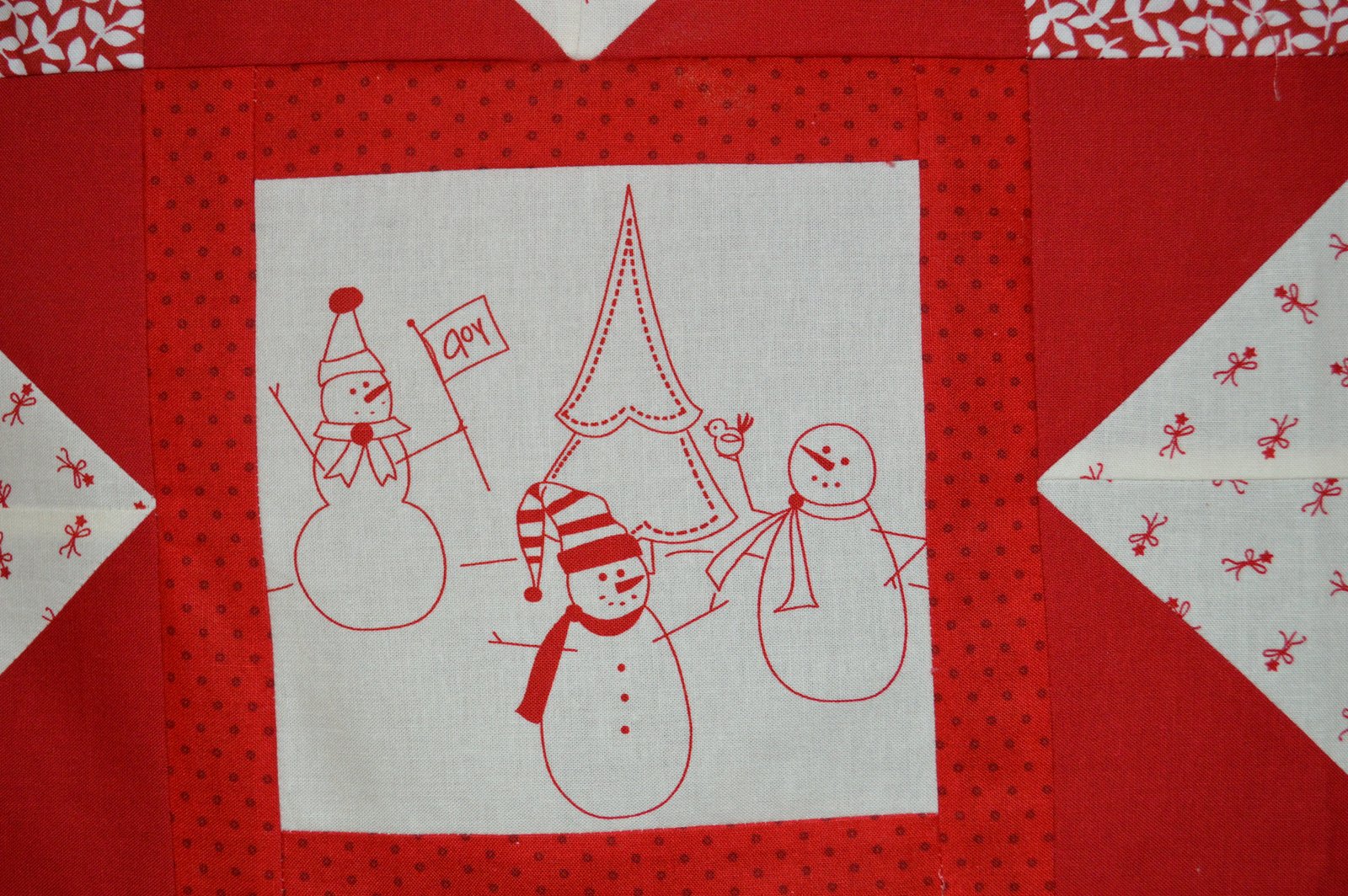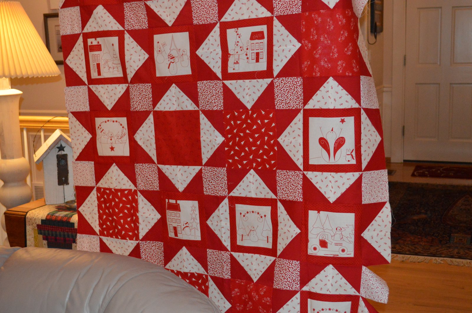 Marsha brought in her WIP - this adorable red and white quilt. Her blocks are from a panel, but they really look like red-work, no? She had us fooled! I used to call this kind of quilt a cheater...but now that I'm old and tired, I have new respect and love for cheaters!