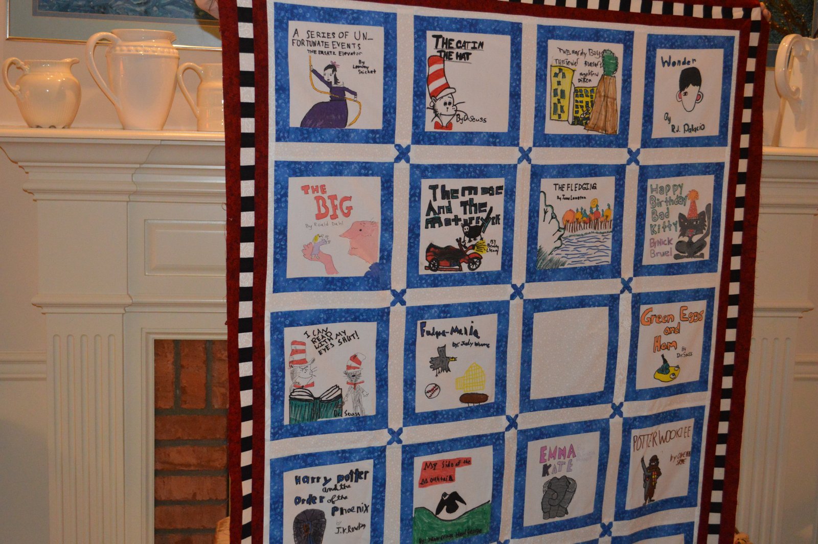Jenny was asked to make a quilt for the school auction - the 4th graders did the artwork and she pieced it together. It's SO cute!! All of the blocks are book titles - unfortunately I wasn't able to get a good picture of the full quilt - I think my camera cut off about three rows! It's wonderful and Jenny pieced those "x's" in the sashing herself! Way to go Jen!!