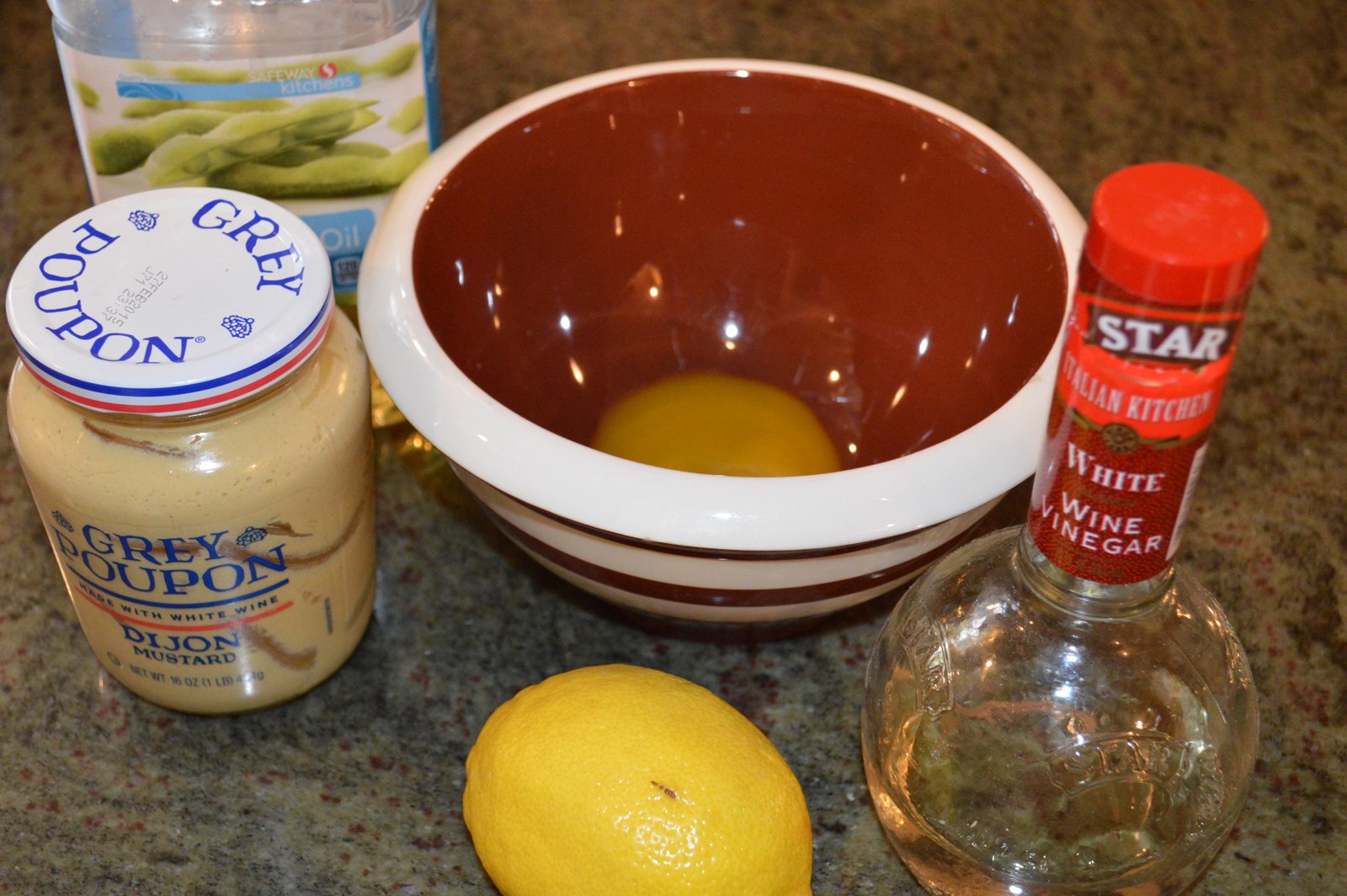 Even though I always have mayo, I could not find any...so I had to make my own. Which, when I think about it, was the right choice all the way around. Homemade mayo is easy and quick to make and it tastes SO much better than the jar stuff. Especially if it's doctored up a bit with minced garlic or capers or olives or jalapeno or just about whatever you can think of! More on that in a minute...one egg yolk, combined with lemon juice, white wine vinegar, a little salt, canola oil and about 6 minutes, is all it takes to make a great tasting mayo.