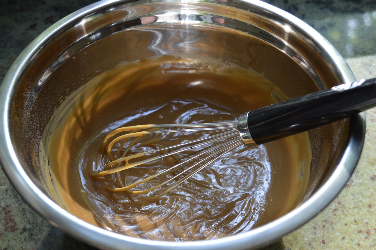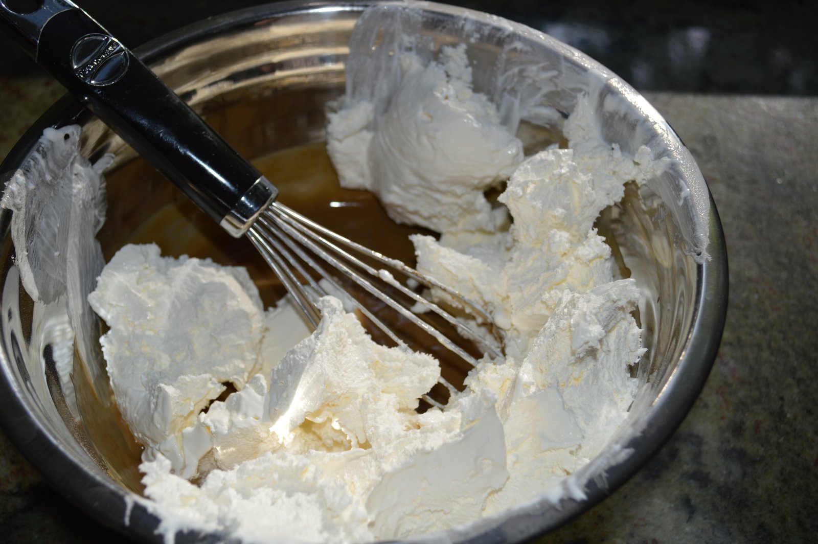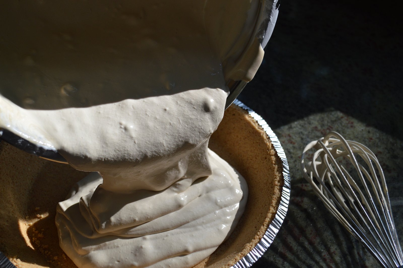After mixing the root-beer, milk, pudding and extract together, the Cool Whip is folded in and the dark root-beer colored mixture, pictured above, changes to a lighter caramel color. The dark color is not from the root-beer itself but from root-beer extract, which has the texture and color of molasses and gives this pie an extra boost of flavor. The creamy mixture is scooped into a graham crust, topped with more Cool Whip and put in the fridge to set.
