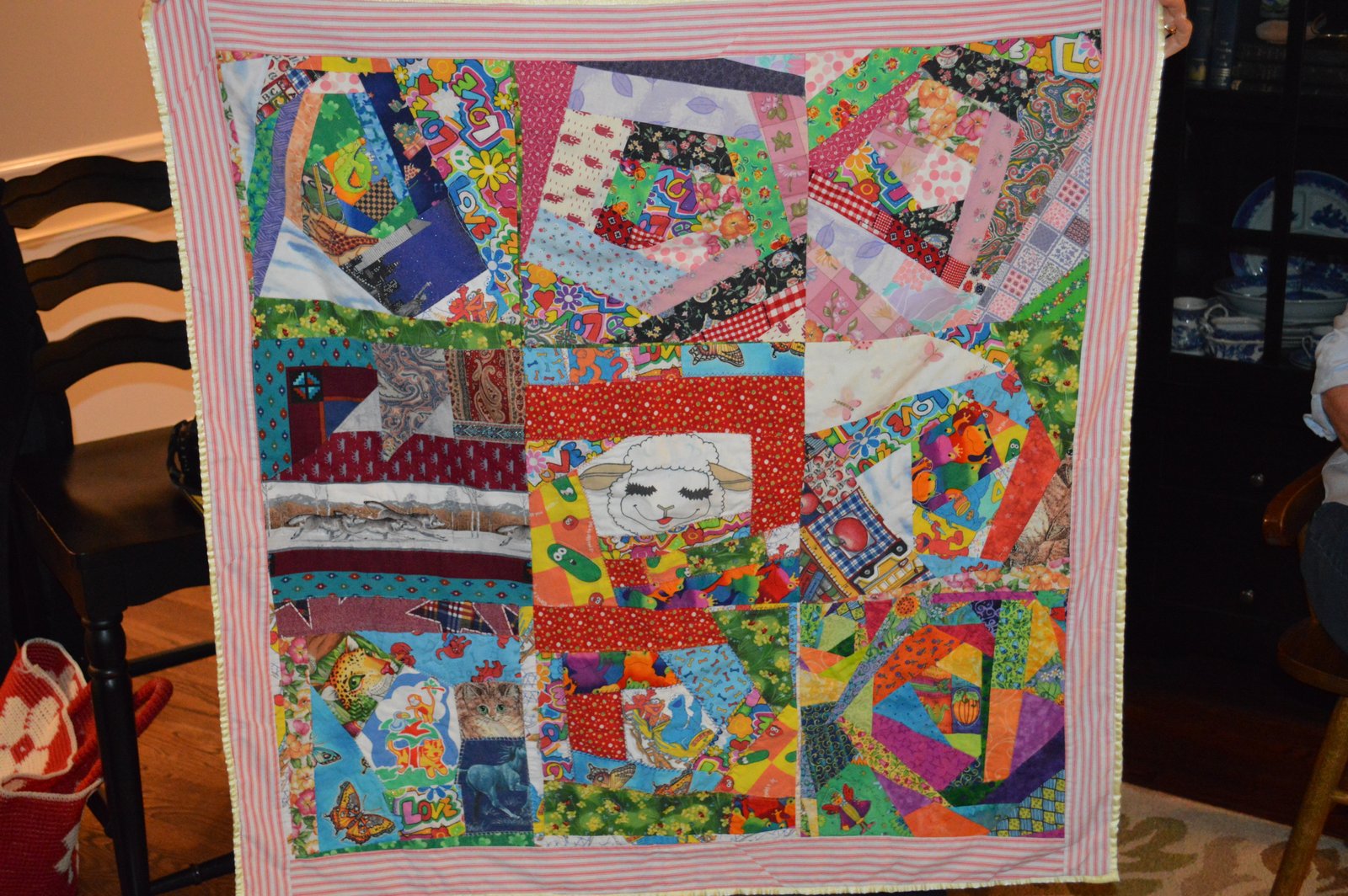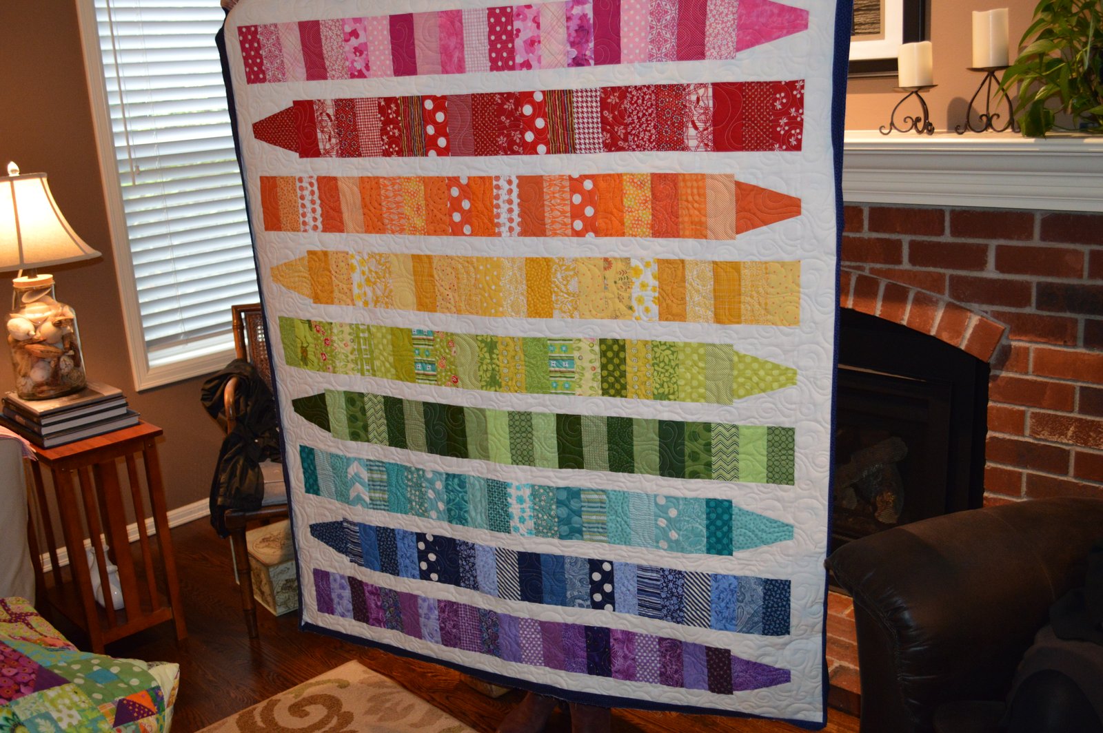 This is the final showing of Kareena's crayon quilt - don't you just love it?!?! We show our quilts in all phases...sometimes we show the first few blocks/strips, then the top before it's quilted and always the finished quilt - we like the encouragement along the way! My Grands would love this quilt - suppose I should make them one!