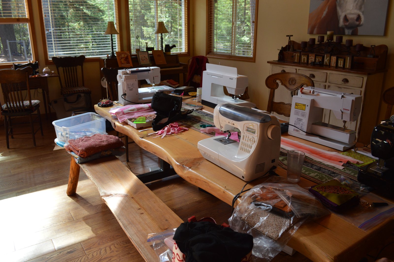 Before we met for our regular quilt group meeting, we had ourselves a little sew day up at Barbara's cabin. We've been to the cabin before to sew, but it's been a while...Barbara and her husband just returned from a two year church mission and we are so happy she is back! When she suggested we have a sew day at her cabin, we jumped at the chance! It was a beautiful drive over Snoqualmie Pass, through the Cascade Mountains where we were lucky enough to see Jack Frost's handiwork - all the leaves had spectacular color! The cabin is a little over an hour drive for us and it's big enough for us to spread out and make messes - which we did, in between the eating and walking outside to see the sights!
