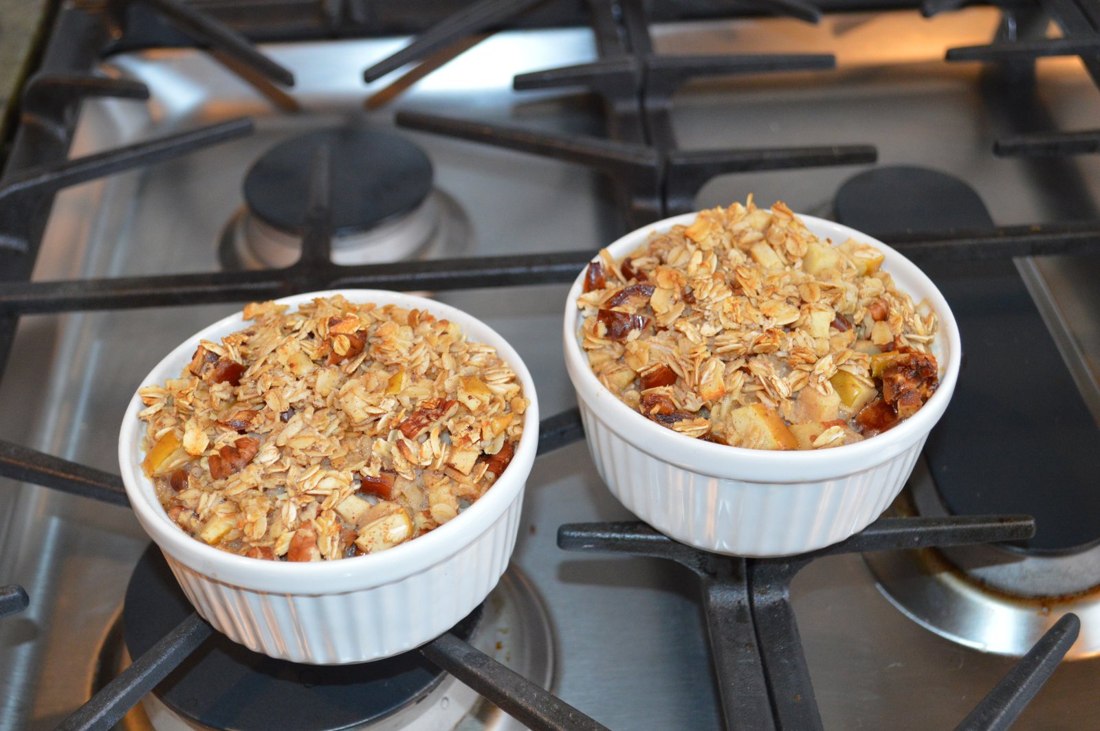 Preheat oven to 350 degrees. Spray two 10 oz. ramekins with cooking spray. In a small frying pan over medium-high heat, toast the pecans until fragrant and just beginning to brown, about 5 to 6 minutes. Remove and set aside. In a small bowl combine the oats, brown sugar, cinnamon, salt, fruit and pecans and mix well with a wooden spoon. Pour oat mixture into the prepared ramekins. Combine the milk and vanilla and then pour into the ramekins, dividing equally. Top each with a teaspoon of butter, broken into small pieces to dot the top. Bake the ramekins until completely set, about 30 minutes and tops have started to brown. Serve warm topped with whipped cream. Serves two.