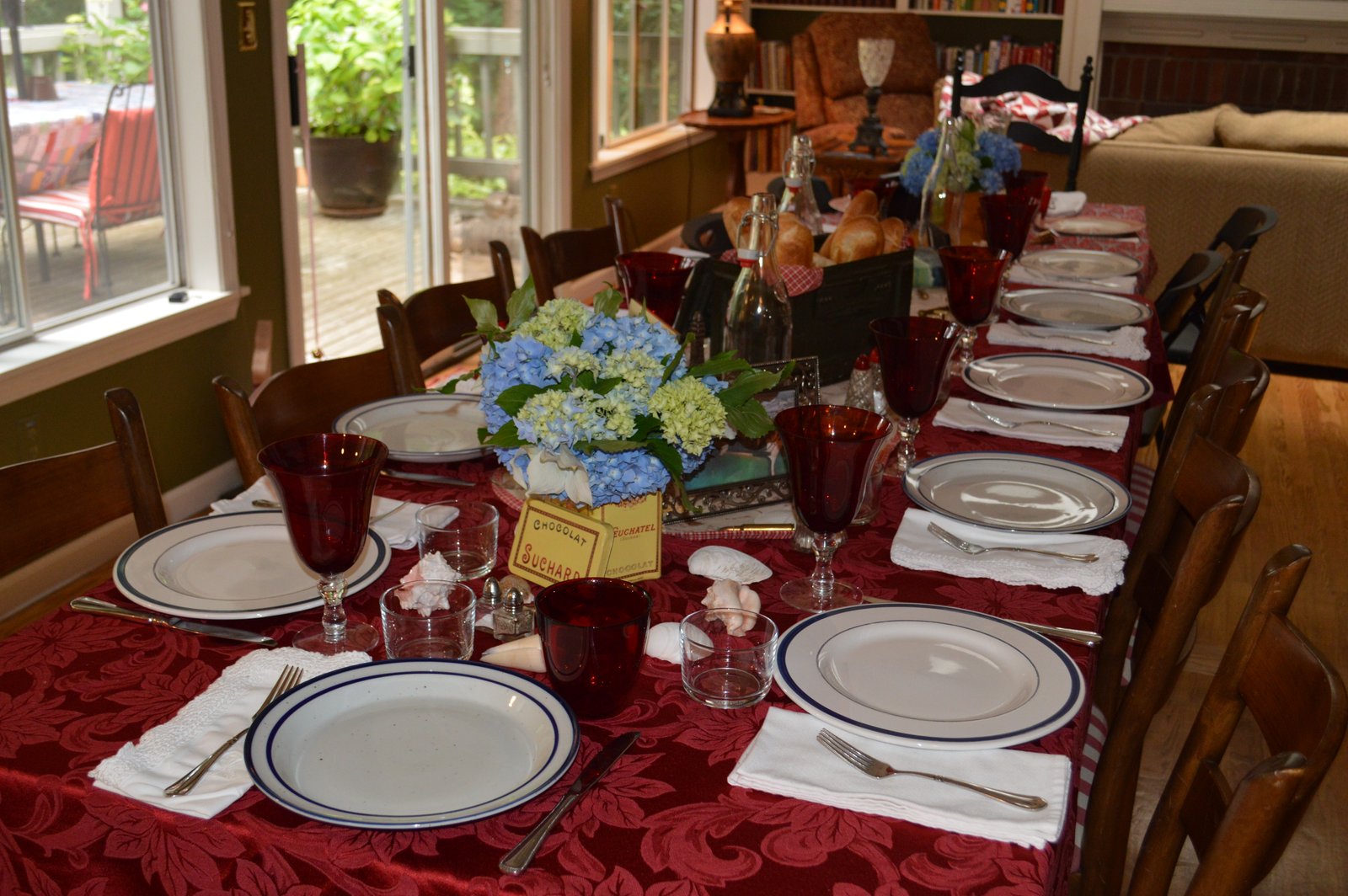 The table was set with France in mind...blue, red and white. Notice the centerpiece? It's a metal WWII Ammo box - the mister and I found it in an antique shop! I scrubbed it with bleach, washed it clean, lined it with red and white checked fabric and then filled it with baguettes.
