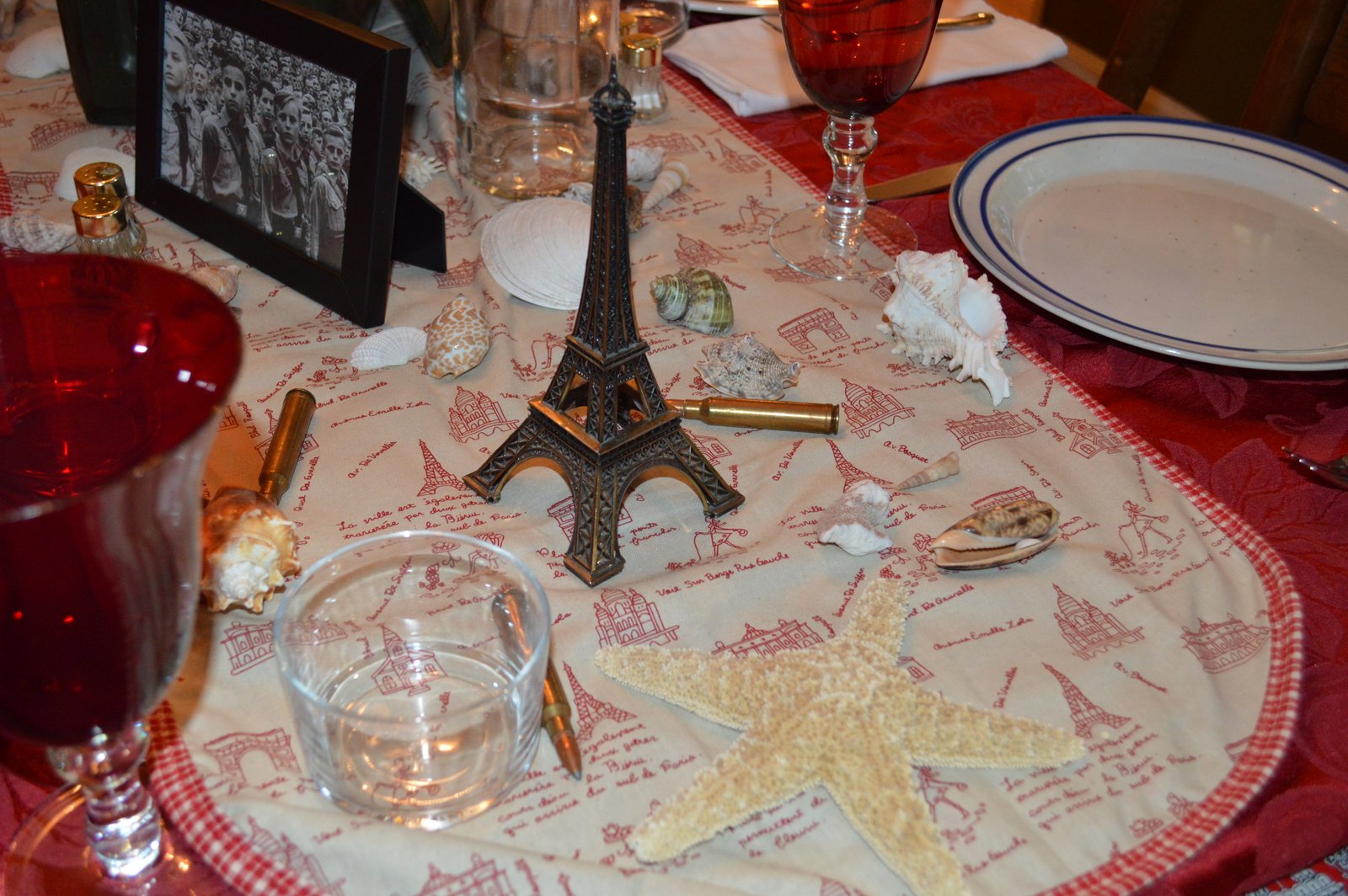 The beginning of the book takes place in Paris, so I once again employed my many little Eiffel Towers...they sat upon a table runner made with French fabric, it has scenes of Paris on it - I had been looking for something to do with that fabric for years! Notice the bullets? That was the mister's touch - he was quite proud of himself for that addition!
