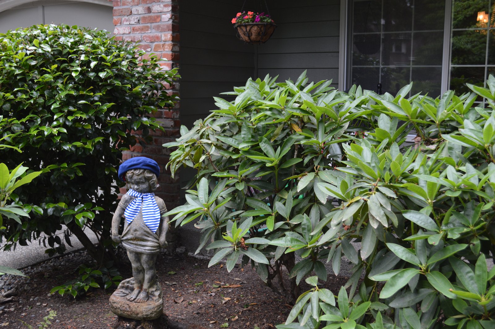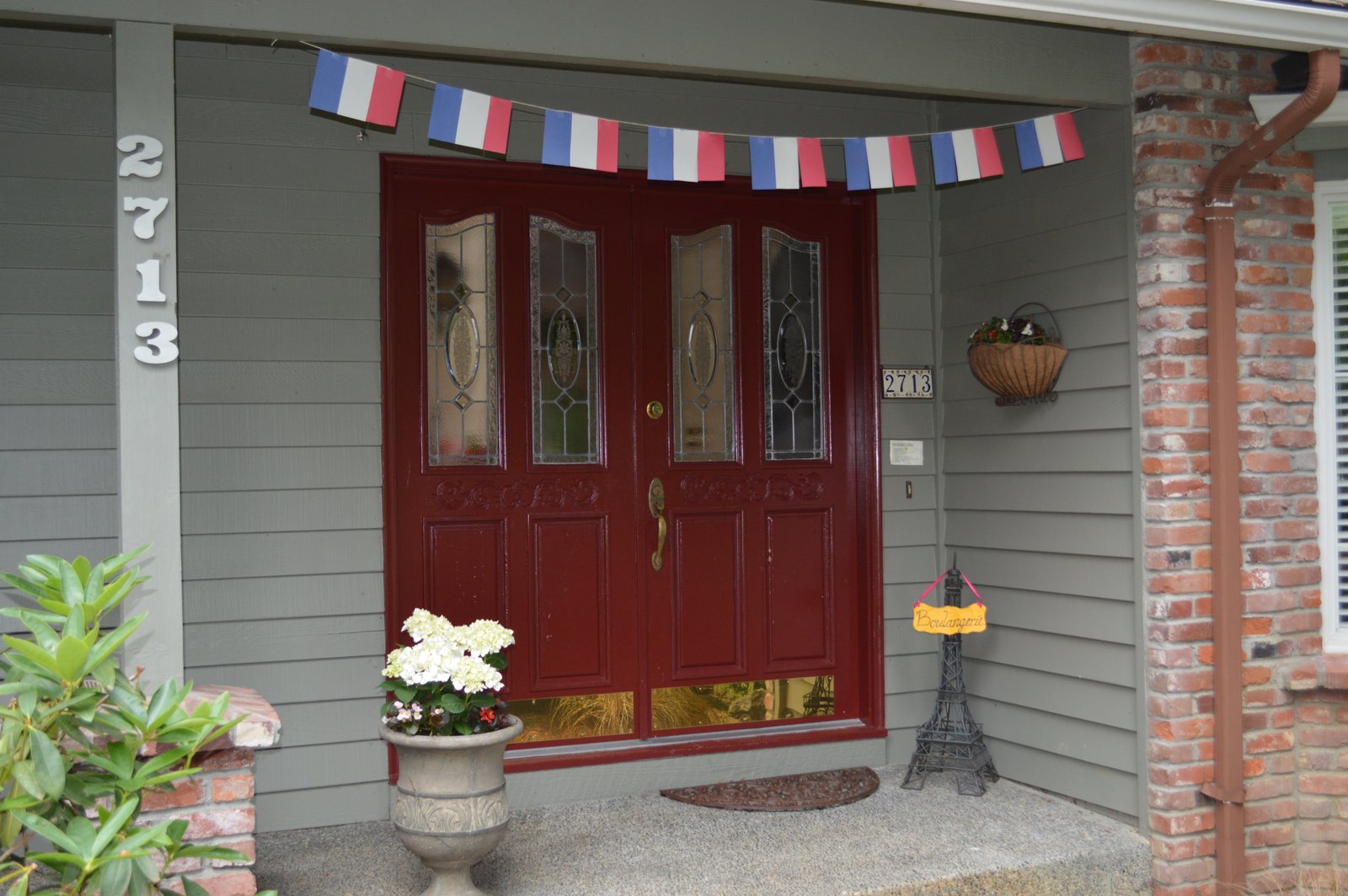 The outside of the villa needed a few decorations, too! My little girl statue donned a beret, I hung French flags over my porch and my big Eiffel Tower was standing sentry with a Boulangerie sign...(Too much? In my defense, I had been cooped up for weeks with my shoulder surgery, unable to do anything but dream up things for this lunch, so when I finally was able to move around a bit, I sort of went nuts!)