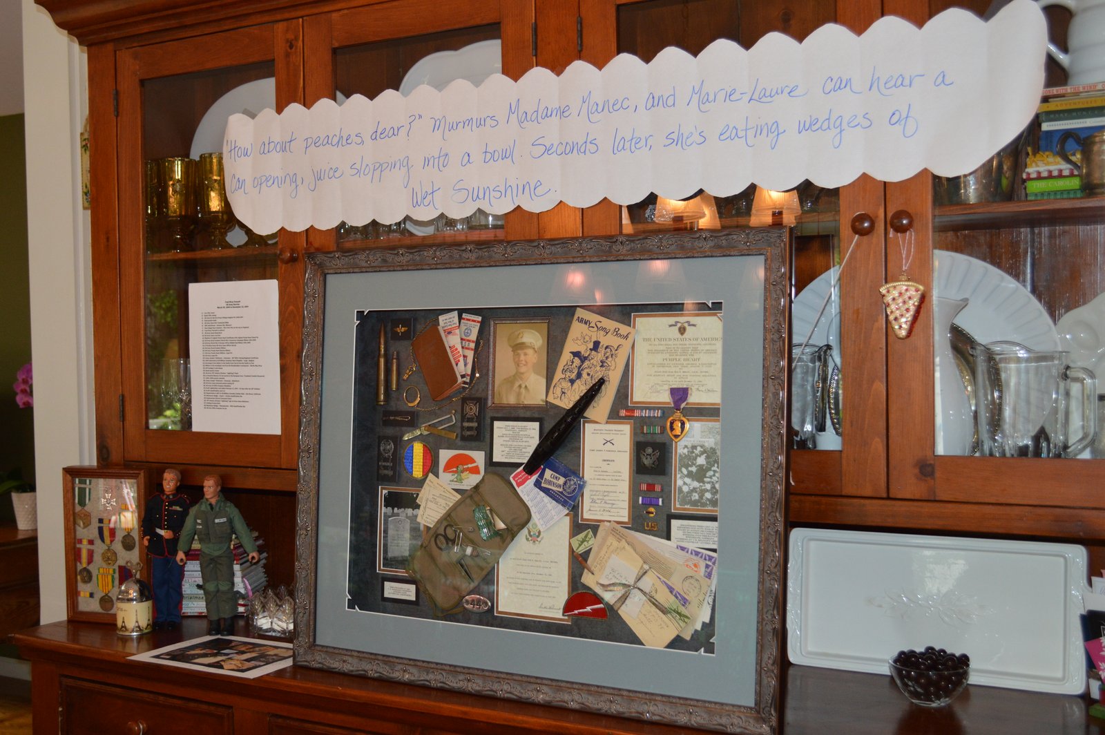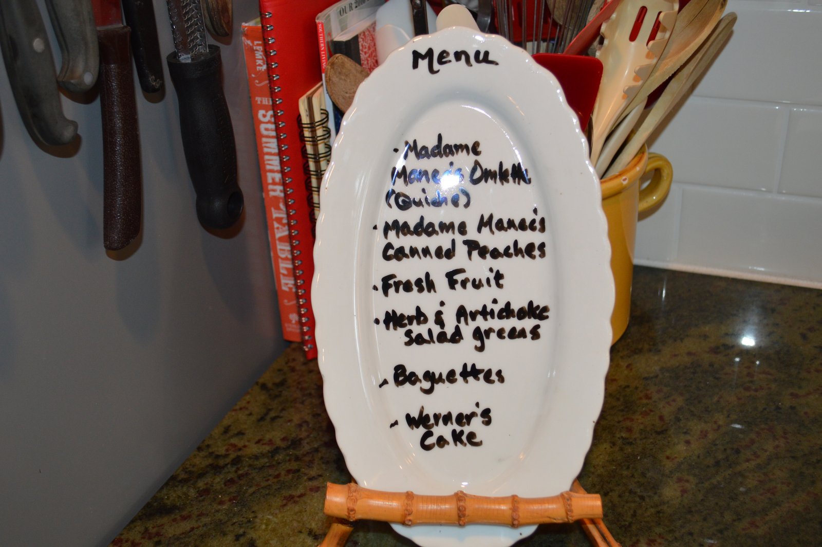 My Sous Chef for the day was my cousin Marsha (Thank you Marsha!) who came ready to chop, slice and dice and she also brought this beautifully framed picture of someone on her side of the family (sorry, too many pills down the hatch, can't remember!) who served in WWII...click on the pic for a closer look, it's pretty amazing! Above the frame is a quote from the book...Marie-Laure, the little blind girl, had been without food for a long time, she and her father were starving when they arrived at their great-uncle's home and were served omlettes and canned peaches...Marie-Laure called the peaches wet sunshine! Of course, I served canned peaches!