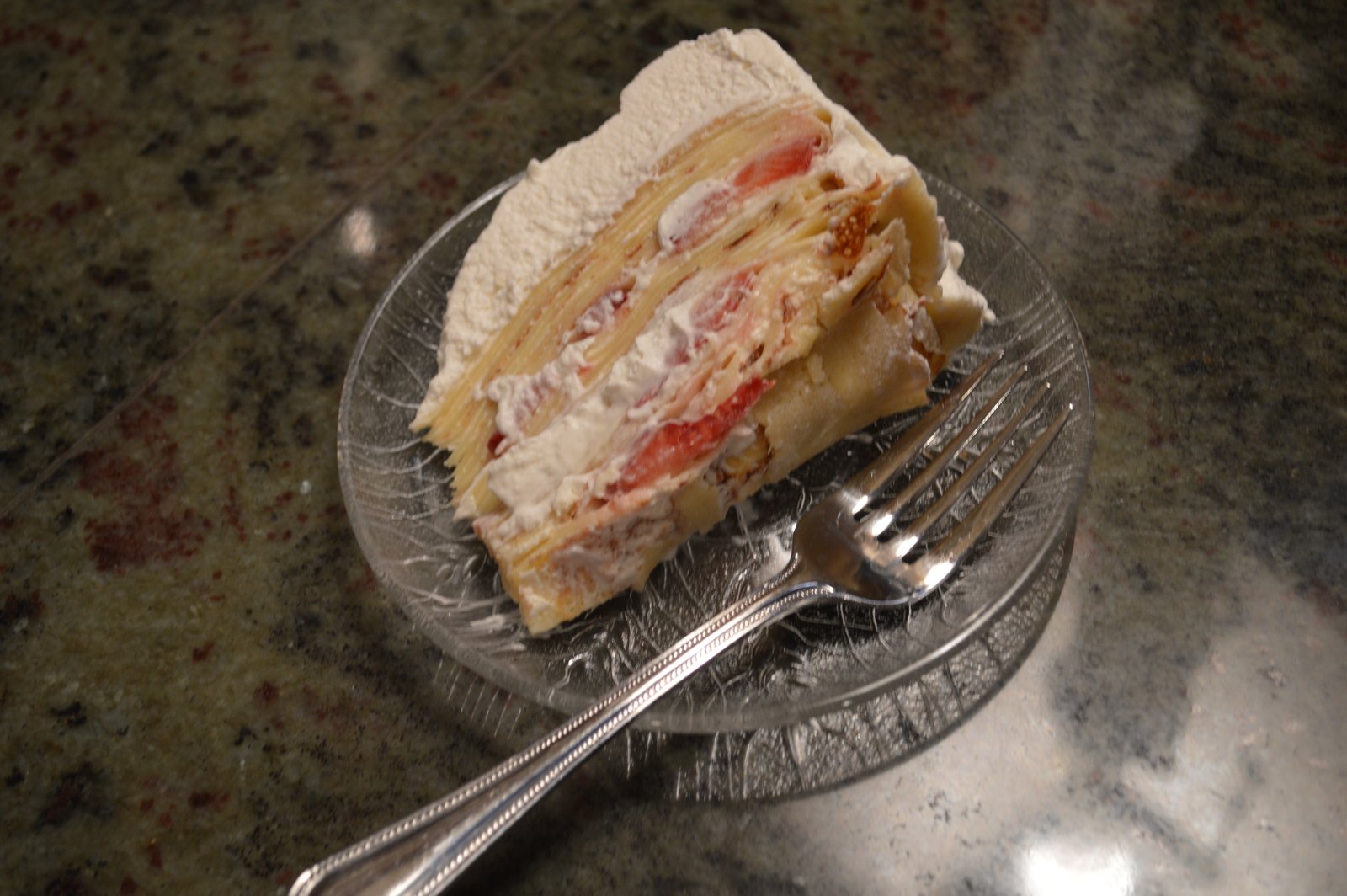 For dessert we had Werner's Cake...the book talks about Werner being served a cake piled high with whipped cream, so in keeping with the French theme, I made Meyer Lemon Crepe Cake - vanilla flavored crepes with a light lemony-cream and fresh strawberries in between each crepe then piled high with whipped cream - it was a thing of beauty! (And this time I used a REAL crepe pan and all the crepe turned out to be the same size - funny how that happens!)