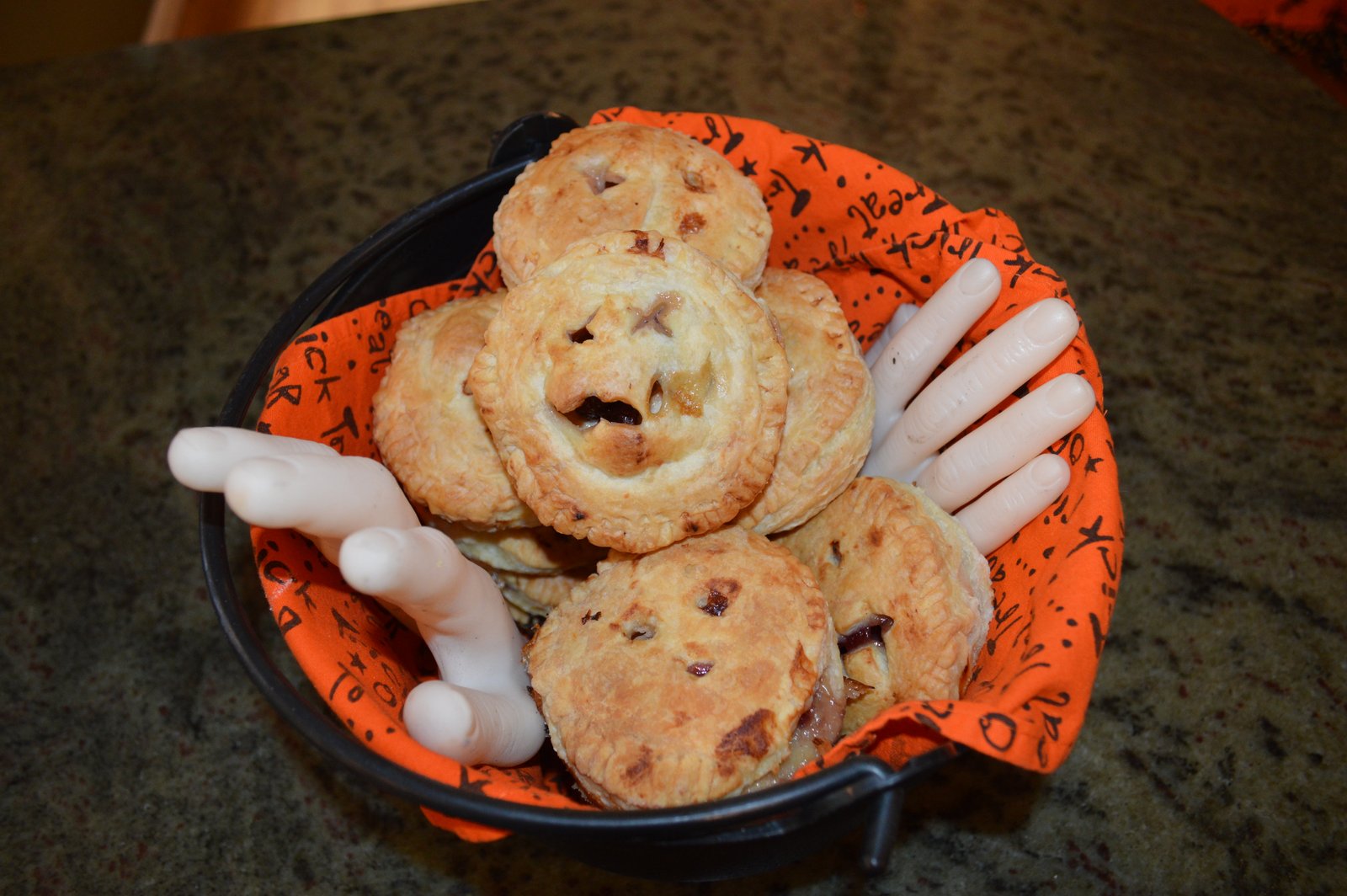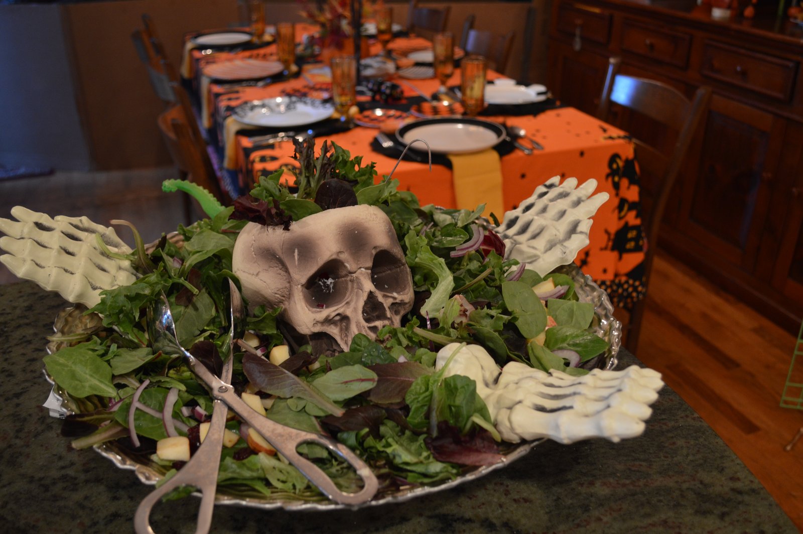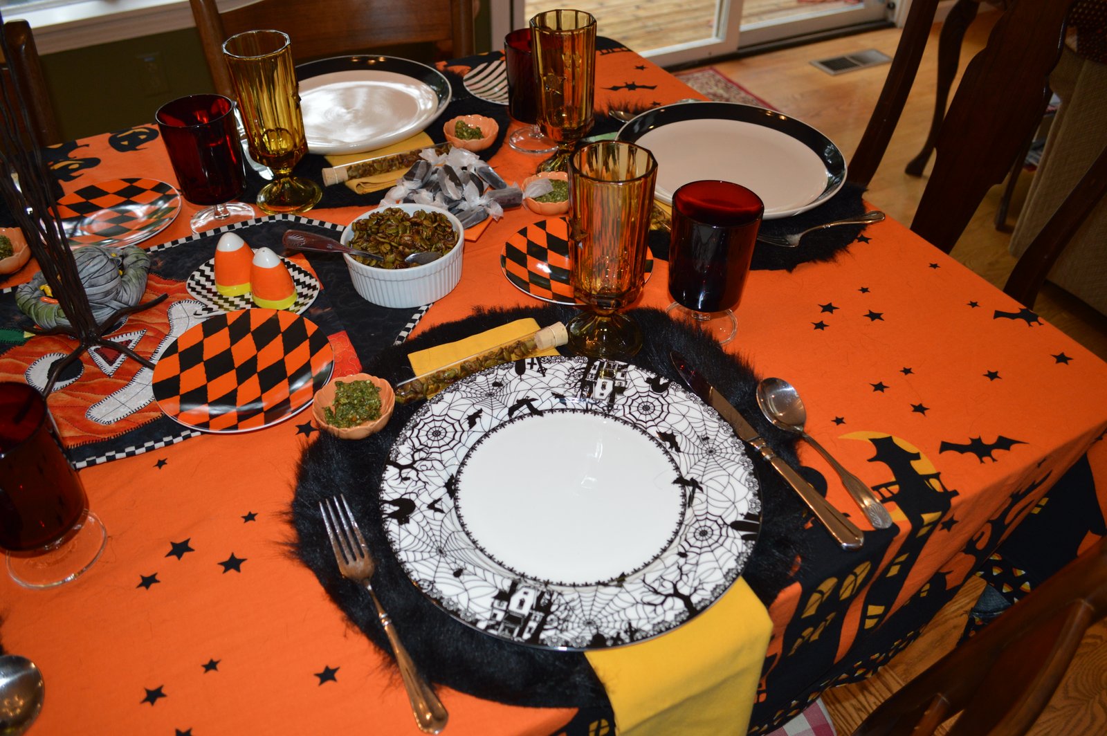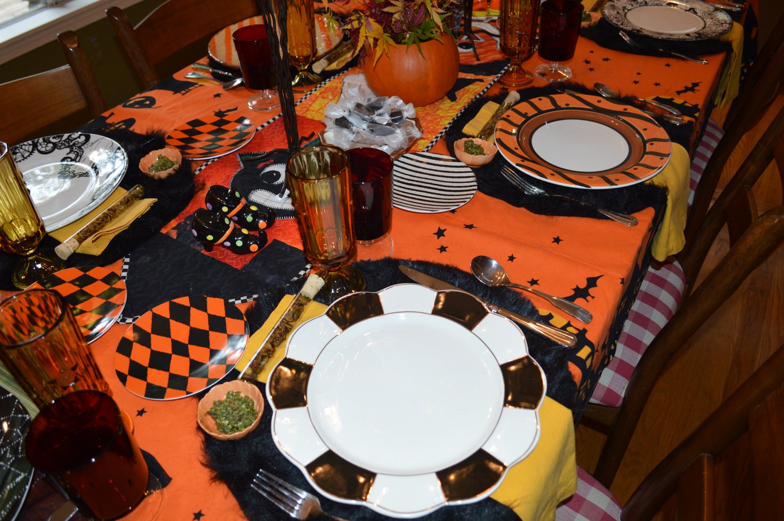 I was fortunate to host our quilt group meeting last week, three days before Halloween, so naturally we had to have a Halloween theme...I set the table with a mix of my old and some new Halloween plates I found at Home Goods (love that store) and I tried to make it festive...it was more like Uncle Fester I know but then it was Halloween!