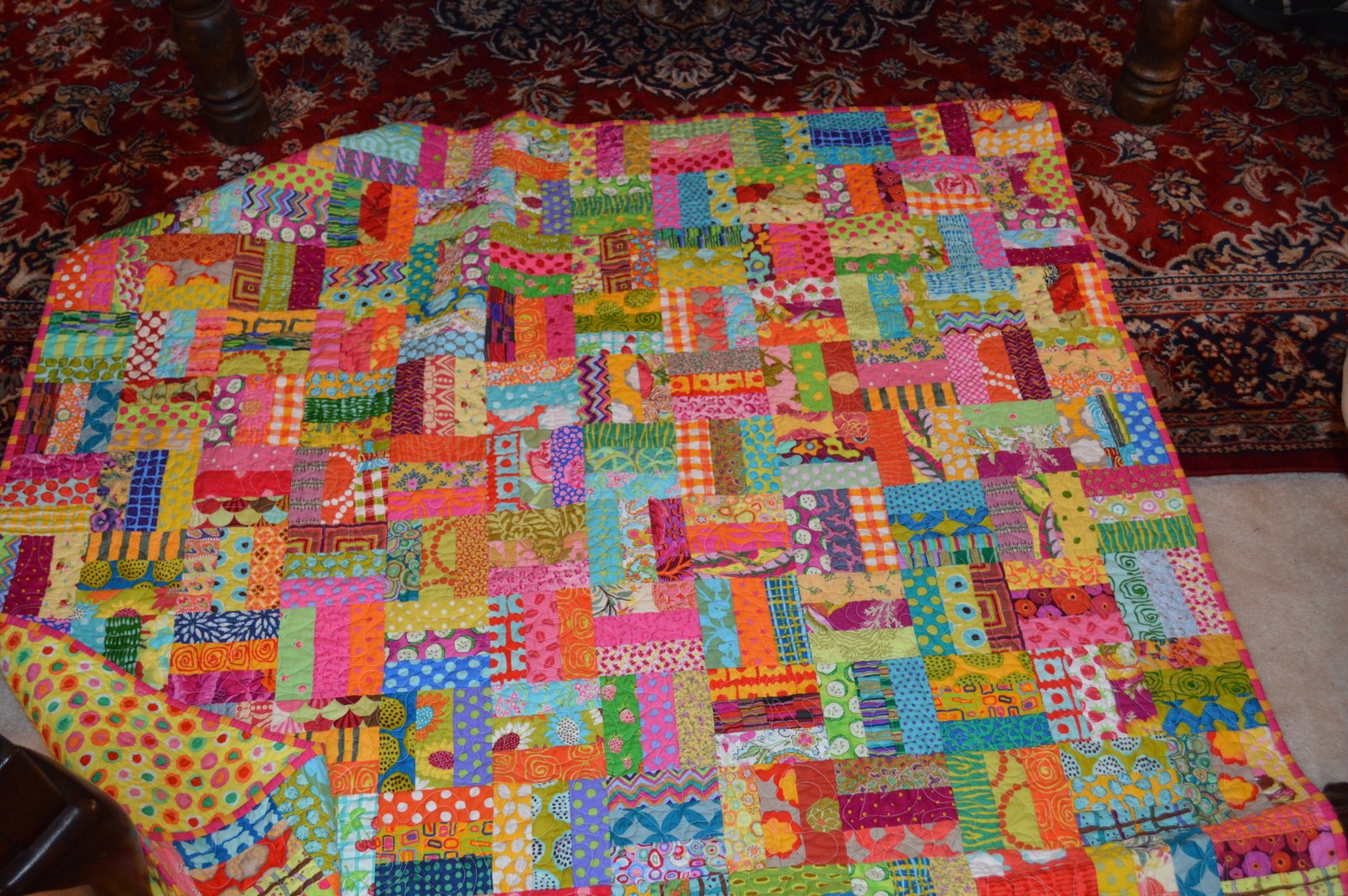 Helen brought another scrap-happy quilt in her "signature" colors! Lest you think Helen is in a rut and can only make a quilt with bright colors, you would be wrong! Helen, like the rest of us, works with colors that make her happy and her colors just happen to be bright and colorful! My colors tend to me more swampy...muted...dull even...I need more color!!