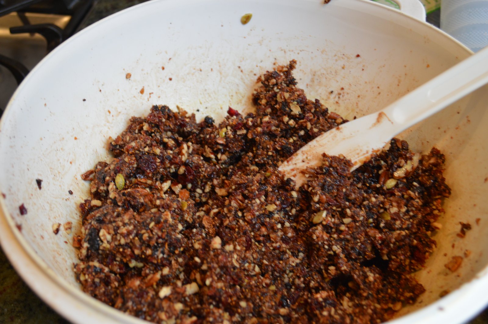 Toasted nuts, dried fruit and of course, figs! That's the basis of these delicious little treats and once everything is whirled about in the food processor, making almost a paste, honey and ground Christmas cloves are added. If you're adventurous you can add Brandy or use brandy flavoring - depending on if you're serving to adults or kids. I used a bag of nuts I had in my pantry that had pecans and pepitas and walnuts, the recipe called for pecans but you can use whatever you want, it's a very adaptable and forgiving recipe! Same goes for the dried fruit...I happened to have dried cherries and Craisins on hand and some dried dates so I used them with the dried Mission Figs and they worked beautifully!