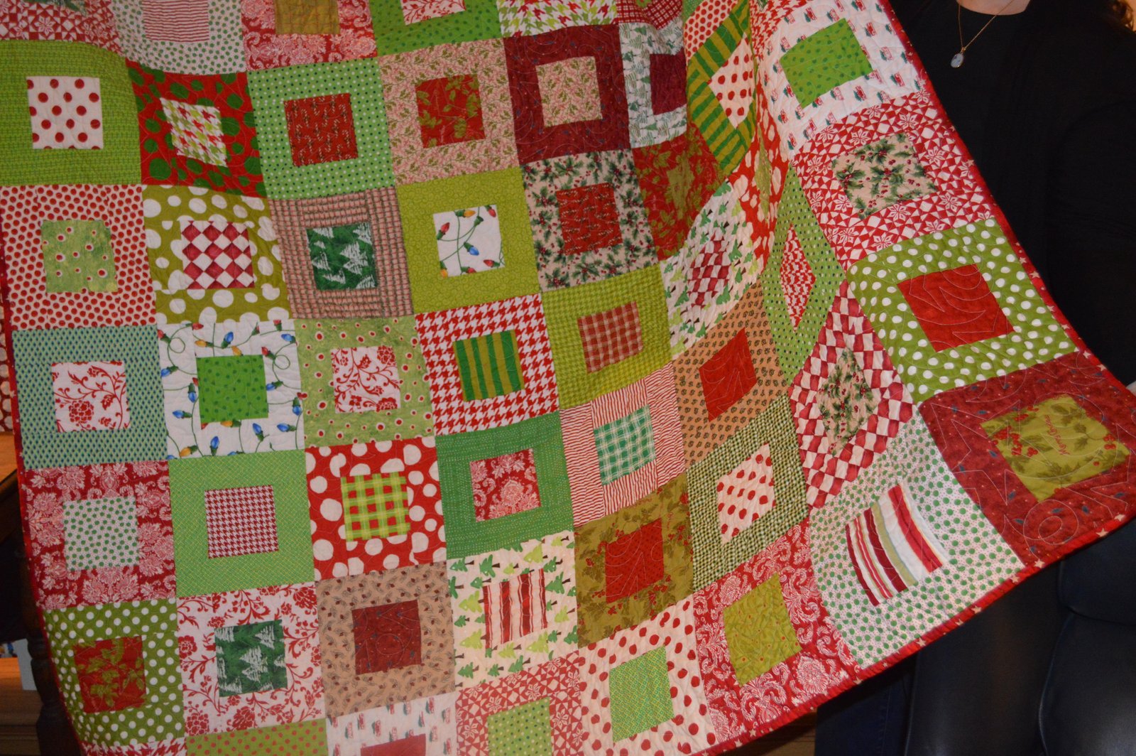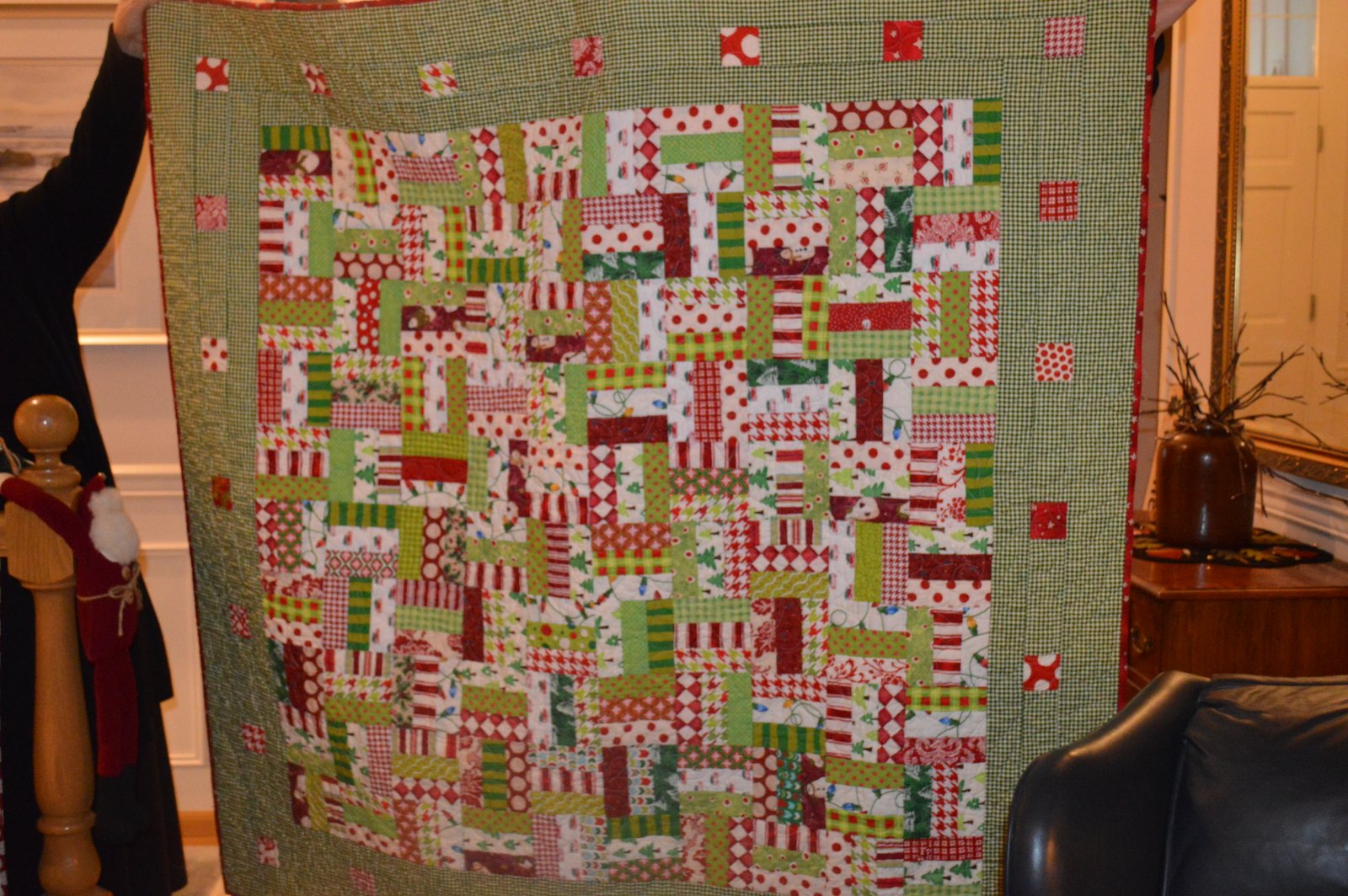 That would be Helen's arm holding up her quilt...love that I was able to capture that! As you can tell, I've been working on my photography skills! Hahahaha...I'm just lucky to remember my camera and all I know it "point and shoot!" Okay, this quilt - another simple pattern, the rail fence - but the fabrics give this quilt movement and really set it apart from any other rail-fence I've seen! Helen just recently finished this one and even though our meeting was at the end of January, Christmas was still "up" and it was SO FUN! Everyone should leave Christmas up until Valentine's Day...if I ran the world that would be my first decree!