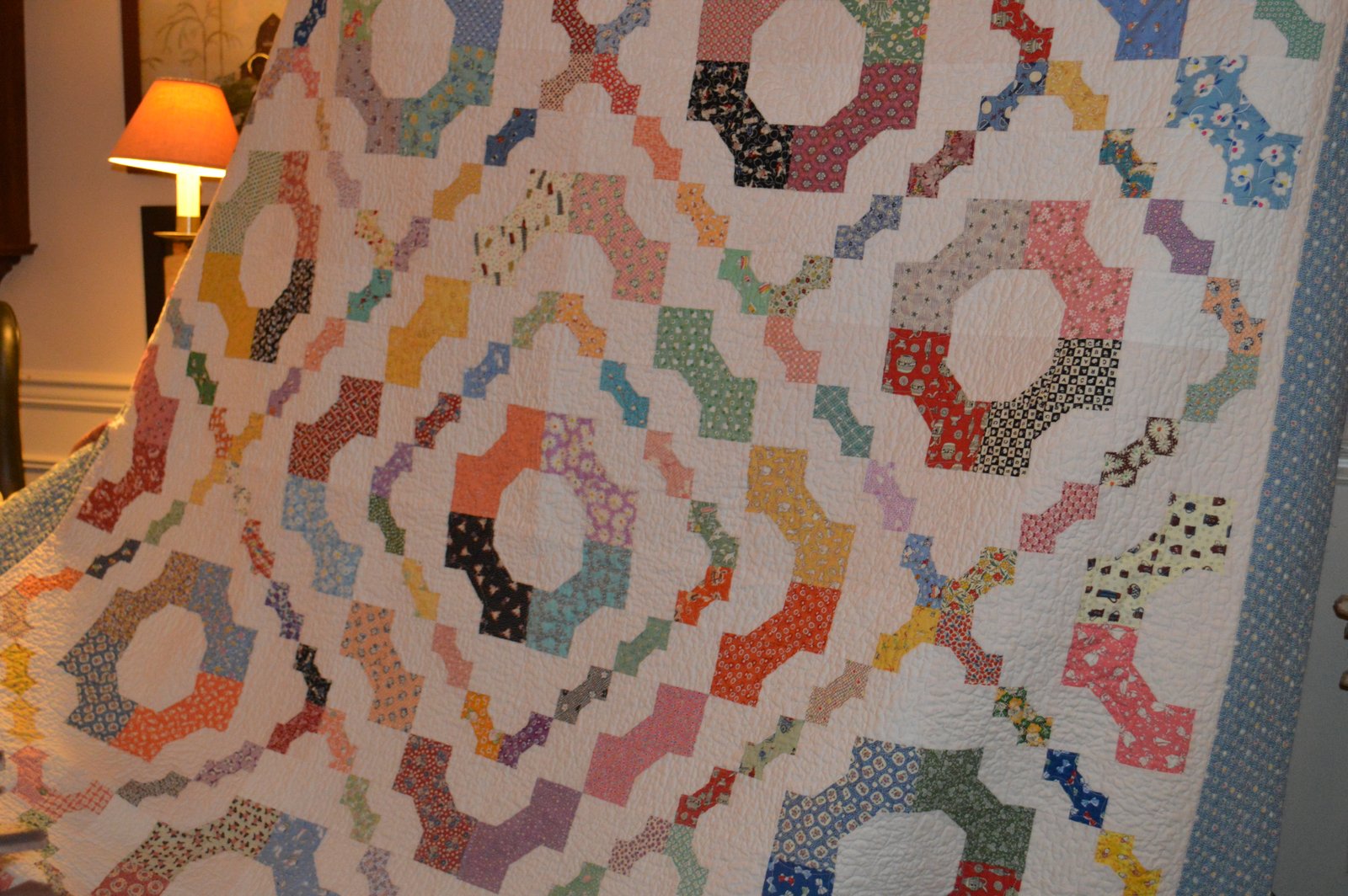 This quilt should be called Jenny's Jealous Quilt. Jenny bought it at a thrift shop for $40. Did you read that right??? FORTY BUCKS!!! And this is a NEW quilt! It is beautifully pieced with Aunt Gracie fabrics and the quilting is wonderful. Someone definitely fell down the rabbit hole and hit her head, because they could not have been thinking clearly when they gave this beauty away! I'm definitely jealous of Jenny, her timing, good fortune and luck to be at the right place at the right time to snag this amazing quilt!