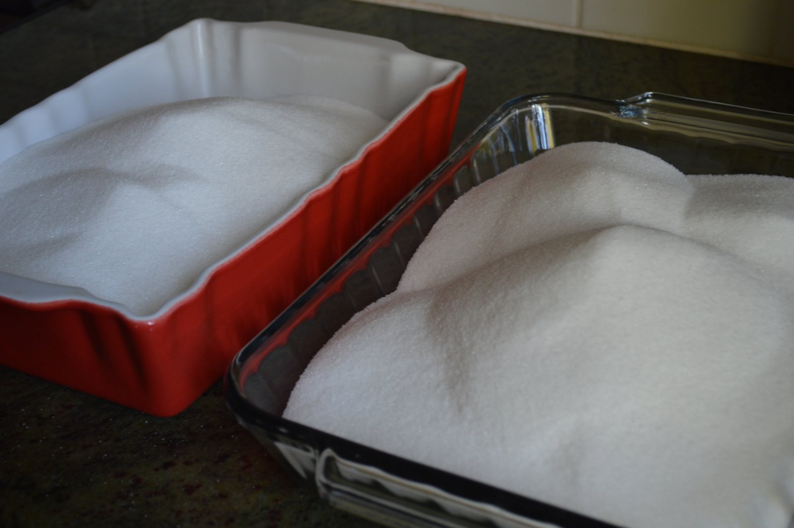 9 cups (4 lbs.) refined white sugar (This technique will not work with raw or semi-refined cane sugar, as its natural molasses content will begin to melt at much lower temperatures, causing the sugar to clump.)
