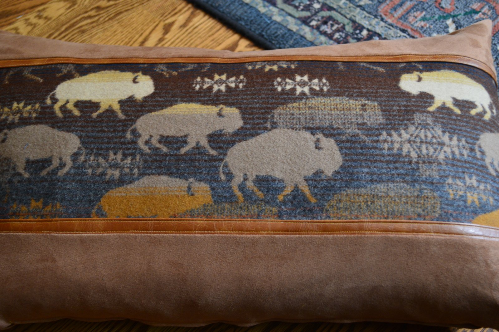 This is a pillow Diane made...she bought the panel and then sewed on the leather and suede -this is one of two. Very clever, cool, completely wonderful. Diane hosted us and she served us a wonderful lunch, it's always fun to go to her home!