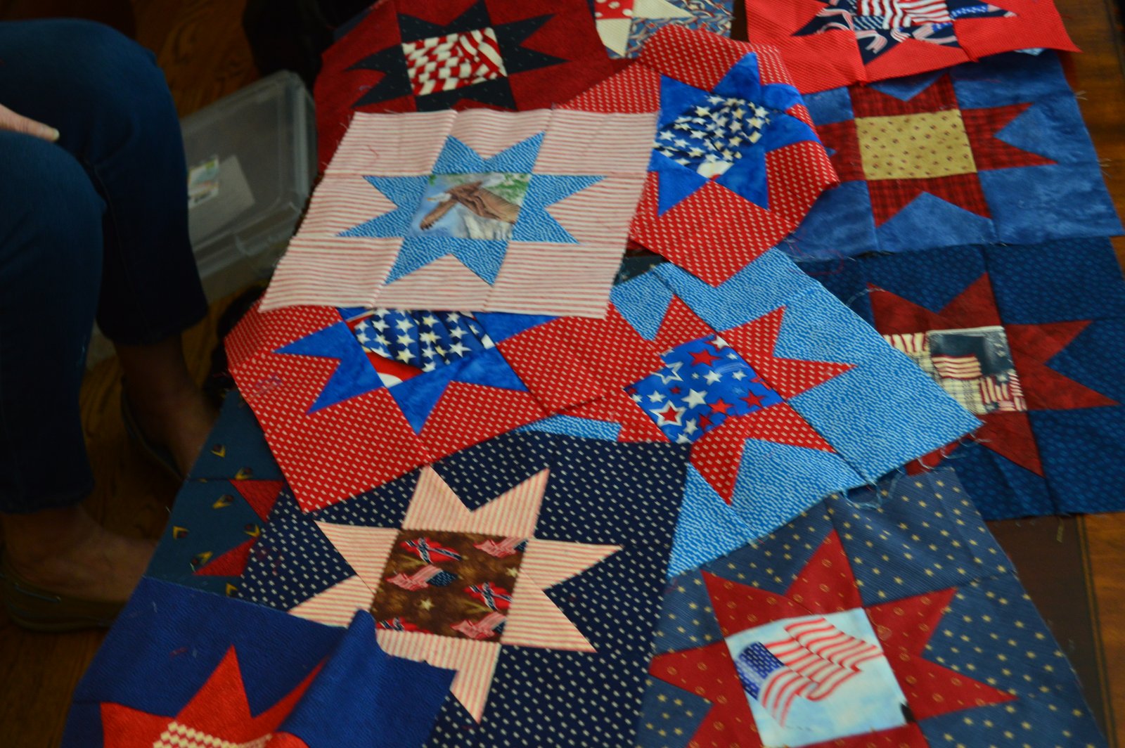 Diane showed us a tutorial on Missouri Star Quilts for a new way of making stars - it's very interesting and if you haven't seen it, watch it, you'll be as impressed as we were! Here's the link: Stars and Stripes Quilt Tutorial Our group is making a different star, however, which is our new project for American Hero Quilts. The star we are making is pictured above and it's from Cluck Cluck Sew, here's the link for her tutorial: No Point Stars. Cluck Cluck Sew's pattern is great because you can trim the block down to whatever size you want, without losing the points! Who knew?!? When we get enough star blocks we will sew them up into a quilt and give to American Hero Quilts.