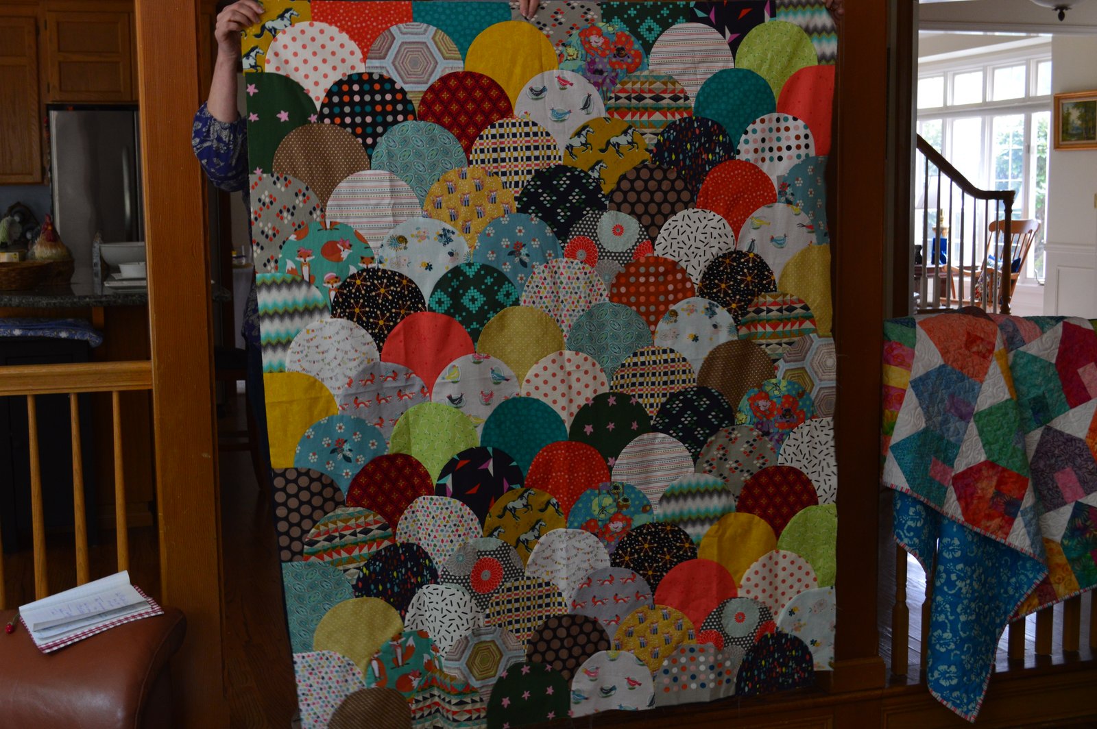 That's Barbara's arm holding up her latest quilt, called Clamshells. This picture doesn't show the true colors, it's much happier in person! This looks like so much work to me - anytime there's a curve it has to be pinned and y'all know I hate pinning! But Barbara assured us it was easy...maybe for her! Looks at all those fun fabrics!!