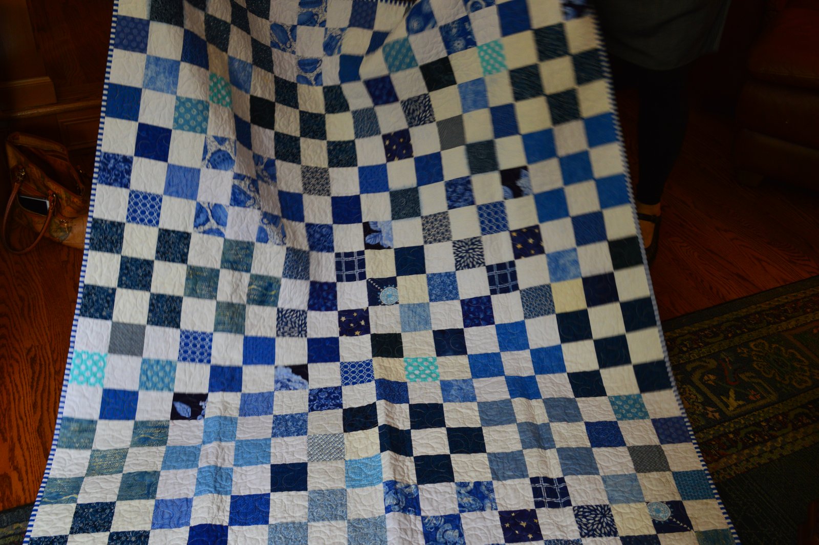 Terry very generously volunteered to sew together the blocks our group made and then she quilted and bound this quilt. It was headed for donation to our favorite charity but when I told the group about a dear friend who has some serious health issues and asked if we could give it to her, it was unanimous, they all instantly said yes. I took the quilt to my friend, who is also friends with many in our quilt group and when she saw it she cried happy tears and immediately covered herself with the quilt. I've been to visit her several times and each time she's had the quilt over her. Hopefully she knows it was truly stitched with love.