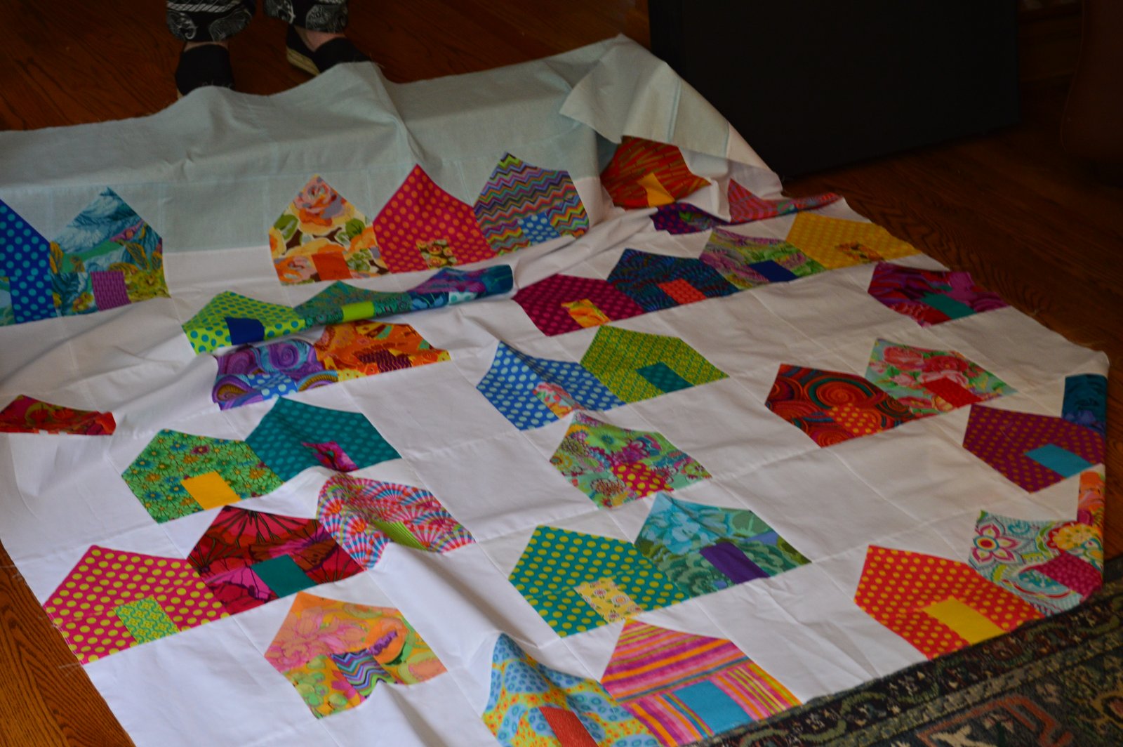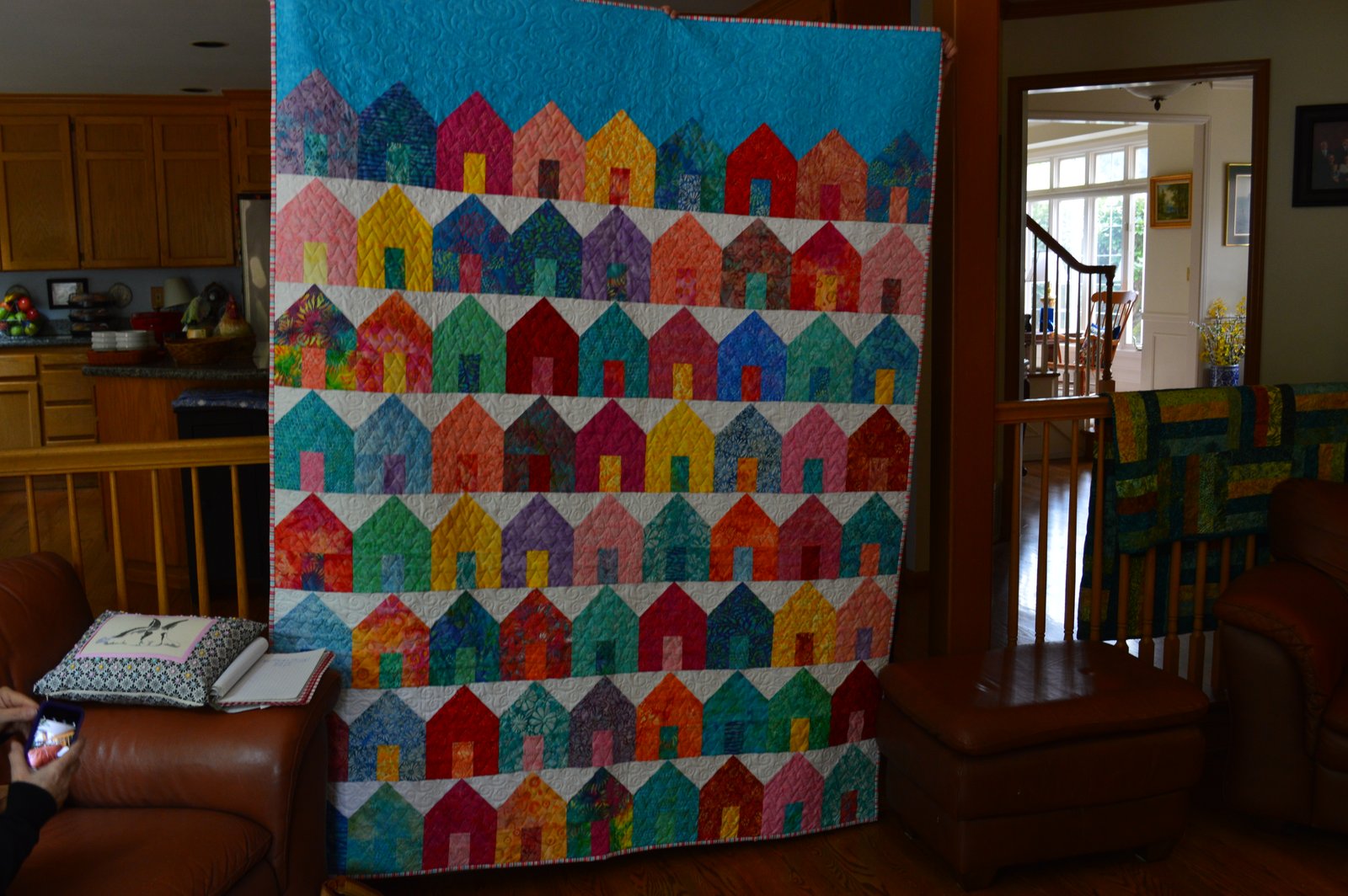 This is Diane's house quilt - pretty dang wonderful! I love the blue at the top and the white fabric behind the roofs - it makes all of the houses really stand out. We had a bit of discussion about "white" in quilts - I'm all for it, I like that the white shows off the other fabrics. I really need to get my house quilt done! Oy vey.