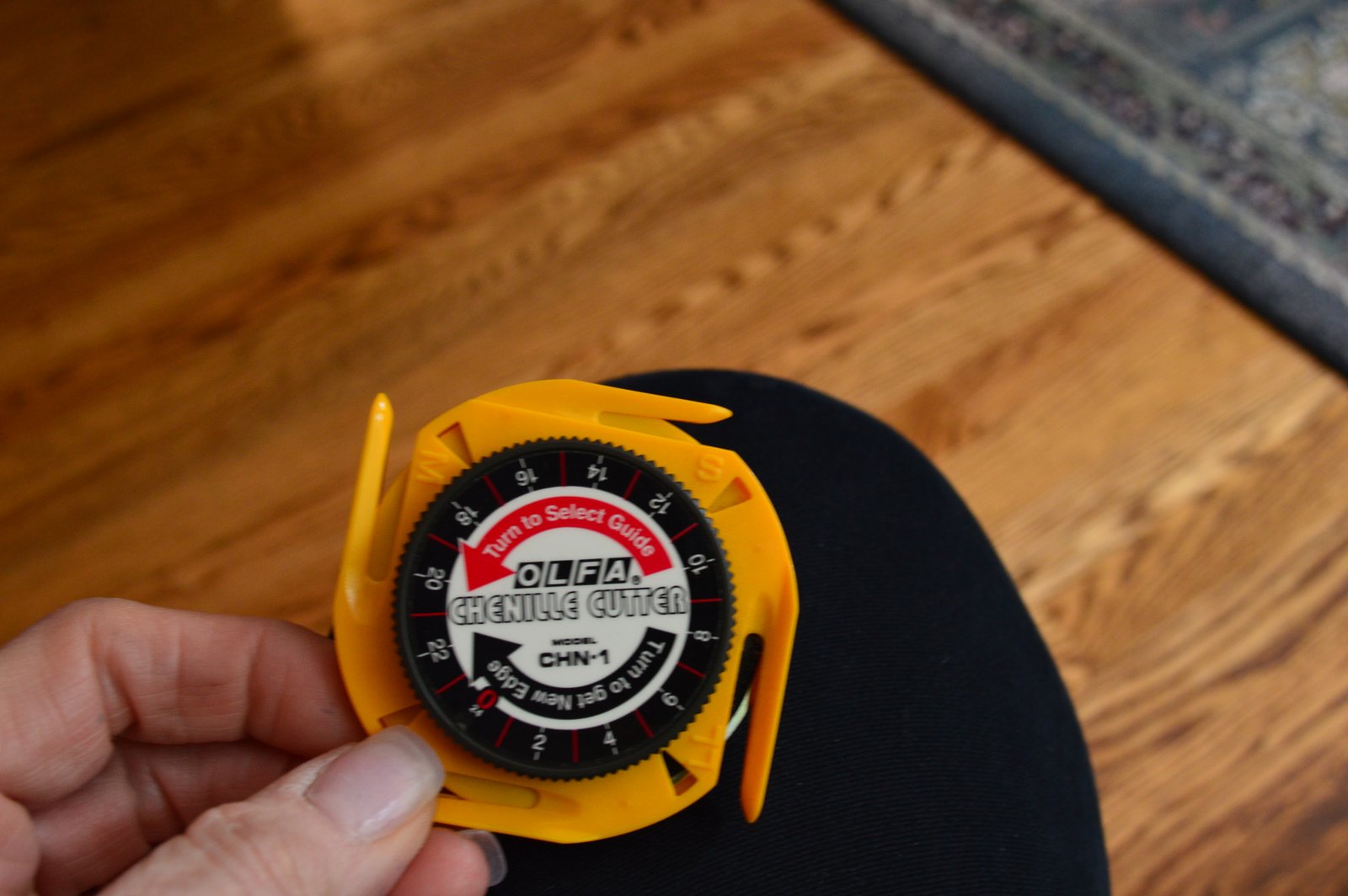 That's my hand holding the Chenille cutter that Janet used to make her pillow..it slips under the layers of fabrics and cuts them, without cutting through the bottom fabric - pretty cool! Who thinks these things up??