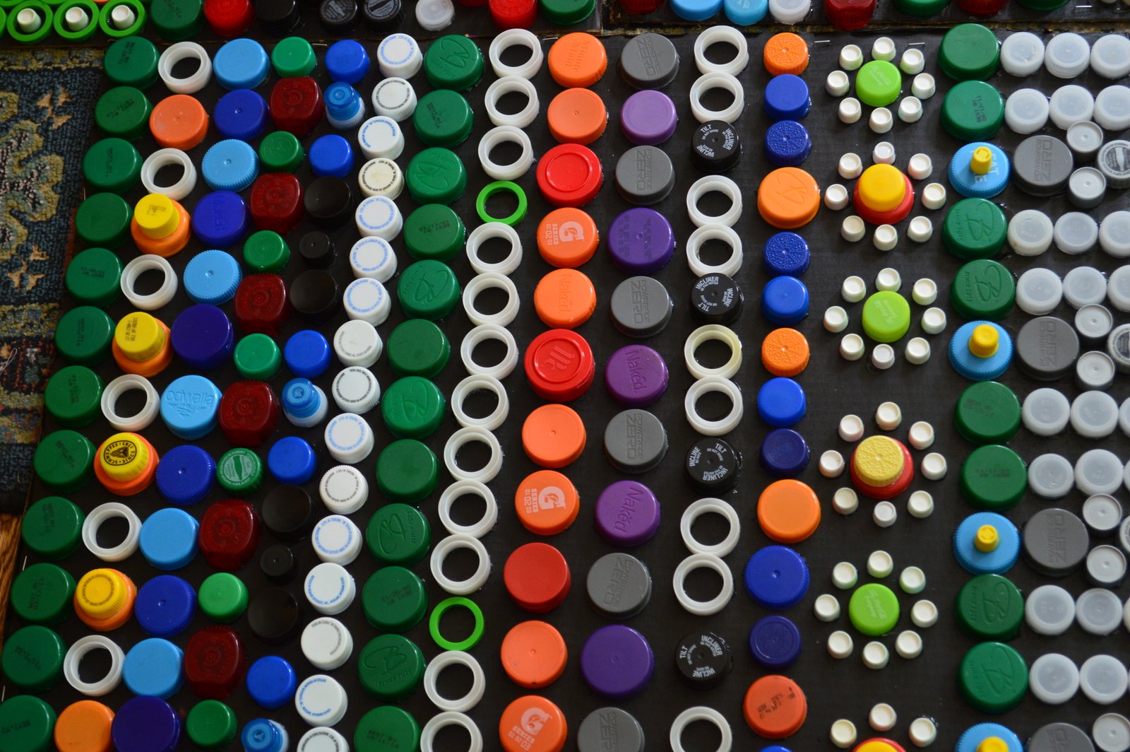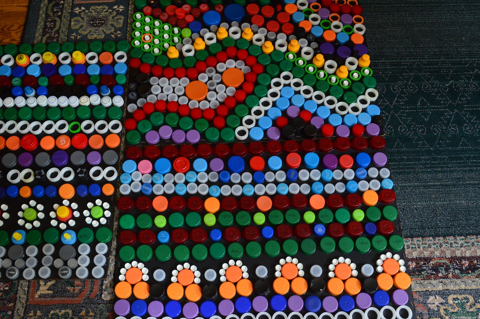 Speaking of thinking things up, Stephanie has been collecting bottle caps for quite a while - she had enough caps for her art class students to make these incredible pictures/bottle cap paintings! Who would ever think of doing something like this?!?! Pretty cool, no?