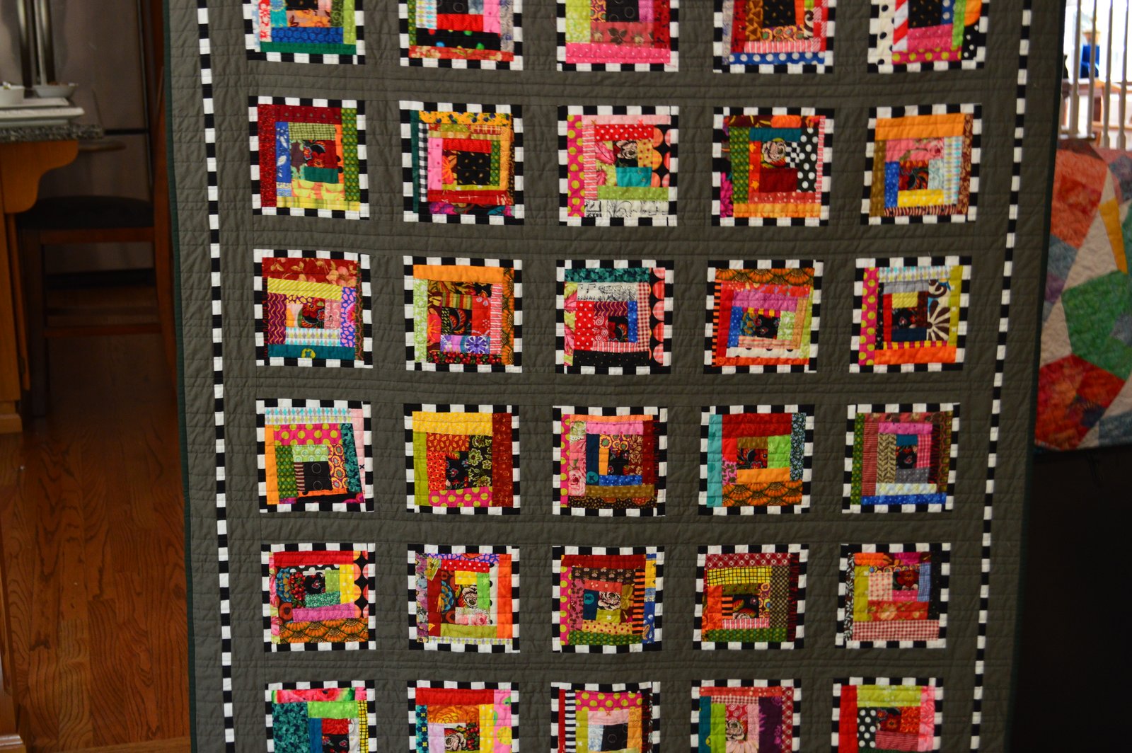 Stephanie's scrap quilt is officially done - quilted and bound - and it's wonderful! Let me remind you that those blocks are made from scraps that people were going to throw away! Stephanie rescued them and made this fabulous quilt...I'd like to say I now save my scraps because of this but...